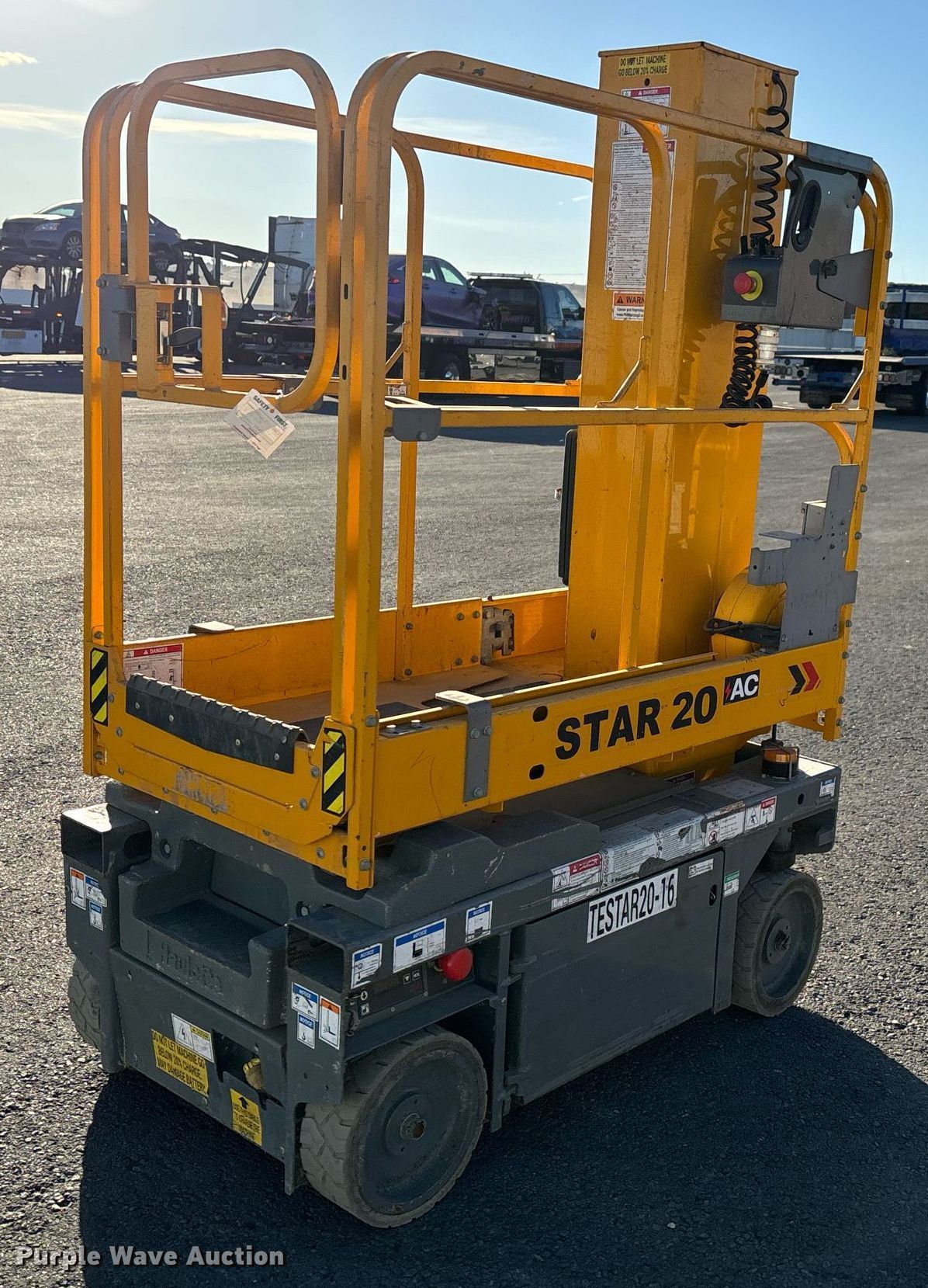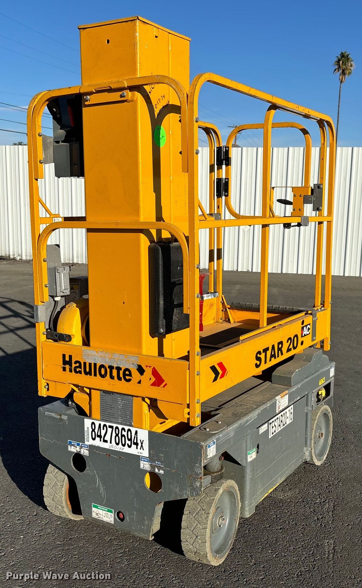 Purple Wave is selling a used Scissor or Vertical Lift in California. This item is a 2019 Haulotte Star 20 AC E vertical lift with the following: Hours: 70 on meter, Serial: 2068272, Unit #: TESTAR20-16, Lot #: 84278694