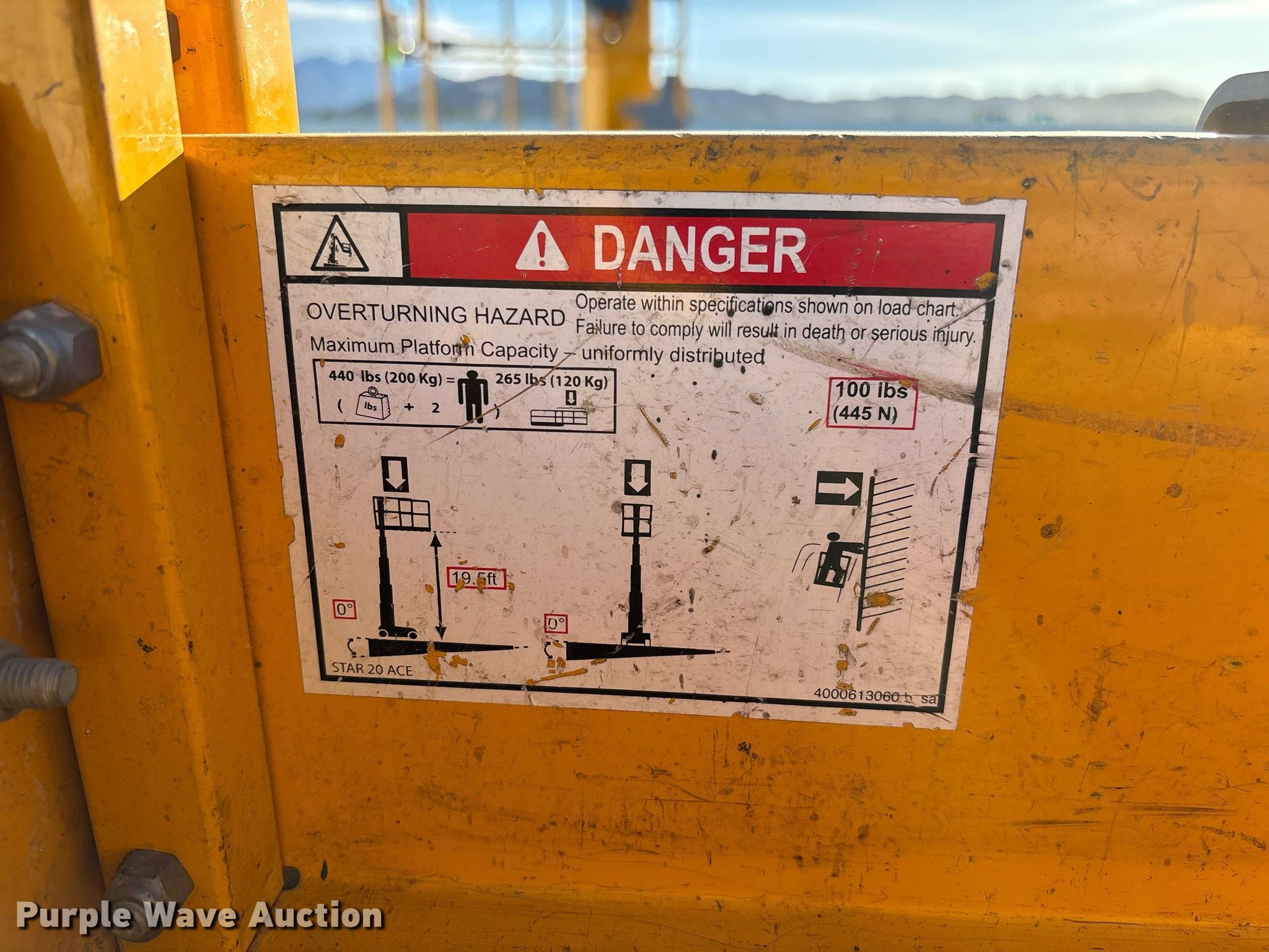 2019 Haulotte Star 20 AC E vertical lift. Hours: 70 on meter, Serial: 2068272, Unit #: TESTAR20-16, Lot #: 84278694. Electric Motor Volts: 24. Features Maximum lift capacity: 440 lbs, Maximum lift height: 19' 6", Platform: 54" L x 26" W, AC power outlet, Controls: Remote Control, Ground, Platform rotation: Manual, Safety alarm. Tires Tire size: 12.5x4.25, Solid. Secured storage hosted by a Copart facility. Please review REQUIRED REMOVAL INSTRUCTIONS. Trinity Equipment Rentals Inc.. Mentone, CA 92359