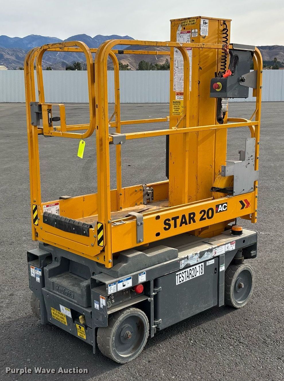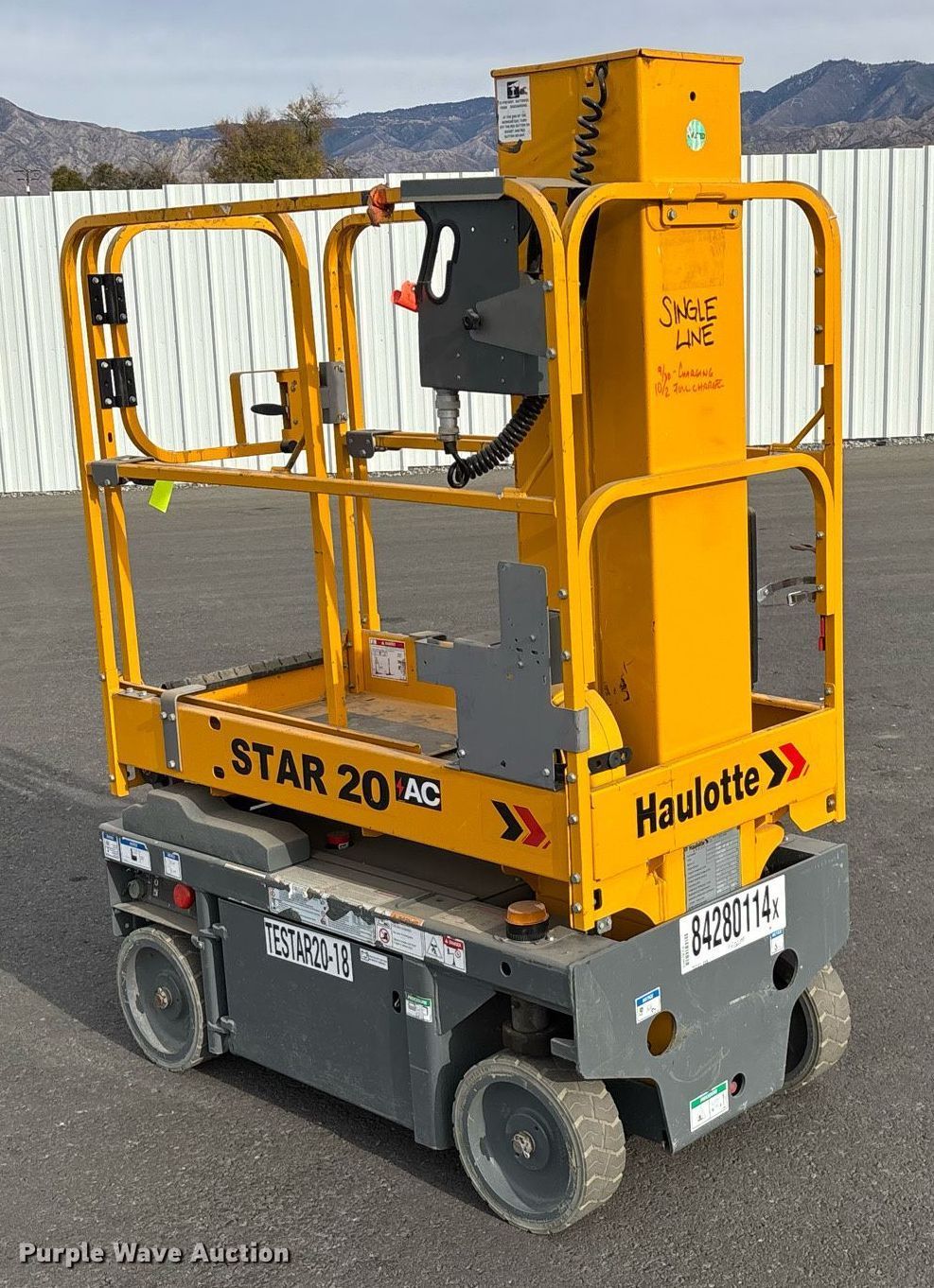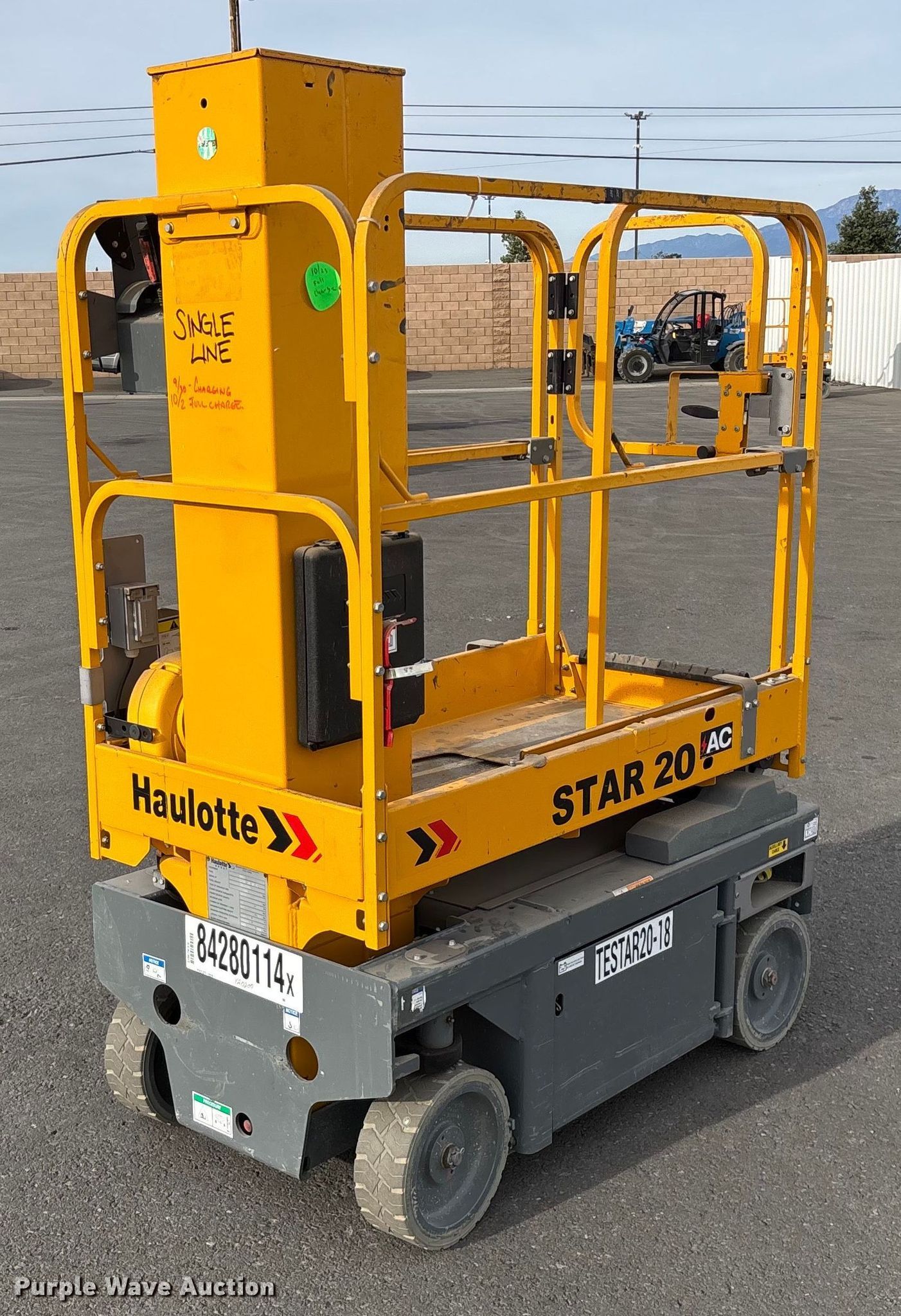 2019 Haulotte Star 20 AC E vertical lift. Hours: 50 on meter, Serial: 2068308, Unit #: TESTAR20-18, Lot #: 84280114. Electric Motor kW: 2.5, Volts: 24. Features Maximum lift capacity: 440 lbs, Maximum lift height: 19' 6", Platform: 54" L x 29" W, AC power outlet, Controls: Remote Control, Ground, Platform extensions: Manual. Tires Tire size: 12.5x4.25, Solid. Secured storage hosted by a Copart facility. Please review REQUIRED REMOVAL INSTRUCTIONS. Trinity Equipment Rentals Inc.. Mentone, CA 92359
