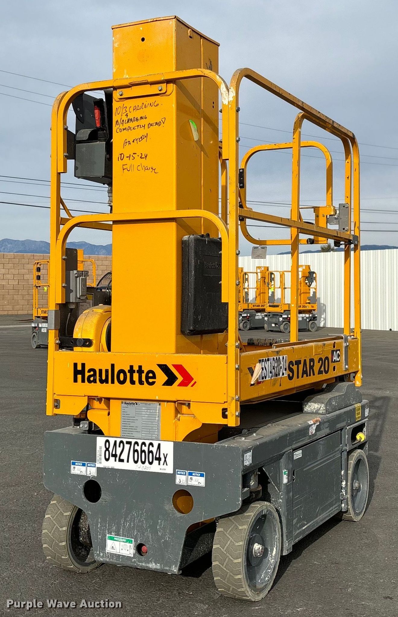 Purple Wave is selling a used Scissor or Vertical Lift in California. This item is a 2019 Haulotte Star 20 AC E vertical lift with the following: Hours: 97 on meter, Serial: 2067501, Lot #: 84276664