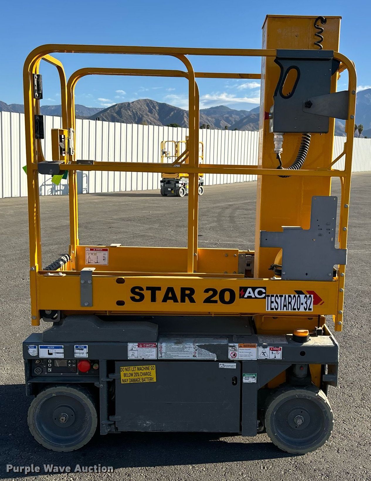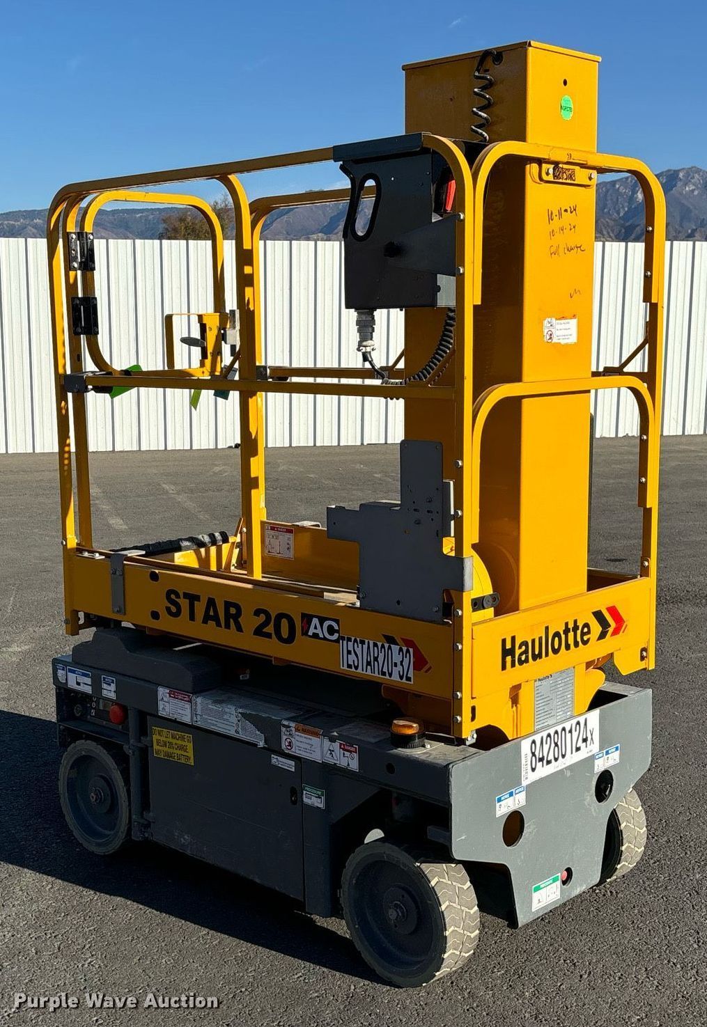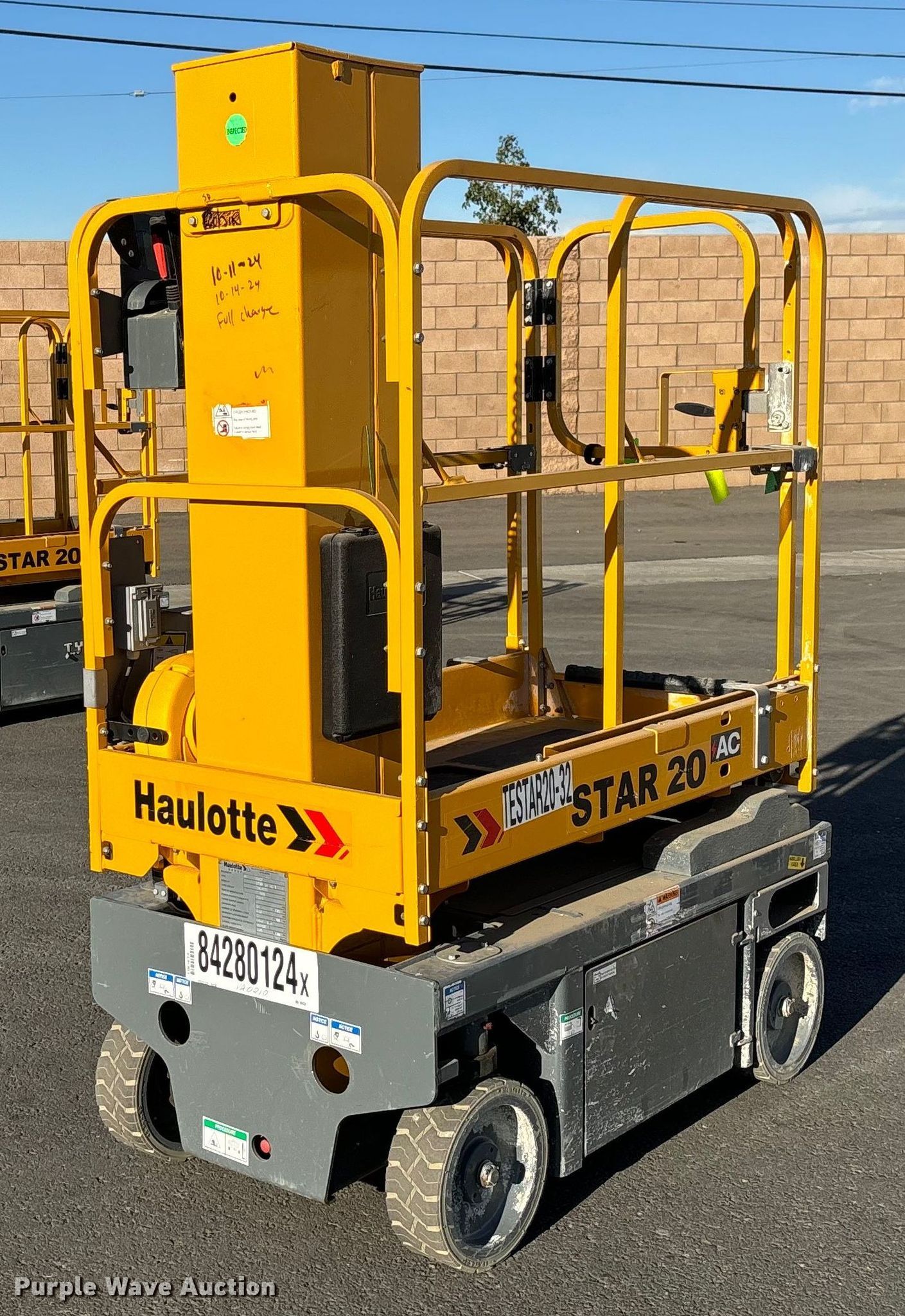 Purple Wave is selling a used Scissor or Vertical Lift in California. This item is a 2019 Haulotte Star 20 AC E vertical lift with the following: Hours: 54 on meter, Serial: 2064931, Unit #: TESTAR20-32, Lot #: 84280124
