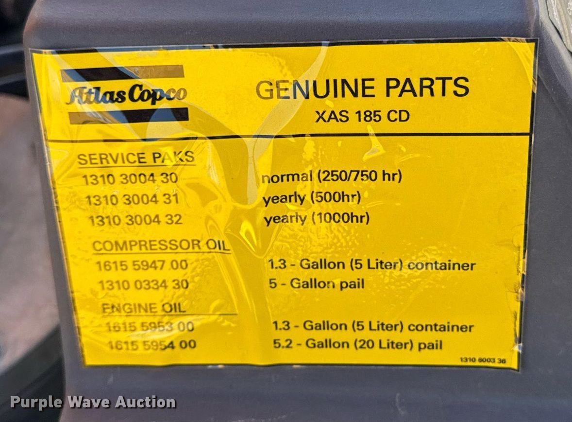 2016 Atlas Copco XAS 185 KD7 PE T4F air compressor. Hours: 925 on meter, VIN: 4500A1014GR053579, Lot #: 84282964. Engine Kubota, Displacement: 2.4L, Cylinders: 4, Fuel type: Diesel. Features Air compressor Atlas Copco, CFM: 185. Trailer 11' L x 60" W, Axles: Single, Tire size: 175/80R13. Notes Possible engine issues, runs but dies , Dead battery. Secured storage hosted by a Copart facility. Please review REQUIRED REMOVAL INSTRUCTIONS. This is worksite support equipment and will not come with a title. Transfer of ownership documentation will be a bill of sale. Trinity Equipment Rentals Inc.. Mentone, CA 92359