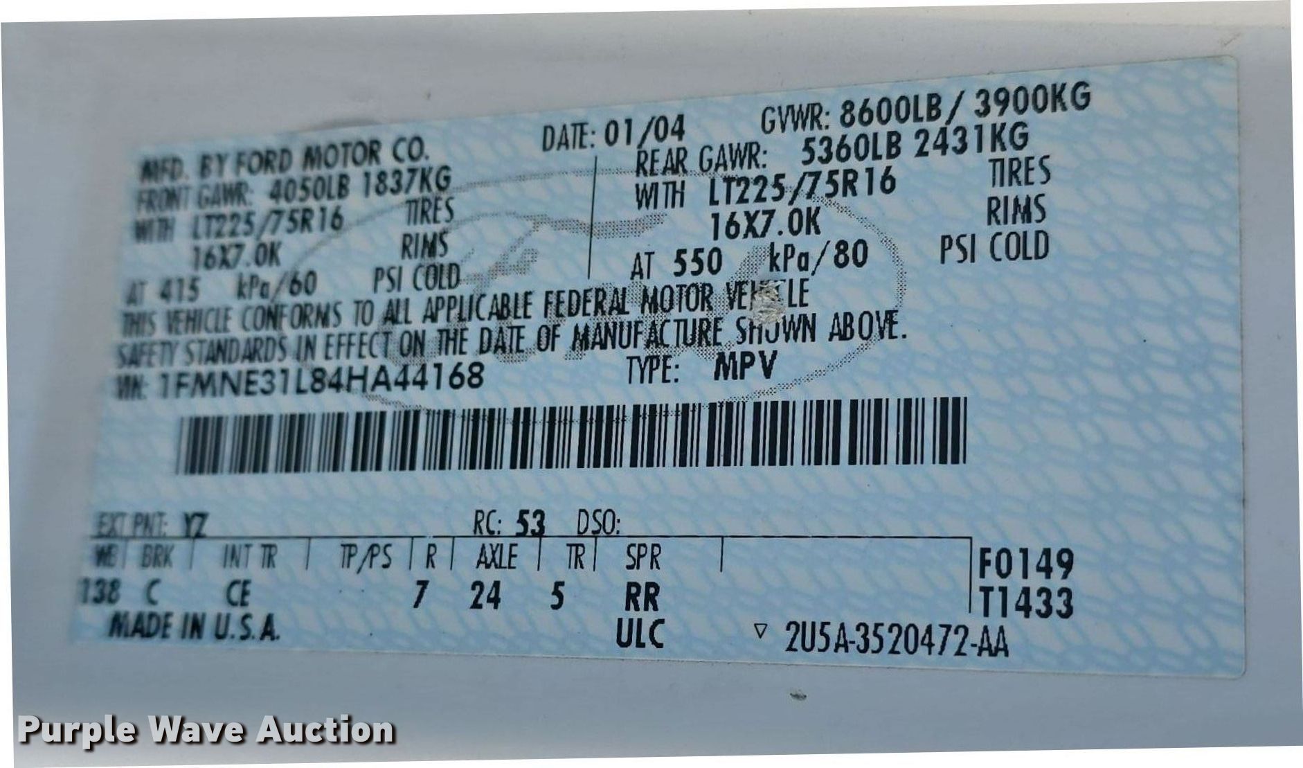 Purple Wave is selling a used Passenger Vehicle in Kansas. This item is a 2004 Ford E350 Super Duty XL van with the following: Miles: 97,776 on odometer, VIN: 1FMNE31L84HA44168, Unit #: F44