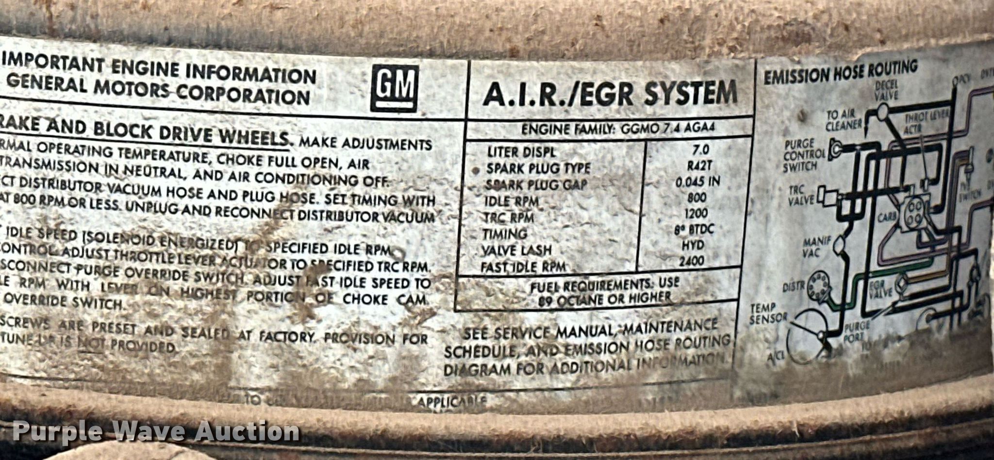 1986 Chevrolet C70 truck cab and chassis. Miles: 13,349 on odometer, VIN: 1GBP7D1E6GV103386. Engine GM, Displacement: 7.0L, Cylinders: 8, Fuel type: Gas. Transmission Manual, Speed: 5, plus 2. Chassis Axles: Single, Suspension: Spring, Brakes: Air, Truck chassis: 13' 6", GVWR: 33,200 lbs FAWR: 12,000 lbs, RAWR: 21,200 lbs. Interior Heat. Features Fuel tank: Single. Tires Size: 10.00R20. Notes Non-operational unit Unit must be be towed or hauled. Oklahoma classic title. Title distribution may be delayed up to 14 days from verification of funds. Oklahoma County - District #1. 7321 Northeast 23rd Street. Oklahoma City, OK 73141