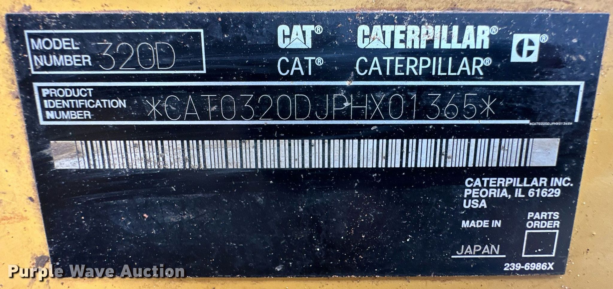 2007 Caterpillar 320D L excavator. Hours: 4,763 on meter, Serial: CAT032DJPHX0165. Engine Caterpillar C6.4 Acert, Serial: G32F0-012, Displacement: 6.4L, Cylinders: 6, Fuel type: Diesel. Transmission Hydrostatic, Two speed travel. Operators station Enclosed cab, AC, Heat. Features Auxiliary hydraulics Standard, Two-way, Counter weights, Boom Standard, Stick Stick length: 9' 6", Thumb: Hydraulic Caterpillar, Bucket Caterpillar, Width: 40", Teeth: 5. Tracks Width: 31.5", Steel, Grouser pads: Triple. Dewey County. Seiling, OK 73663
