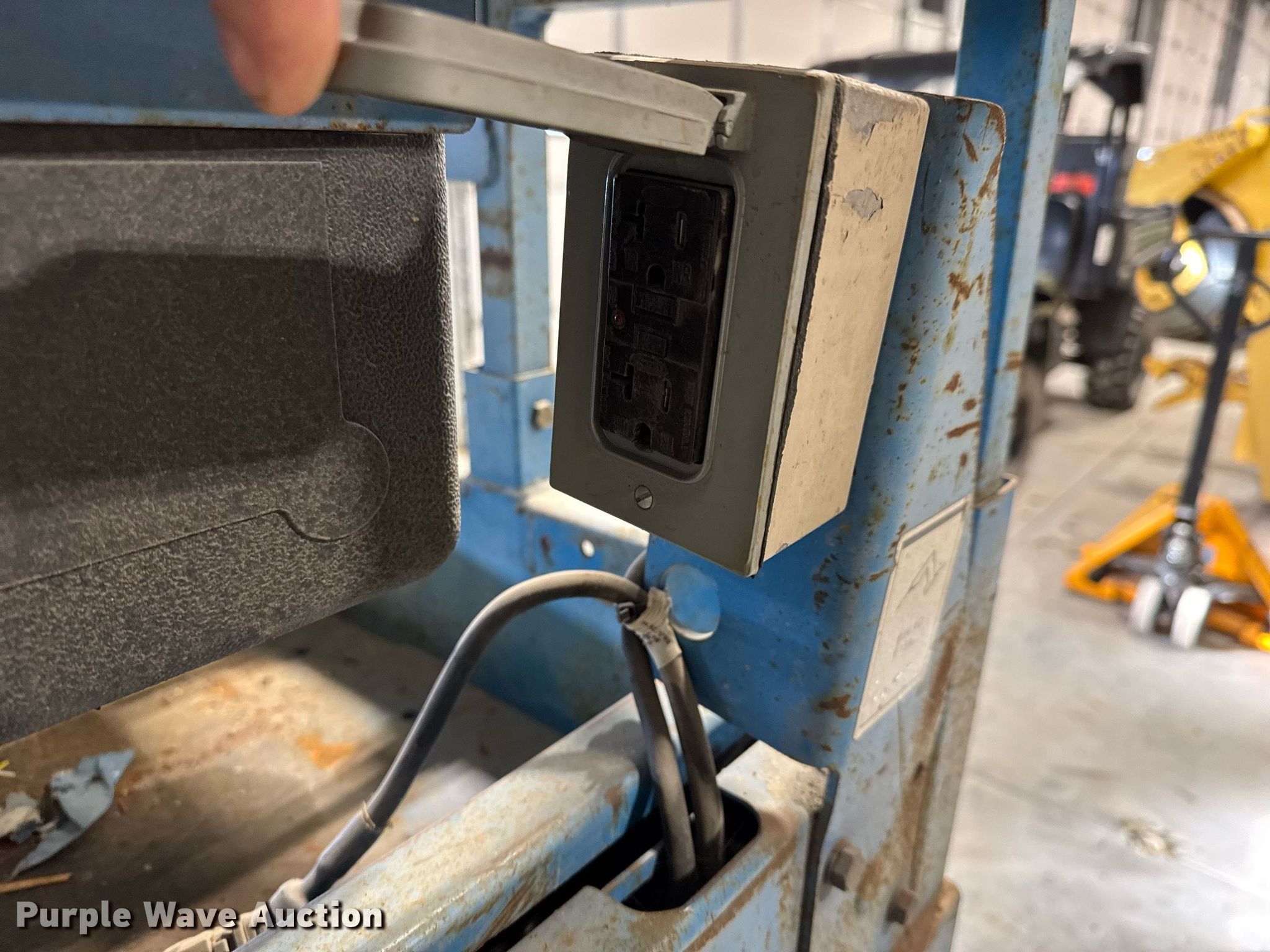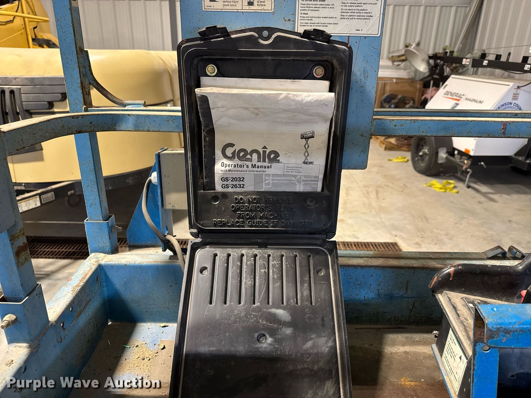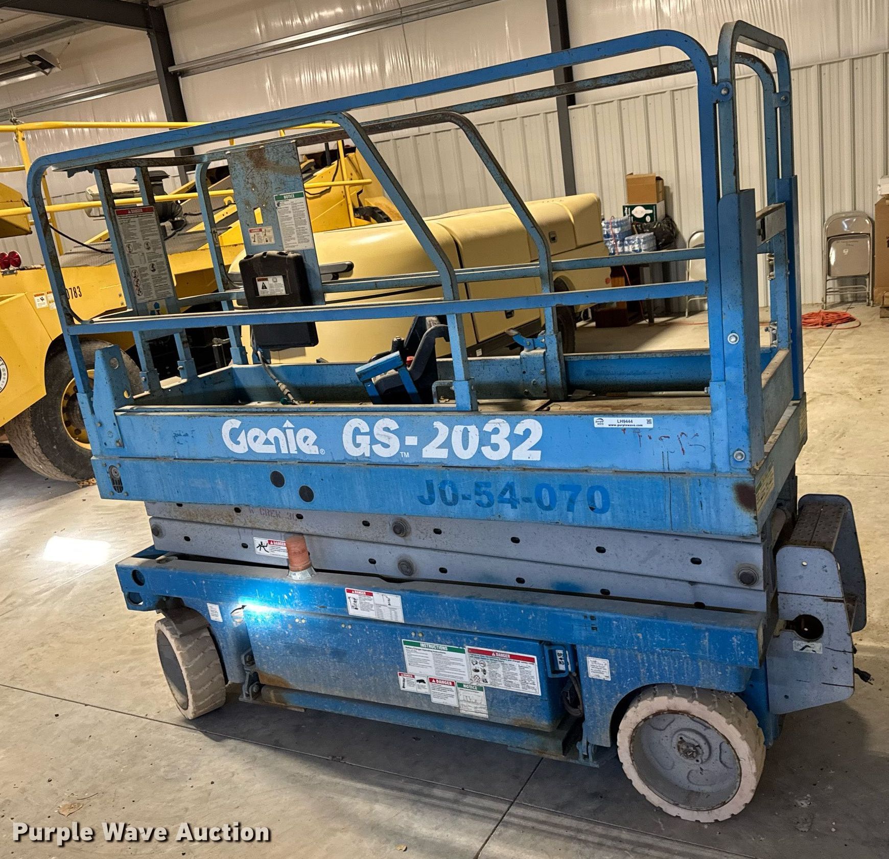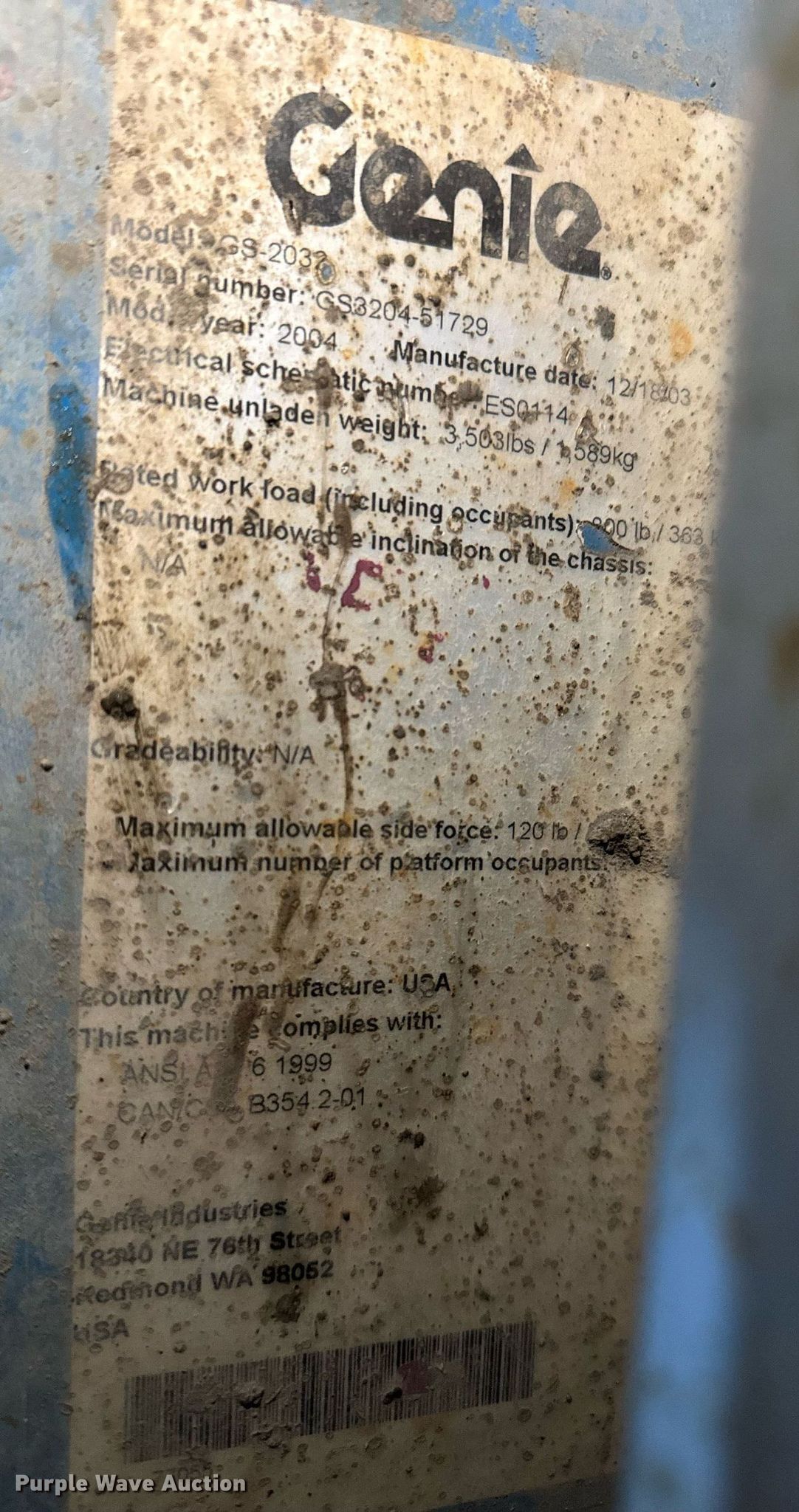 2004 Genie GS-2032 scissor lift. Hours: 258 on meter, Serial: GS3204-51729. Electric Motor General Electric 5BCG52MA100 Serial: 022367, Volts: 24. Features Maximum lift capacity: 800 lbs, Maximum lift height: 20', Platform: 88" L x 31" W, AC power outlet, Controls: Remote Control, Ground, Platform extensions: Manual, Travel speed: 2 mph. Tires Tire size: 15x11.25, Solid. Notes Possible safety switch issues, Unknown operating condition. Dickinson County. Abilene, KS 67410