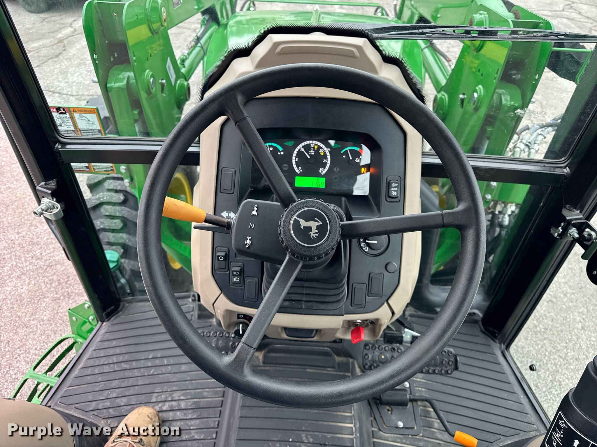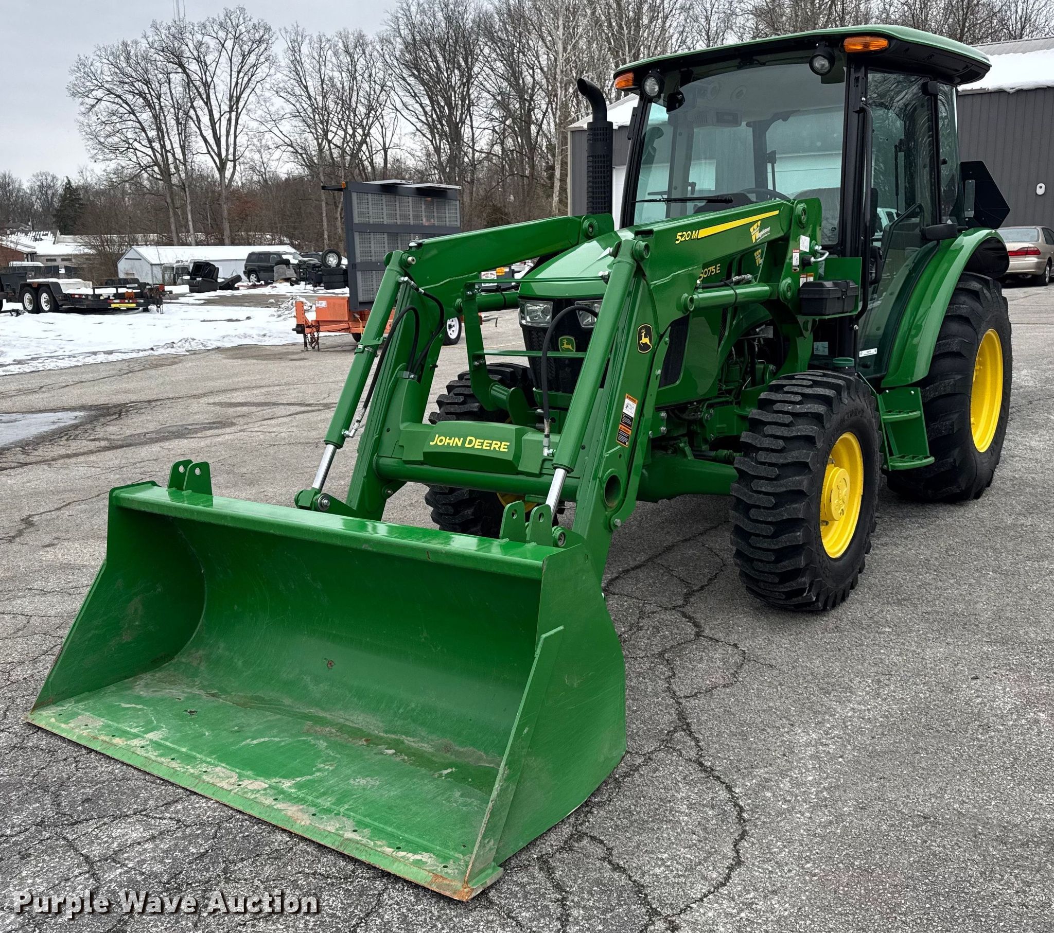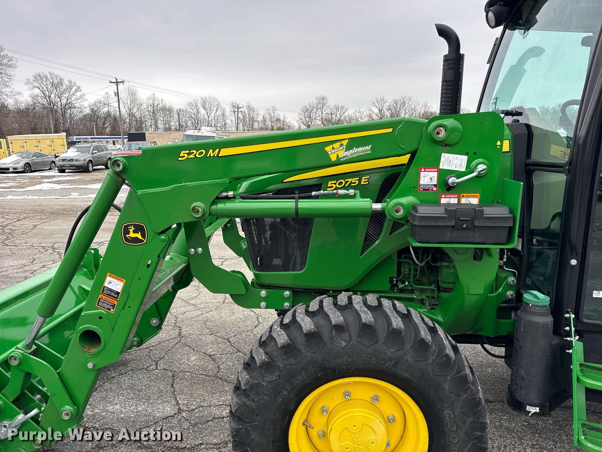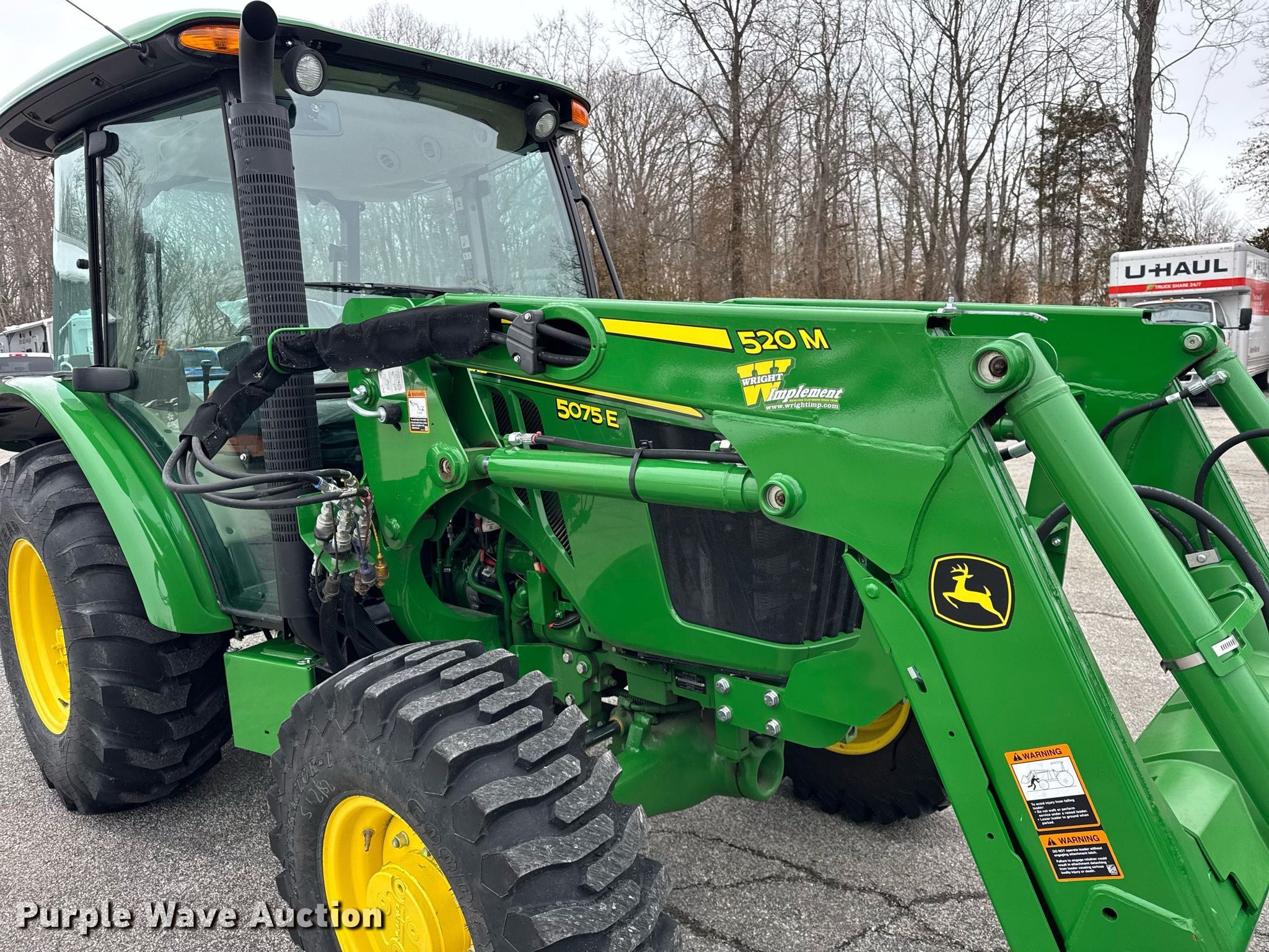 2022 John Deere 5075E MFWD tractor. Hours: 117 on meter. Engine John Deere 3029HPY101, Displacement: 2.9L, Cylinders: 3, Fuel type: Diesel. Transmission Synchro, 12F - 12R, Left-hand reverser, Differential lock. Operators station AC, Heat. Features PTO: 540, Top link, Seven pin outlet, Hydraulic remote sets Rear: 1, Loader John Deere 520M, Quick attach, Controls: Joystick, Bucket Width: 75".. Tires Front: 12.5/80-18, Rear: 16.9-24. Notes Warranty valid until April 2027 or 2,500 hours. Pettit Sales. North Vernon, IN 47265