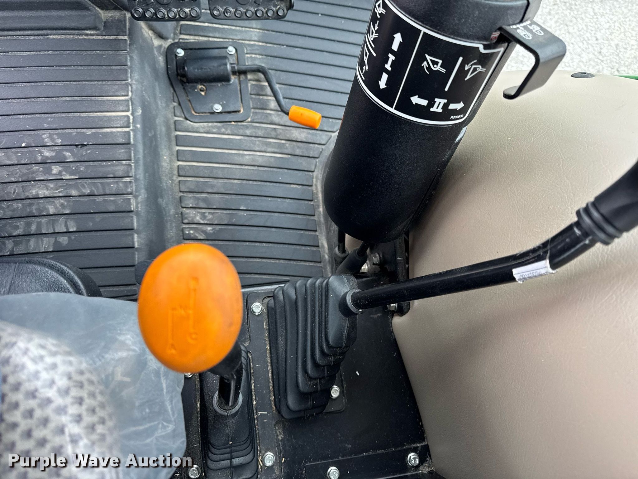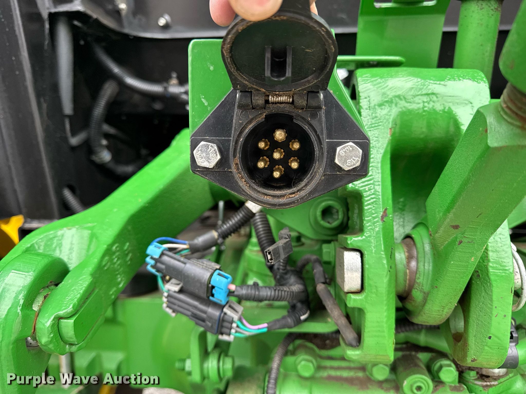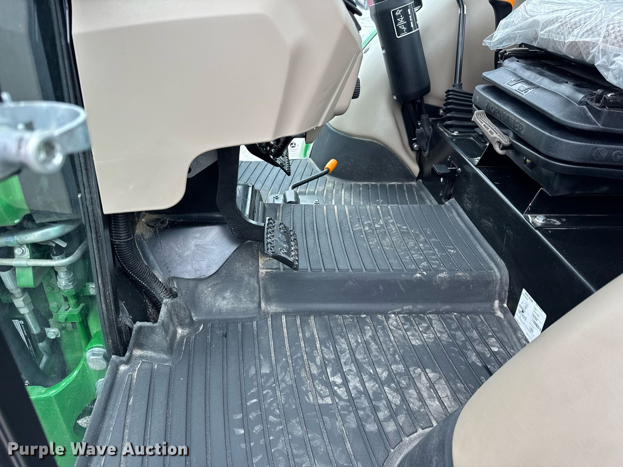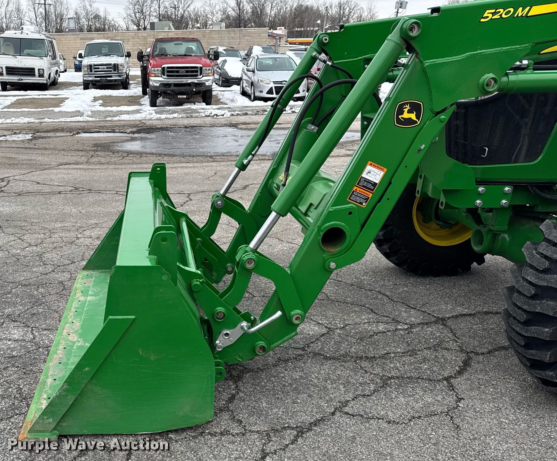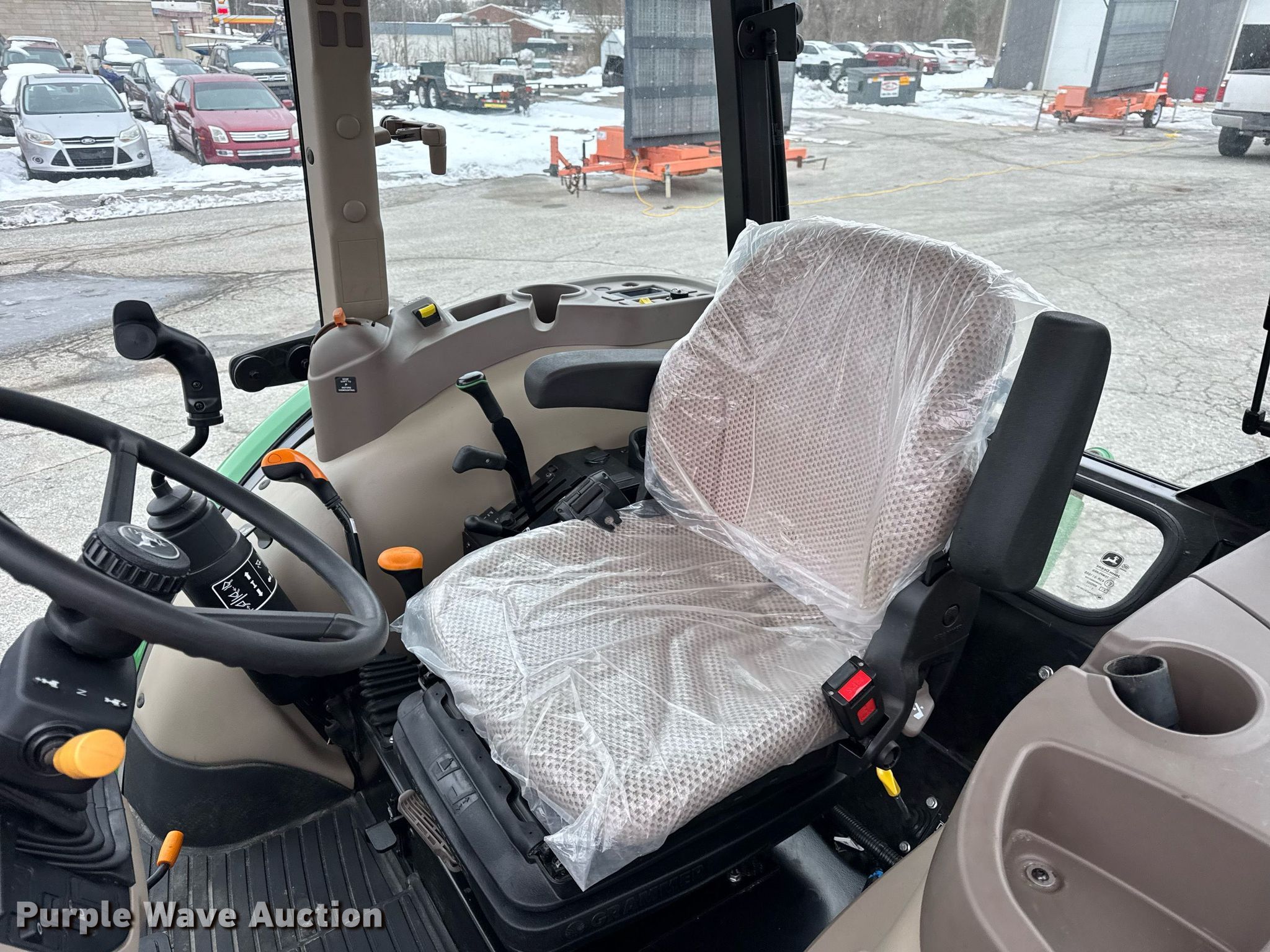 2022 John Deere 5075E MFWD tractor. Hours: 117 on meter. Engine John Deere 3029HPY101, Displacement: 2.9L, Cylinders: 3, Fuel type: Diesel. Transmission Synchro, 12F - 12R, Left-hand reverser, Differential lock. Operators station AC, Heat. Features PTO: 540, Top link, Seven pin outlet, Hydraulic remote sets Rear: 1, Loader John Deere 520M, Quick attach, Controls: Joystick, Bucket Width: 75".. Tires Front: 12.5/80-18, Rear: 16.9-24. Notes Warranty valid until April 2027 or 2,500 hours. Pettit Sales. North Vernon, IN 47265