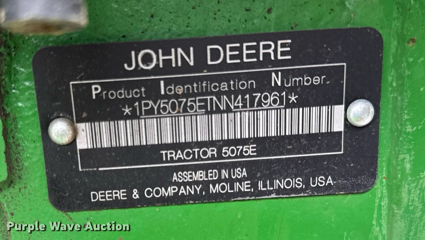 Purple Wave is selling a used Tractor in Indiana. This item is a 2022 John Deere 5075E MFWD tractor with the following: Hours: 117 on meter