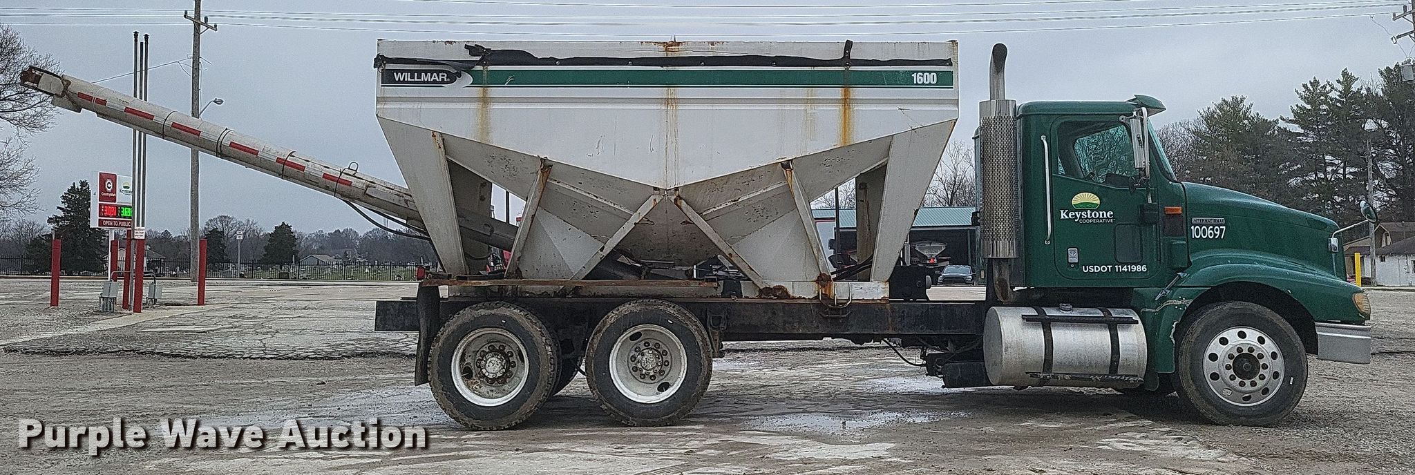 2000 International 9100i fertilizer delivery truck. Miles: 577,713 on odometer, VIN: 2HSCBAER8YC070751, Unit #: 100697. Engine Cummins N14Plus, Displacement: 14.0L, Cylinders: 6, Fuel type: Diesel. Transmission Eaton Fuller, Manual, Speed: 10. Chassis Differential lock: Inter- axle, Axles: Tandem, Suspension: Spring, Brakes: Air, PTO. Interior AC, Heat, Cruise control. Features Delivery bed Willmar 1600, 16' L, Capacity: 16 tons, Compartments: 2, Discharge auger Diameter: 10", Length: 11', Rear, Ground controls. Tires Size: 285/75R24.5. Indiana title. Title distribution may be delayed up to 14 days from verification of funds. Keystone Cooperative. Danville, IN 46122