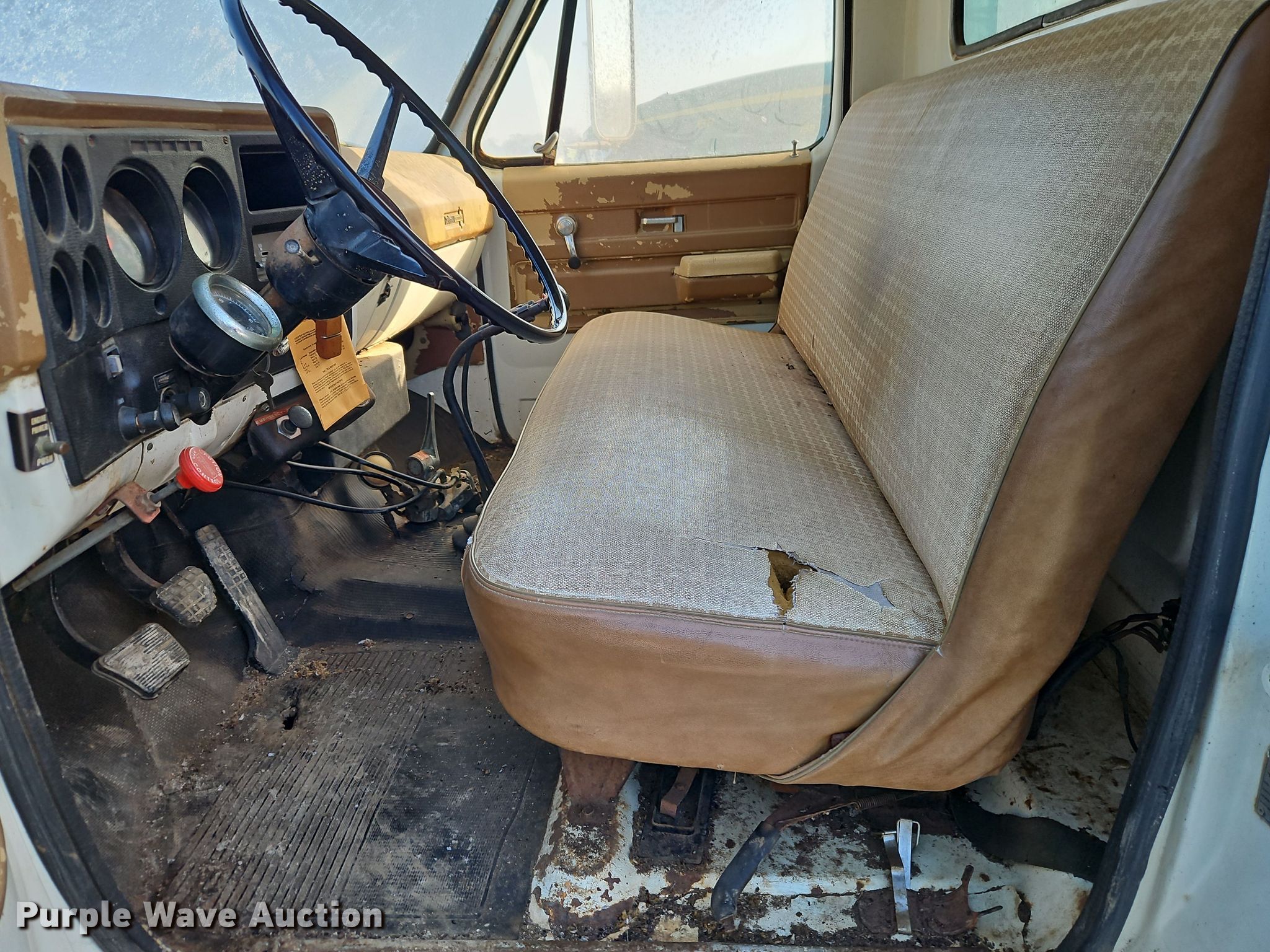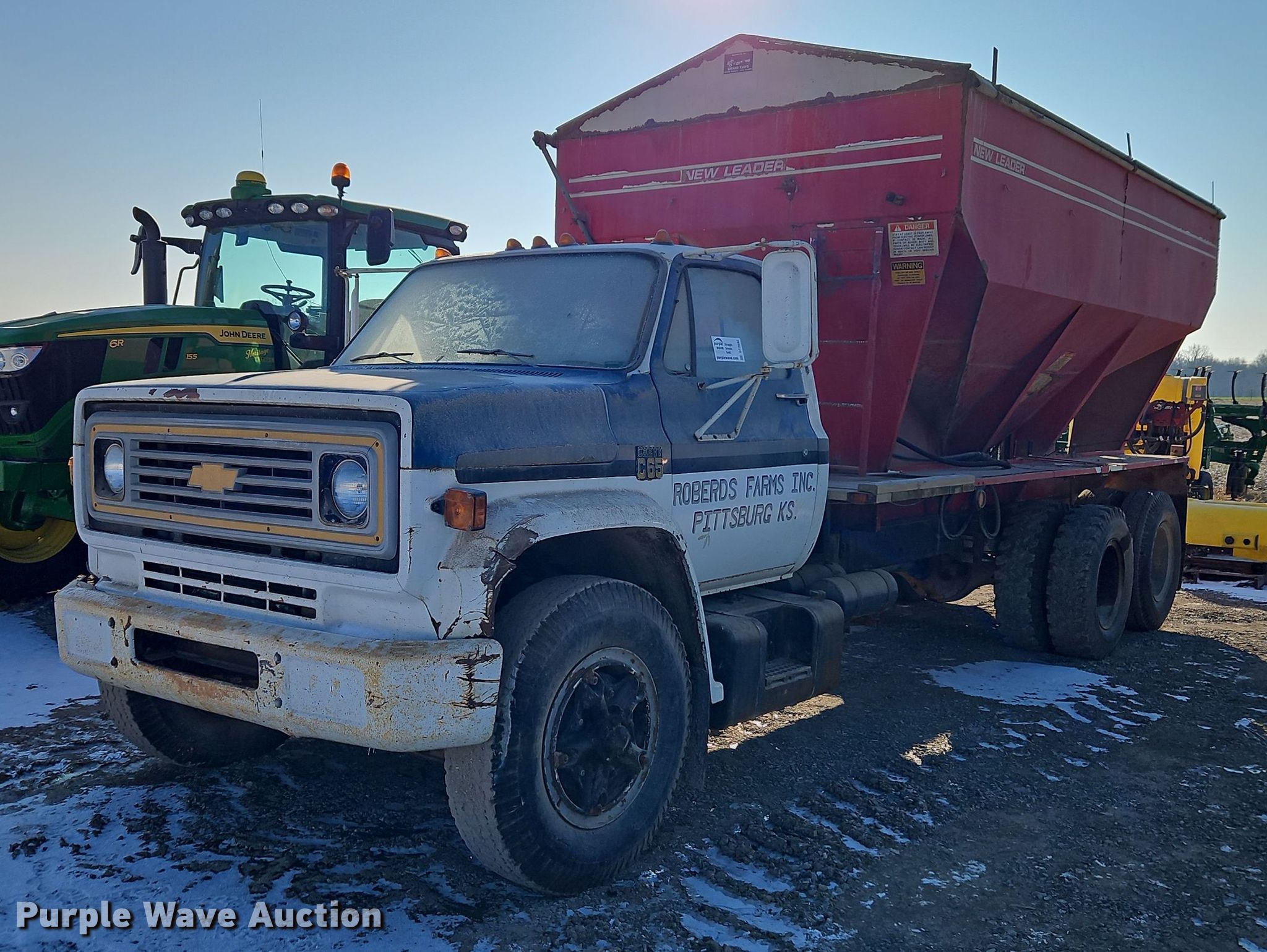 1974 Chevrolet C65 fertilizer delivery truck. Miles: 17,579 on odometer Actual mileage unknown, VIN: CCE664V149629. Engine General Motors 427, Cylinders: 8, Fuel type: Gas. Transmission Manual, Speed: 5, plus 2. Chassis Axles: Tandem, Tag axle, Suspension: Spring, Brakes: Air, PTO, GVWR: 27,500 lbs. Interior Heat. Features Delivery bed New Leader, Compartments: 2, Discharge auger Diameter: 8", Rear, Tarp. Tires Size: 10.00-20. Notes Windshield chipped or cracked, Dead battery, Possible clutch issues, Possible engine issues, will not start , Unknown operating condition. Kansas antique title. Mileage has not been verified. Exempt will be written in the odometer disclosure on the title. Title distribution may be delayed up to 14 days from verification of funds. Roberds Farm. Pittsburg, KS 66762