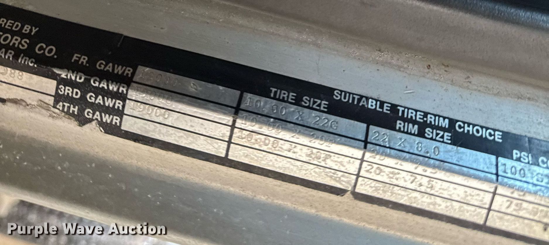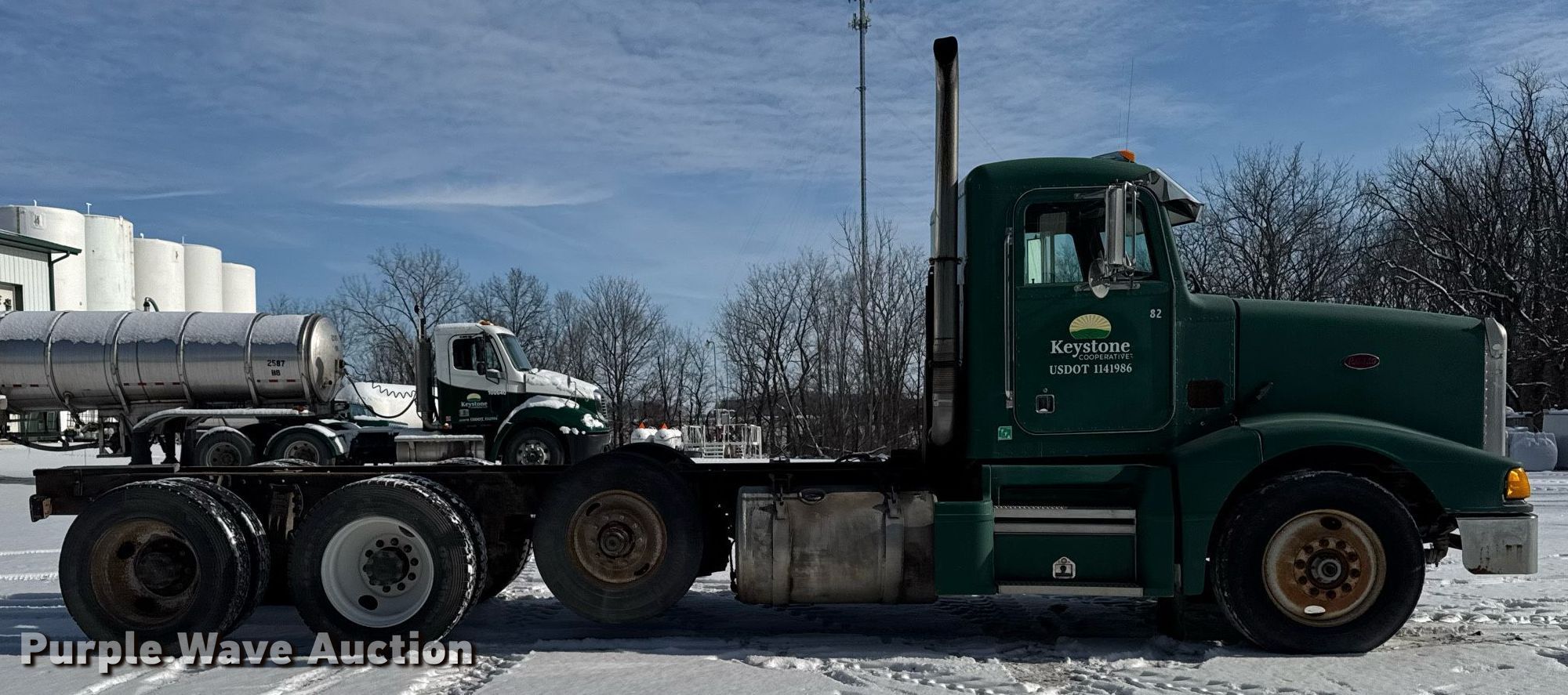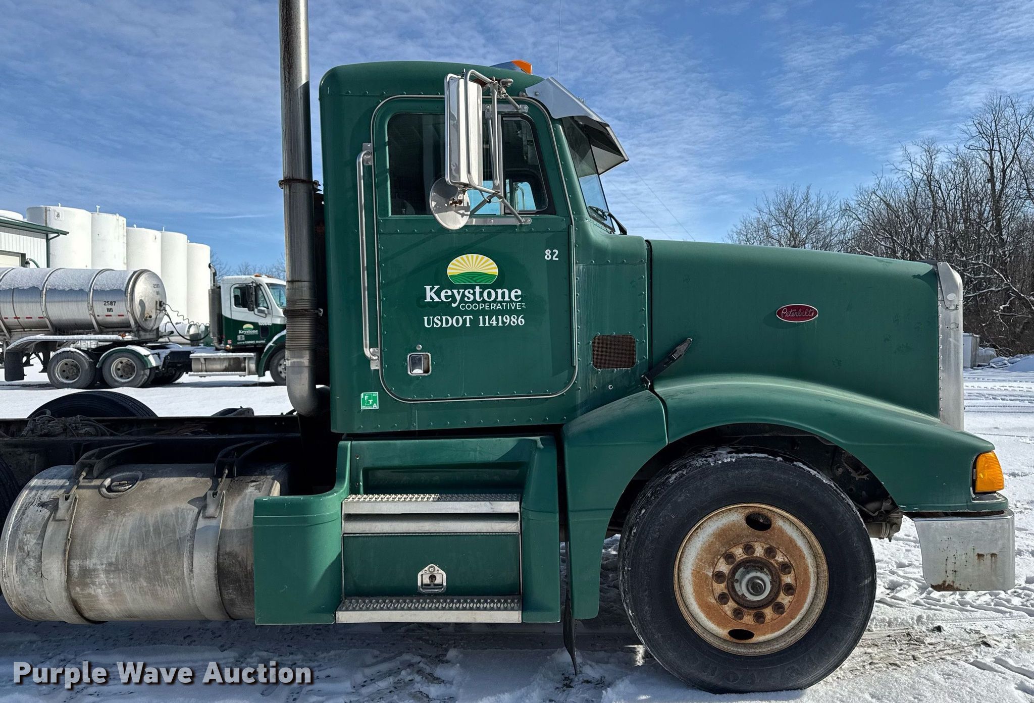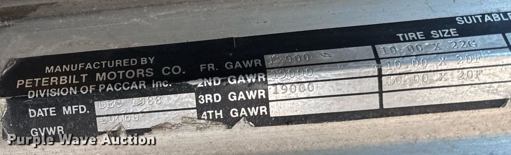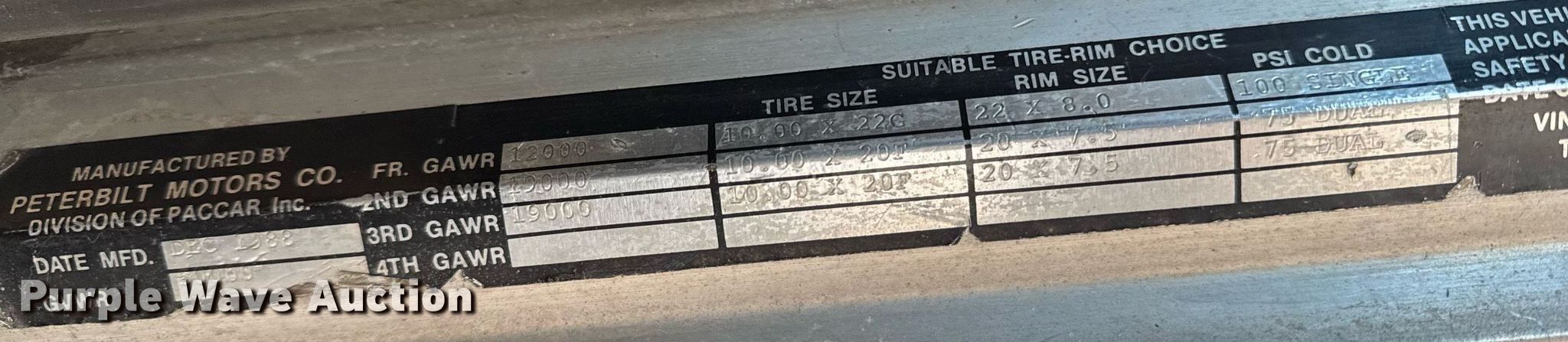 1989 Peterbilt 377 truck cab and chassis. Miles: 341,918 on odometer, VIN: 1XPCDB9X9KN272418. Engine Caterpillar, Cylinders: 6, Fuel type: Diesel, Engine brake. Transmission Eaton Fuller, Manual, Speed: 9. Chassis Axles: Triple, Pusher axle, Differential lock: Inter-axle, Suspension: Air Dump valves, Brakes: Air, PTO, Truck chassis: 19', GVWR: 50,000 lbs FAWR: 12,000 lbs, IAWR: 19,000 lbs, RAWR: 19,000 lbs. Interior AC, Heat, Heated mirrors, Cruise control, Air ride cab. Features Fuel tank: Dual. Tires Front: 11R24.5, Rear: 285/75R24.5, Lift axle: 11R22.5. Notes One dual fuel tank converted to red fuel auxiliary fuel tank. Indiana title. Title distribution may be delayed up to 30 days from verification of funds. Keystone Cooperative. Frankfort, IN 46041