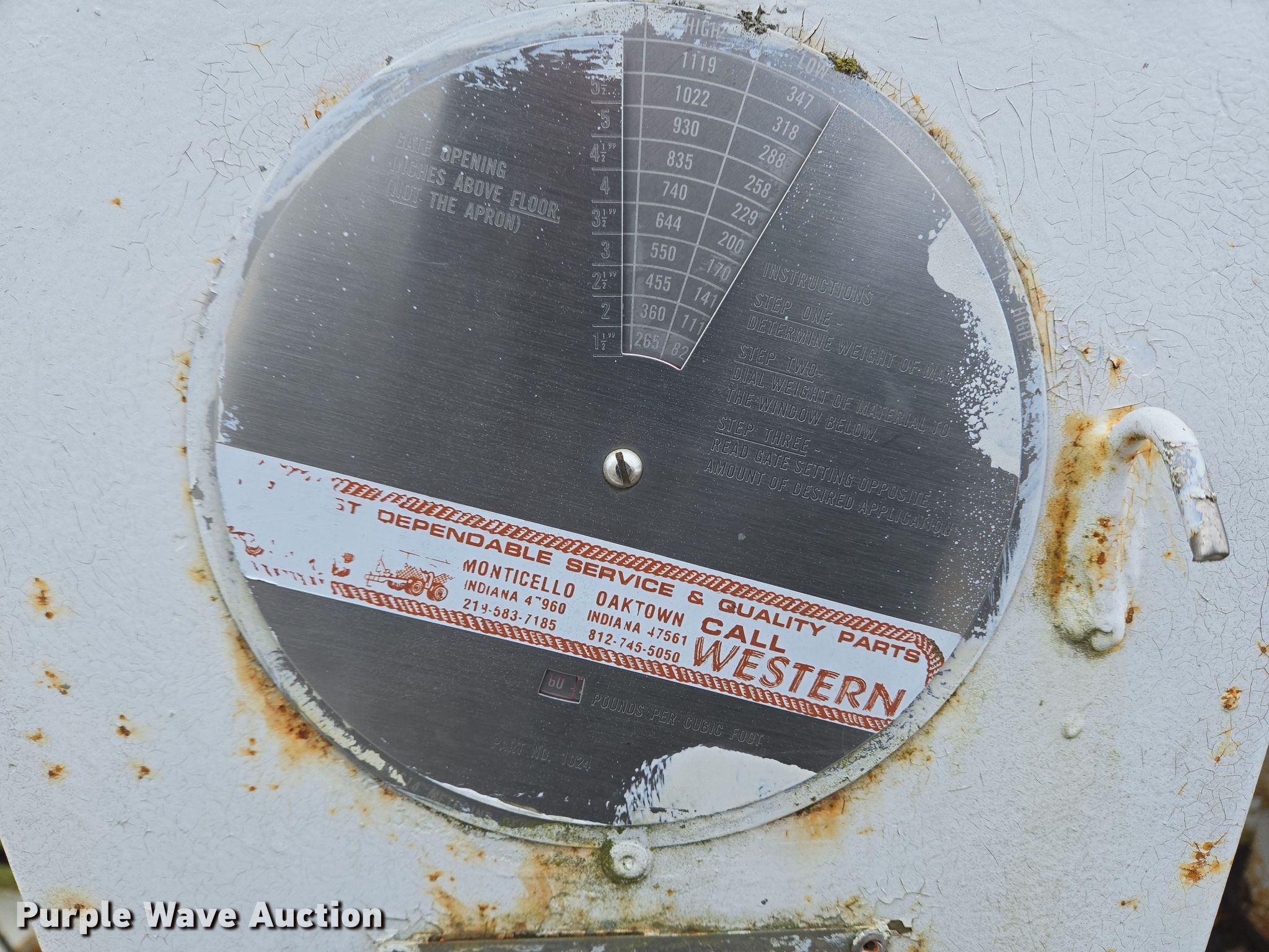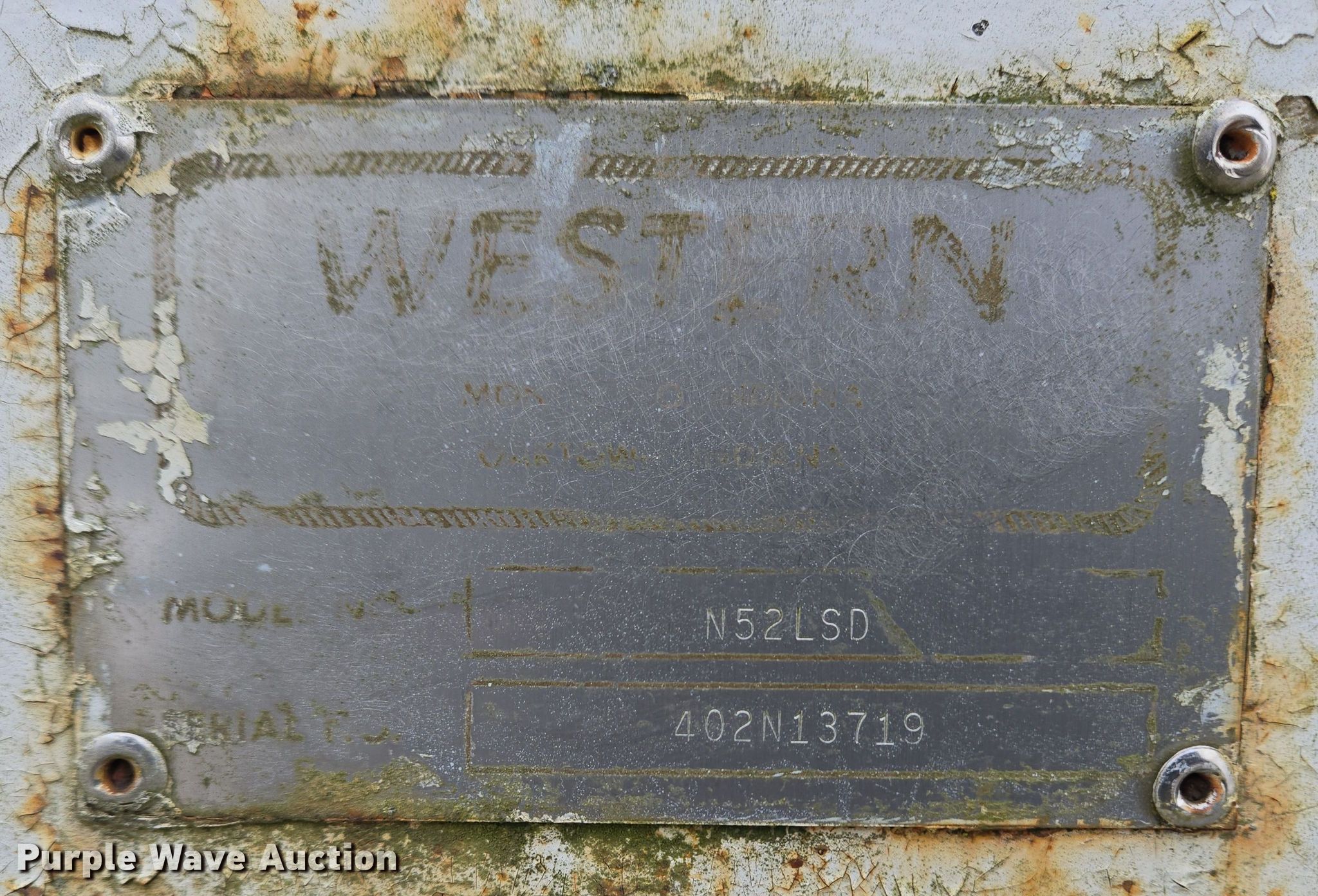 Purple Wave is selling a used Applicator Pull Type in Indiana. This item is a Western N52LSD spreader with the following: Serial: 402N13719, Unit #: 2