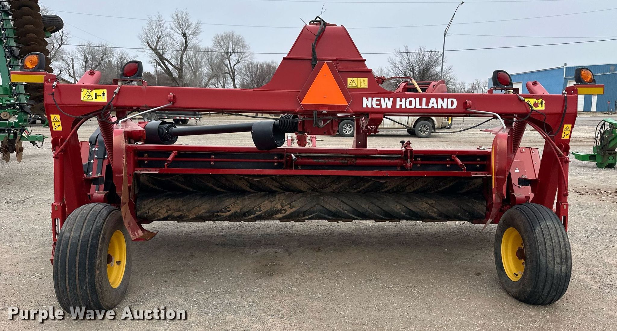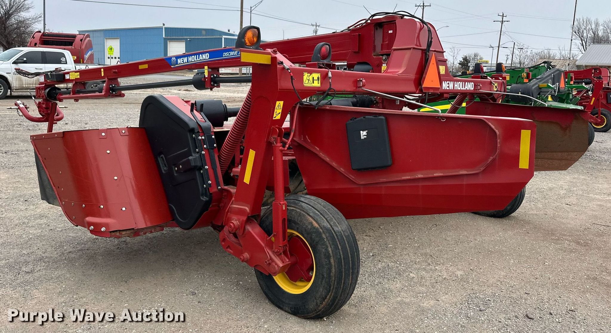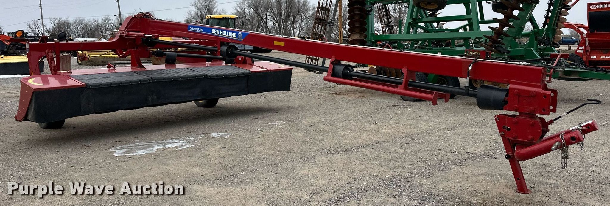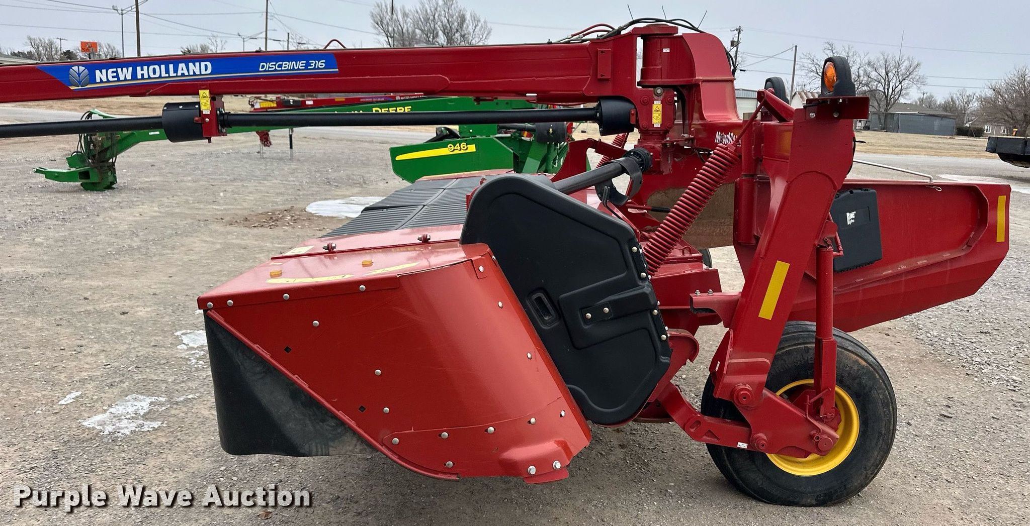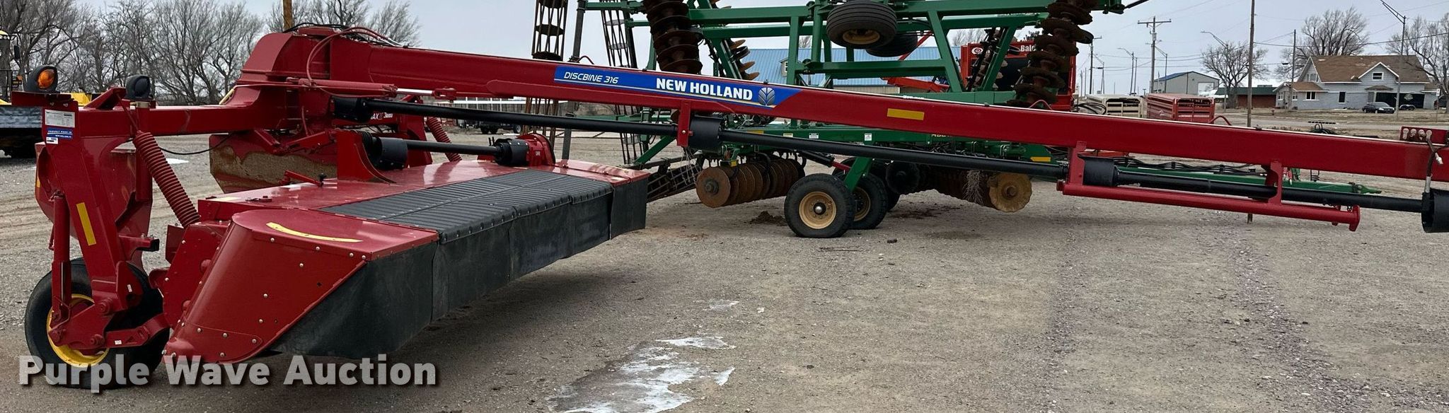 Purple Wave is selling a used Windrower Pull Type in Oklahoma. This item is a New Holland Discbine 316 swather / windrower with the following: PTO: 1000, Center pivot, Hitch, Two point, Head, Disc, Width: 16', Hydraulic head tilt, Conditioners: Rubber/ rubber