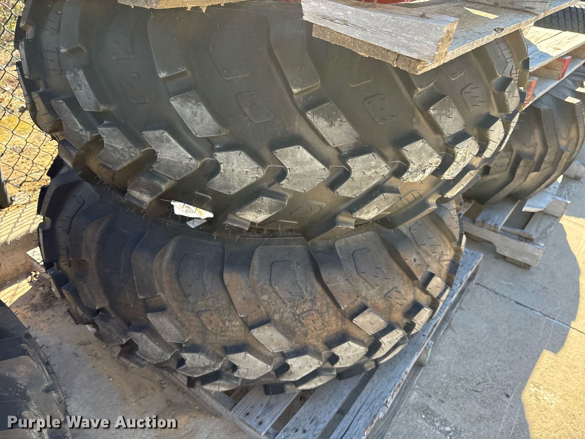 Purple Wave is selling a used Industrial Tires or Tracks in Texas. This item is a (4) Goodyear tractor tires and wheels with the following: (2) Goodyear 7.2-16, (2) Goodyear 17.5L-24 IND