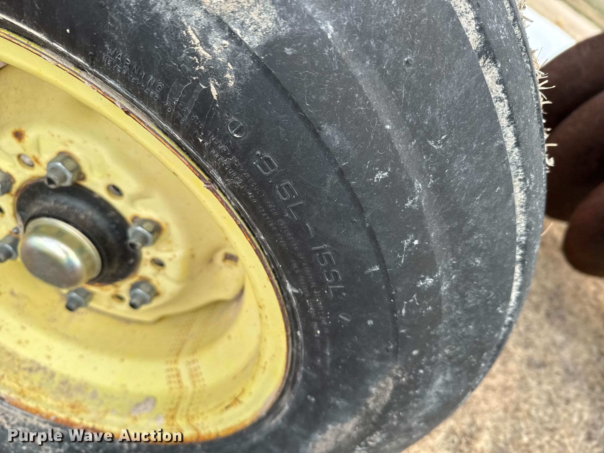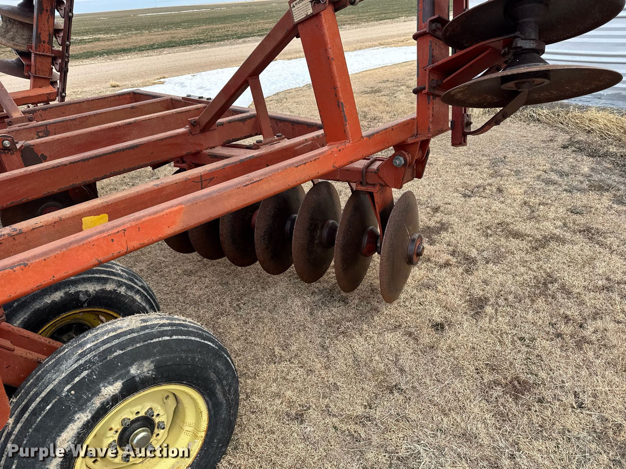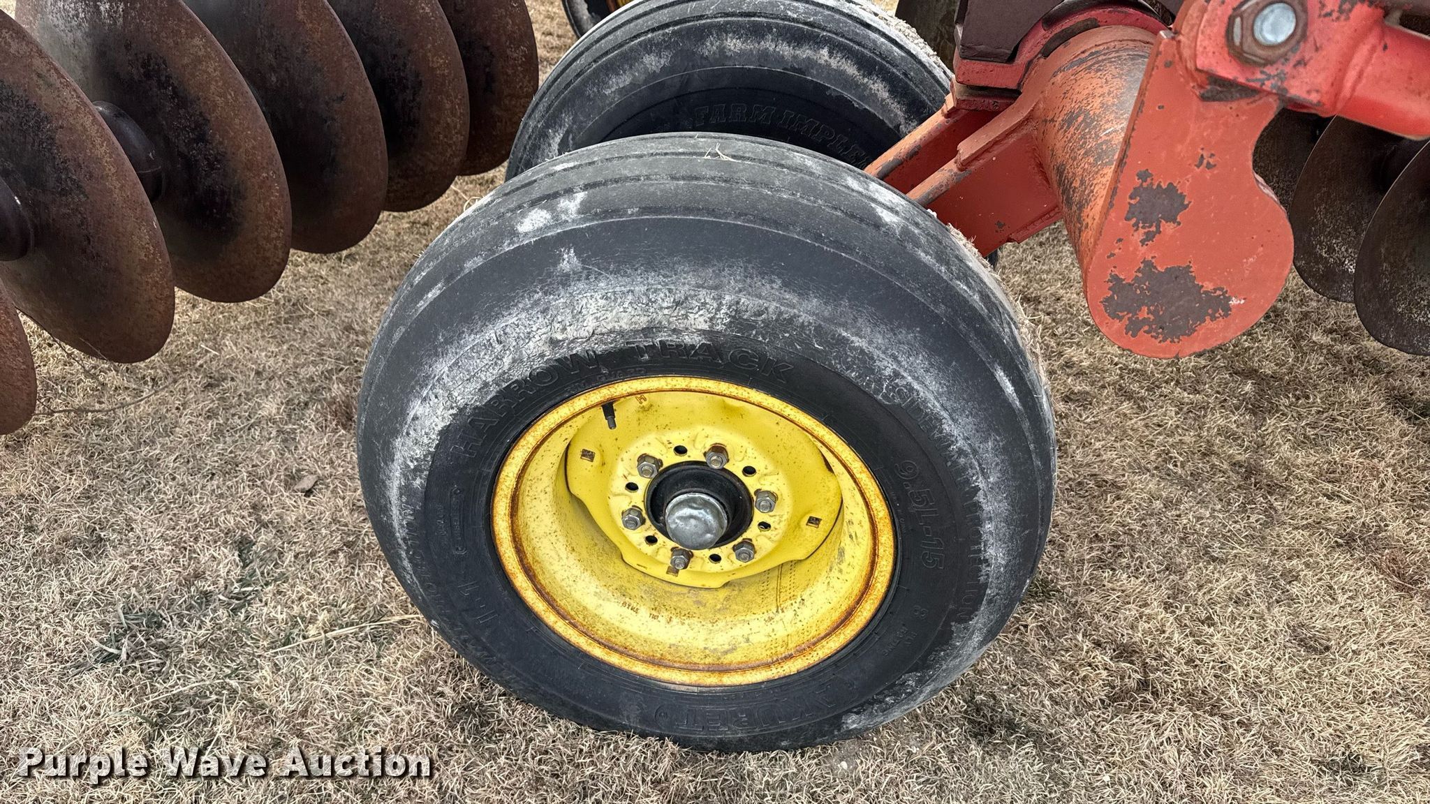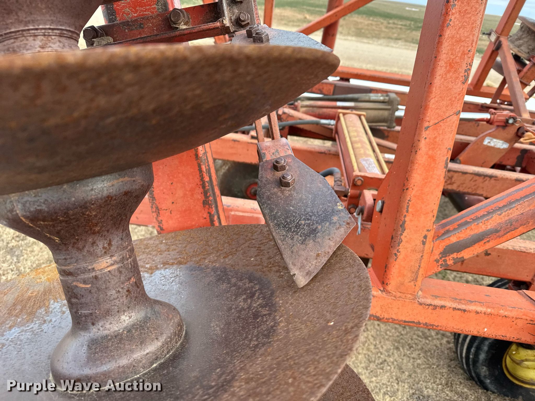 Sunflower 81TA-27 double off-set disk. Overall width: 27', Serial: 2354. Features Front blades Diameter: 21", Spacing: 10", Rear blades Diameter: 21", Spacing: 10", Disk scrapers, Operation Hydraulic lift, Hydraulic fold, Leveler: Manual. Tires Tire size: 9.5-15SL, Gauge wheels Size: 16.5x6.5-8. Ransom, KS 67572