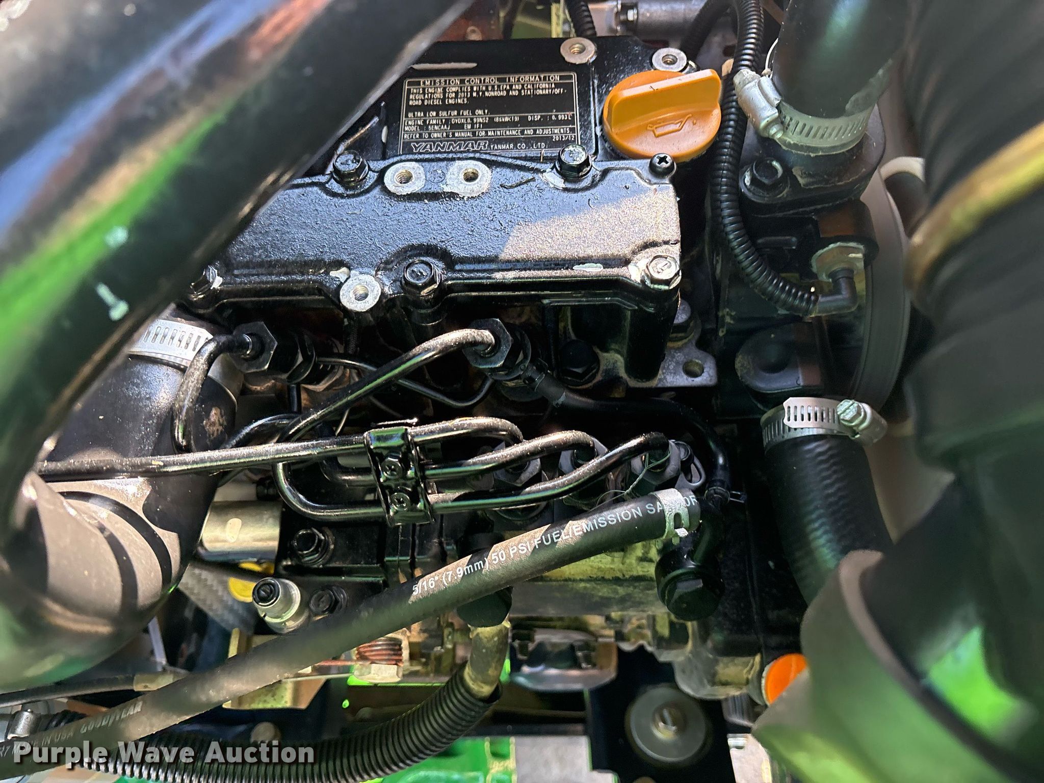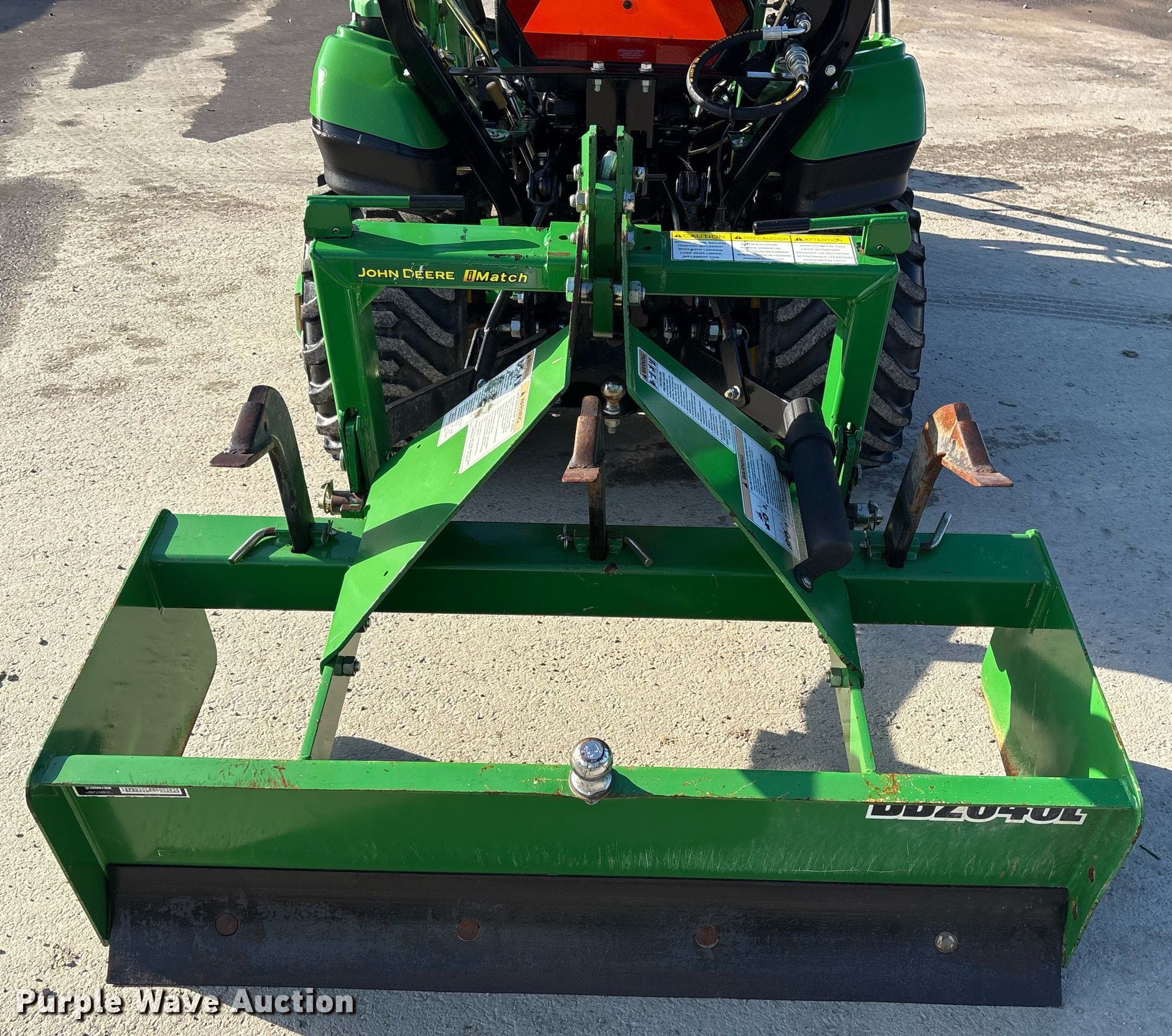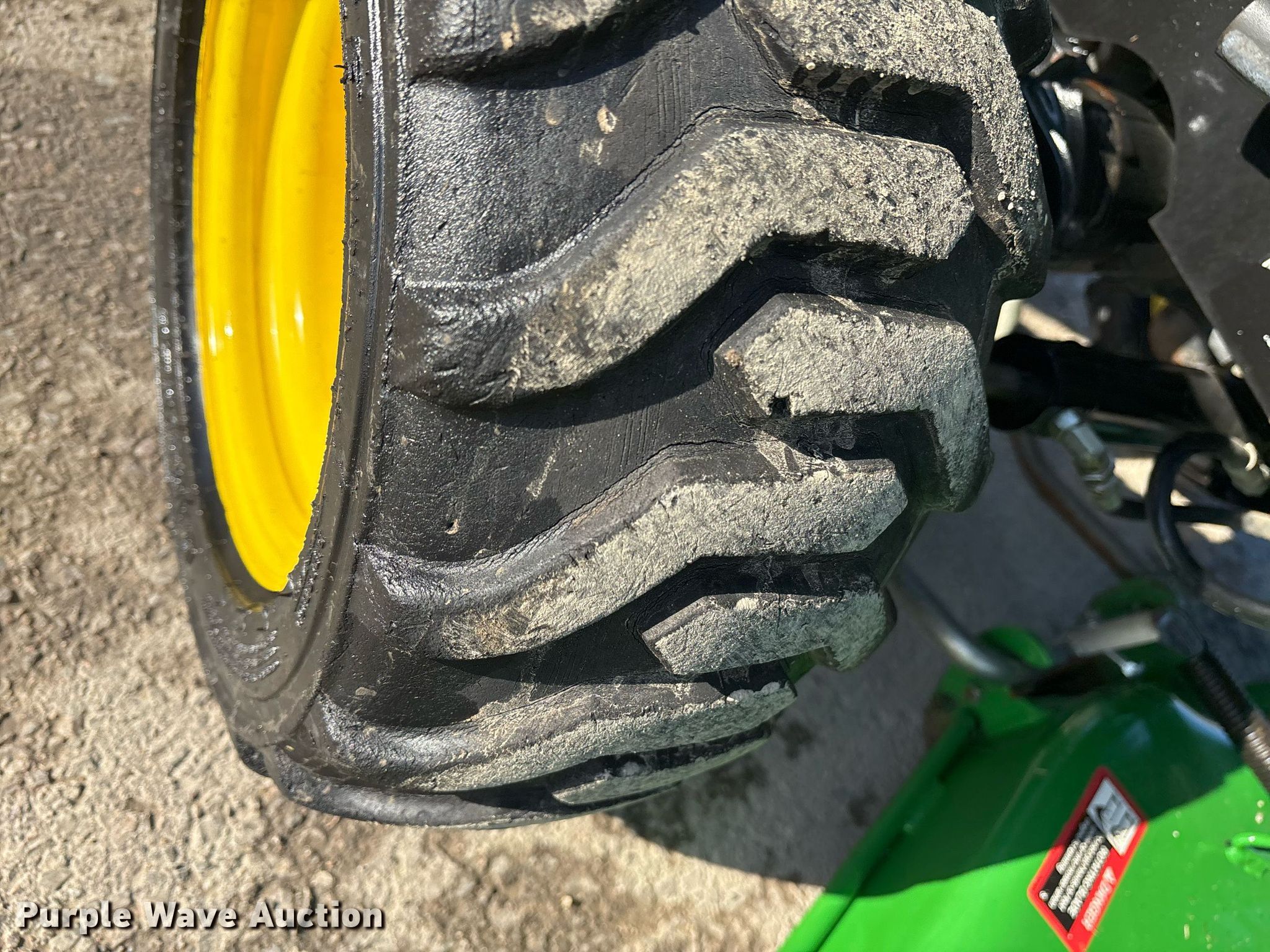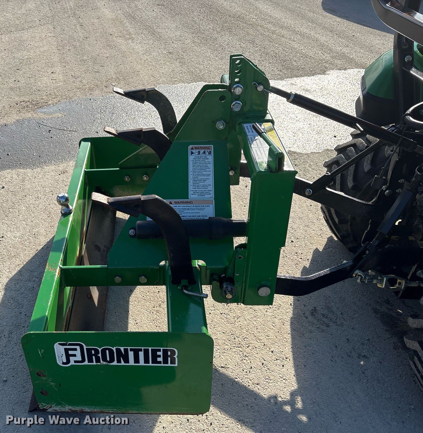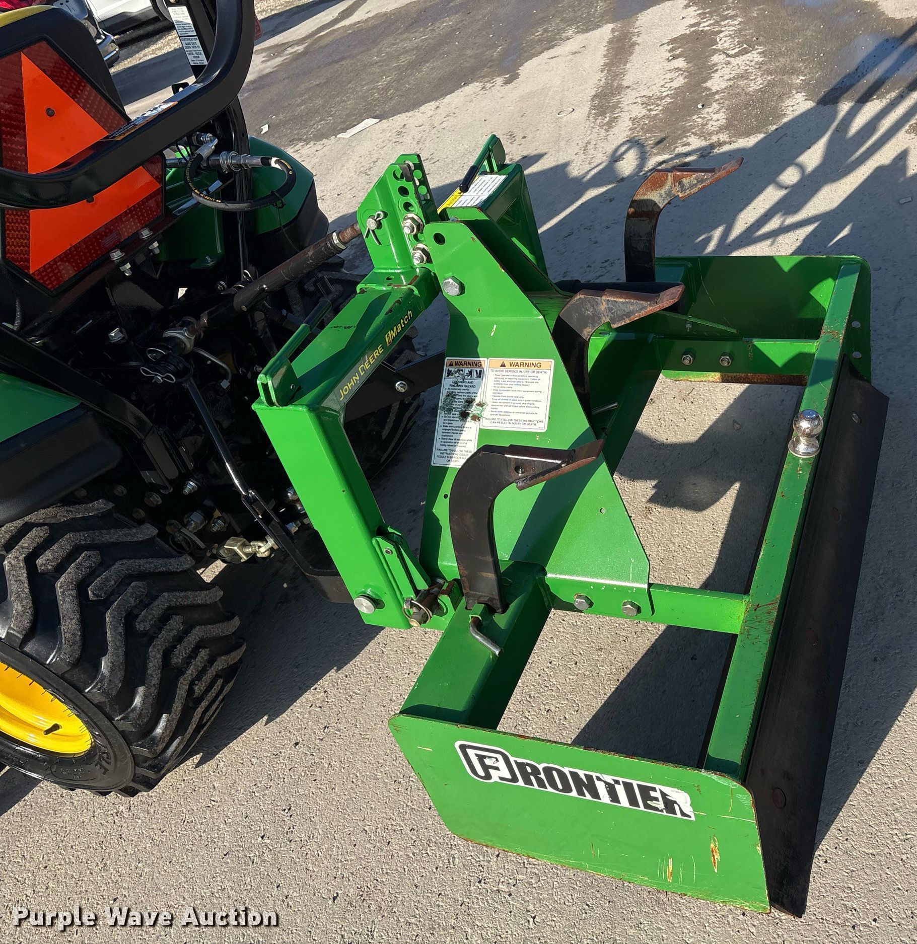 2014 John Deere 1023E MFWD tractor. Hours: 280 on meter, Serial: 1LV1023EVEH411637. Engine Yanmar 5ENCAAJ, Displacement:.993L, Cylinders: 3, Fuel type: Diesel, kW: 19. Transmission Hydrostatic, Differential lock. Features PTO: 540, Three point Top link, Quick attach, Hydraulic remote sets Front: 2, Rear: 1, Loader John Deere, Quick attach, Controls: Joystick, Bucket Width: 50", Box blade Frontier, Width: 4', Ripper shanks: 3, Mower deck John Deere, Width: 60".. Tires Front: 18x8.50-10NHS, Rear: 26x12.00-12NHS. Notes Dead battery. Durant, OK 74701