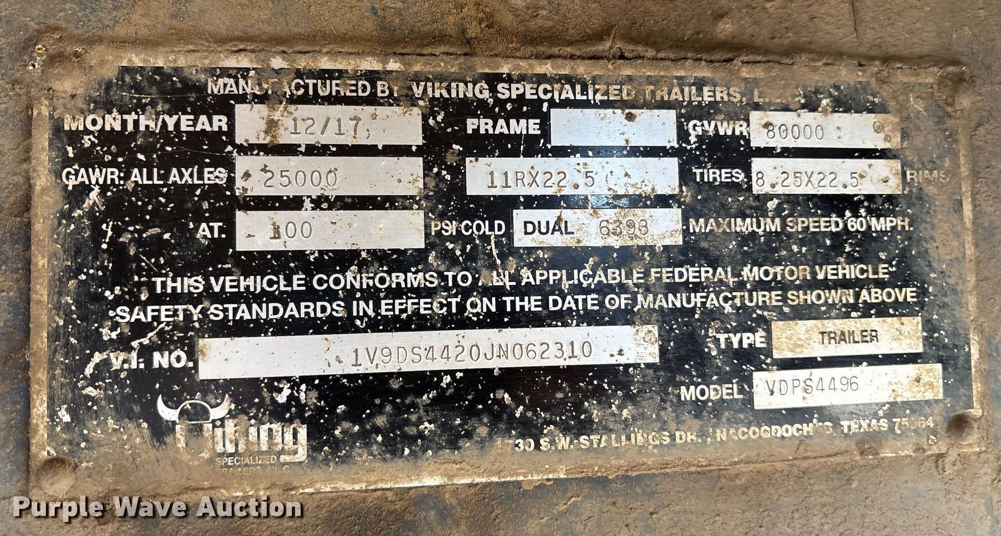 Purple Wave is selling a used Flat or Drop Deck Trailer in Arkansas. This item is a 2018 Viking VDPS4496 drop deck trailer with the following: VIN: 1V9DS4420JN062310, Unit #: T1693