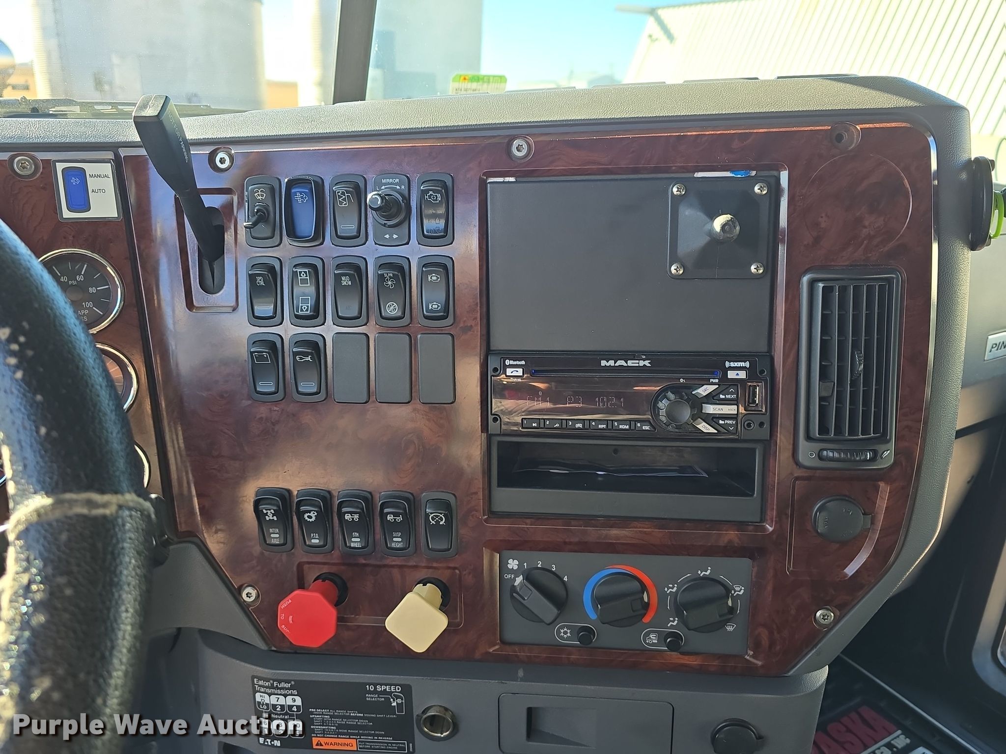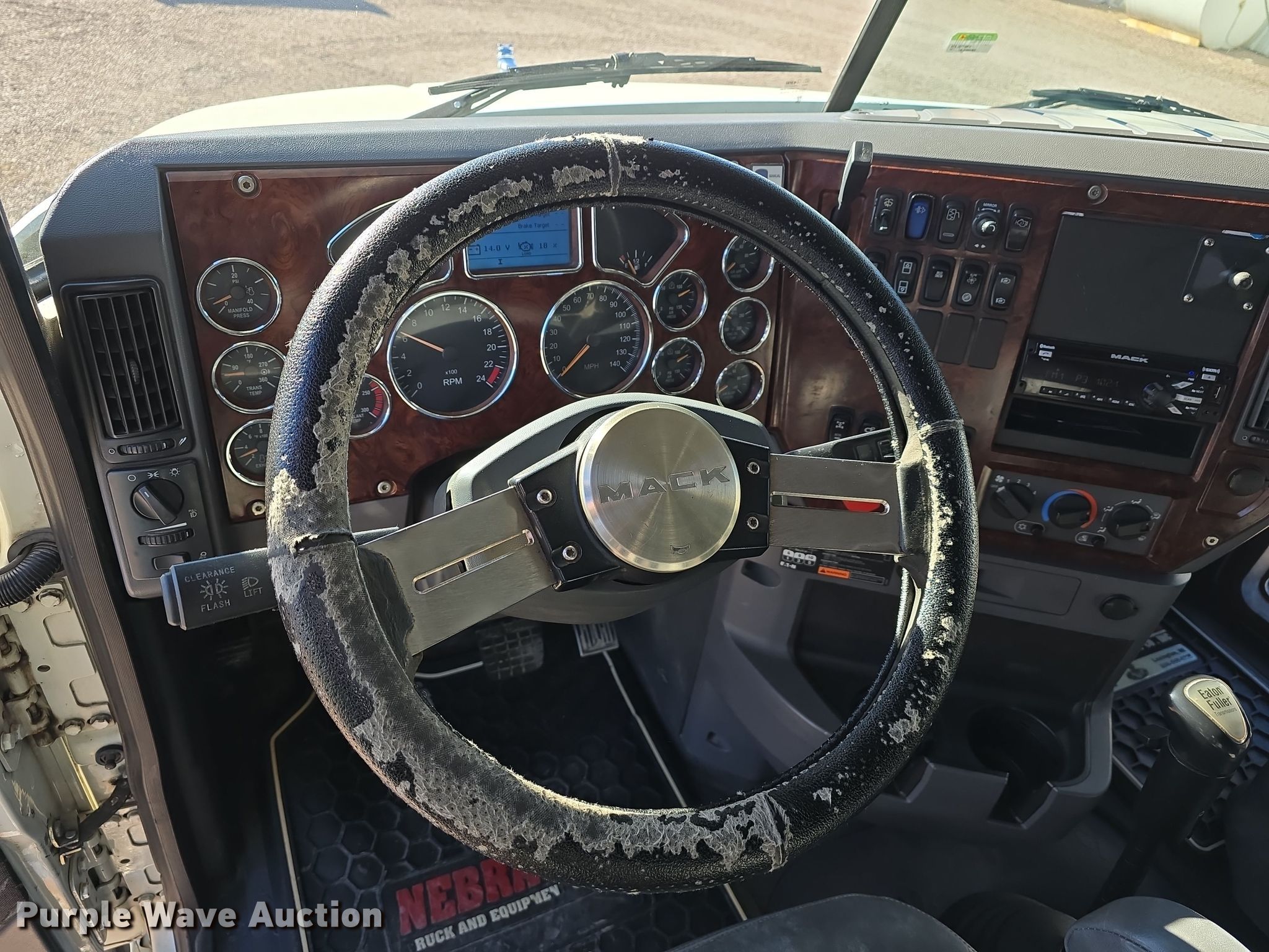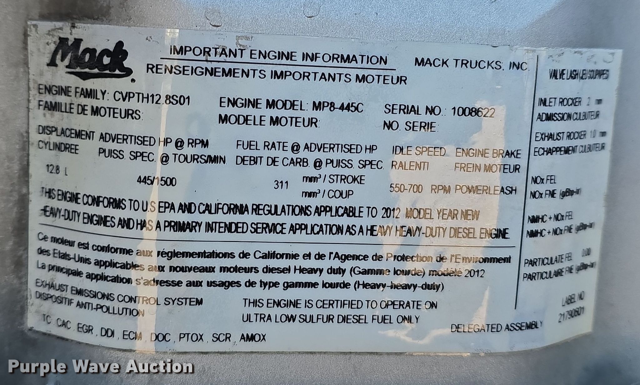 2013 Mack CXU613 semi truck. Miles: 971,393 on odometer, Hours: 22,488 on meter, VIN: 1M1AW07Y4DM033497. Engine Mack MP8-445C, Serial: 1008622, Displacement: 12.8L, Cylinders: 6, Fuel type: Diesel, HP: 445, Engine brake. Transmission Eaton Fuller, Manual, Speed: 10. Chassis Axles: Tandem, Differential lock: Inter-axle, Suspension: Air Dump valves, Brakes: Air, PTO, GVWR: 52,000 lbs FAWR: 12,000 lbs, IAWR: 20,000 lbs, RAWR: 20,000 lbs, Wheelbase: 210". Interior AC, Heat, Heated mirrors, Power windows, Power locks, Cruise control, Air ride cab, Sleeper Sleeper length: 60", Beds: Single, Rear climate control. Features Deck plate: Aluminum, Fifth wheel type: Sliding, Fuel tank: Dual. Tires Size: 11R22.5. Nebraska title. Title distribution may be delayed up to 14 days from verification of funds. Wietfeld Trucking. Leigh, NE 68643