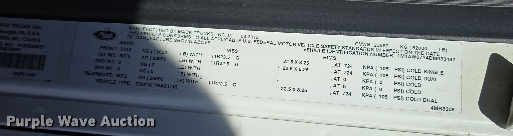 Purple Wave is selling a used Truck Tractor in Nebraska. This item is a 2013 Mack CXU613 semi truck with the following: Miles: 971,393 on odometer, Hours: 22,488 on meter, VIN: 1M1AW07Y4DM033497