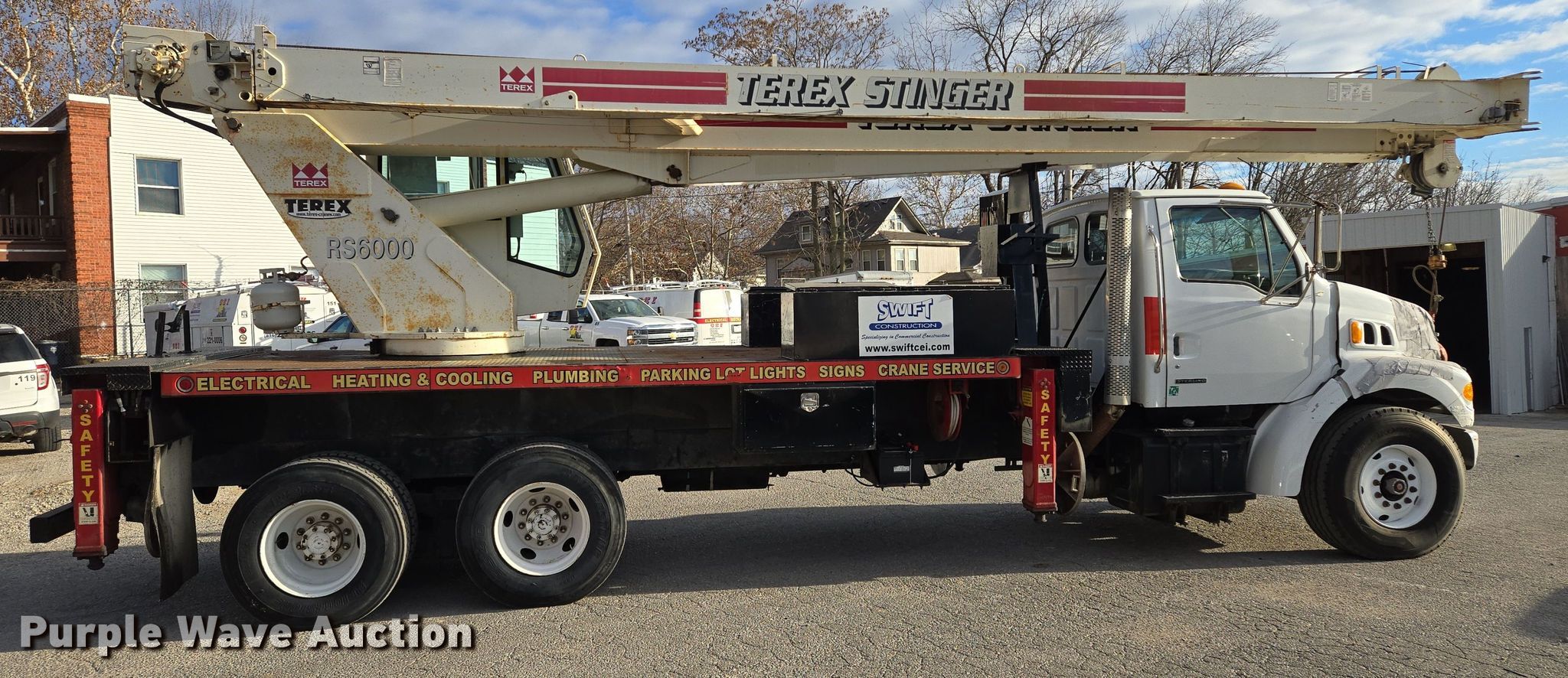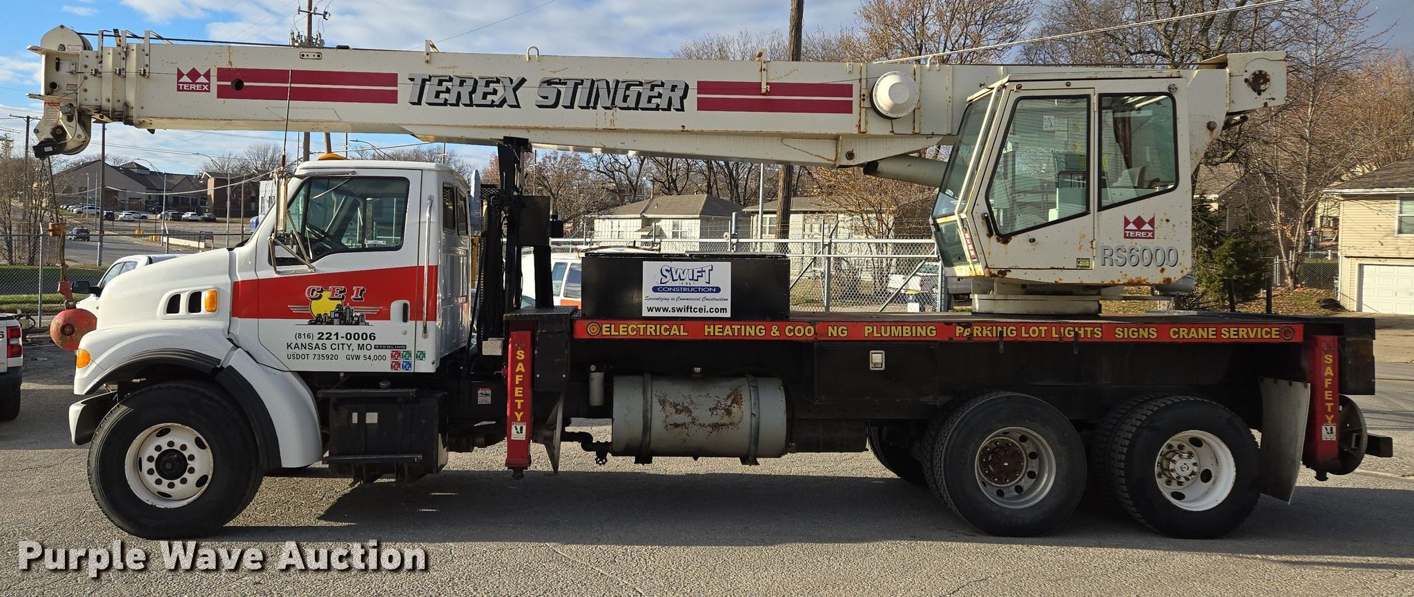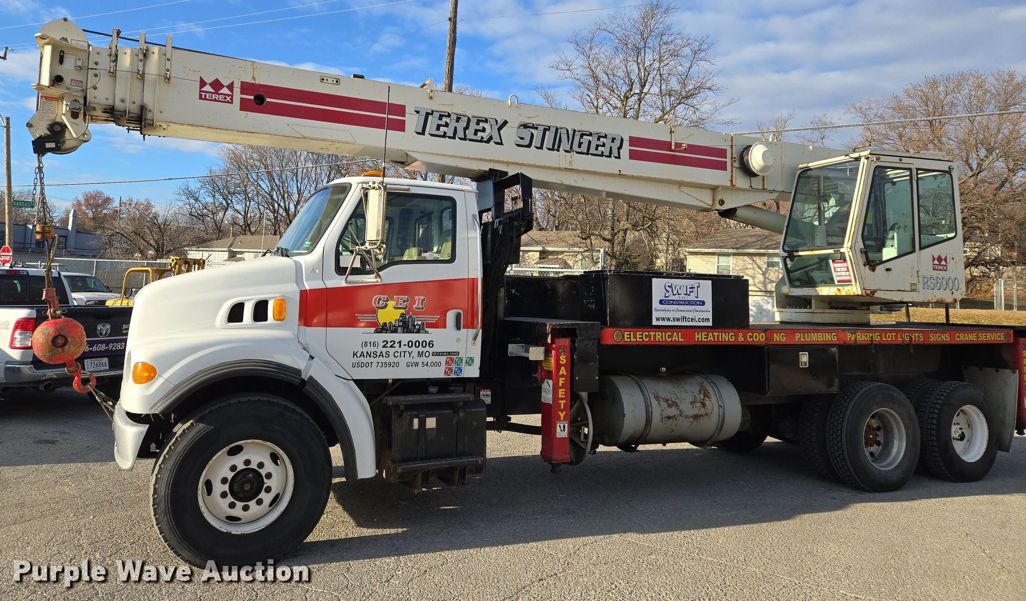 2003 Sterling L7500 crane truck. Miles: 146,754 on odometer, VIN: 2FZHATAK03AL06211. Engine Caterpillar, Displacement: 7.2L, Cylinders: 6, Fuel type: Diesel. Transmission Eaton Fuller, Manual. Chassis Axles: Tandem, Suspension: Spring, Brakes: Air. Operators station Enclosed cab, Crane controls: Stick, Upper interior Crane controls: Stick. Features Boom Terex RO RS60100, Telescopic, Maximum boom length: 100' Sections: 4, Maximum lift capacity: 60,000 lbs, Maximum lift height: 131', Jib: 23', Boom controls In-cab, Ground, Sheaves: 3, Crane ball & hook. Tires Front: 425/65R22.5, Rear: 11R22.5. Missouri title. Title distribution may be delayed up to 14 days from verification of funds. Swift Construction. Kansas City, MO 64127