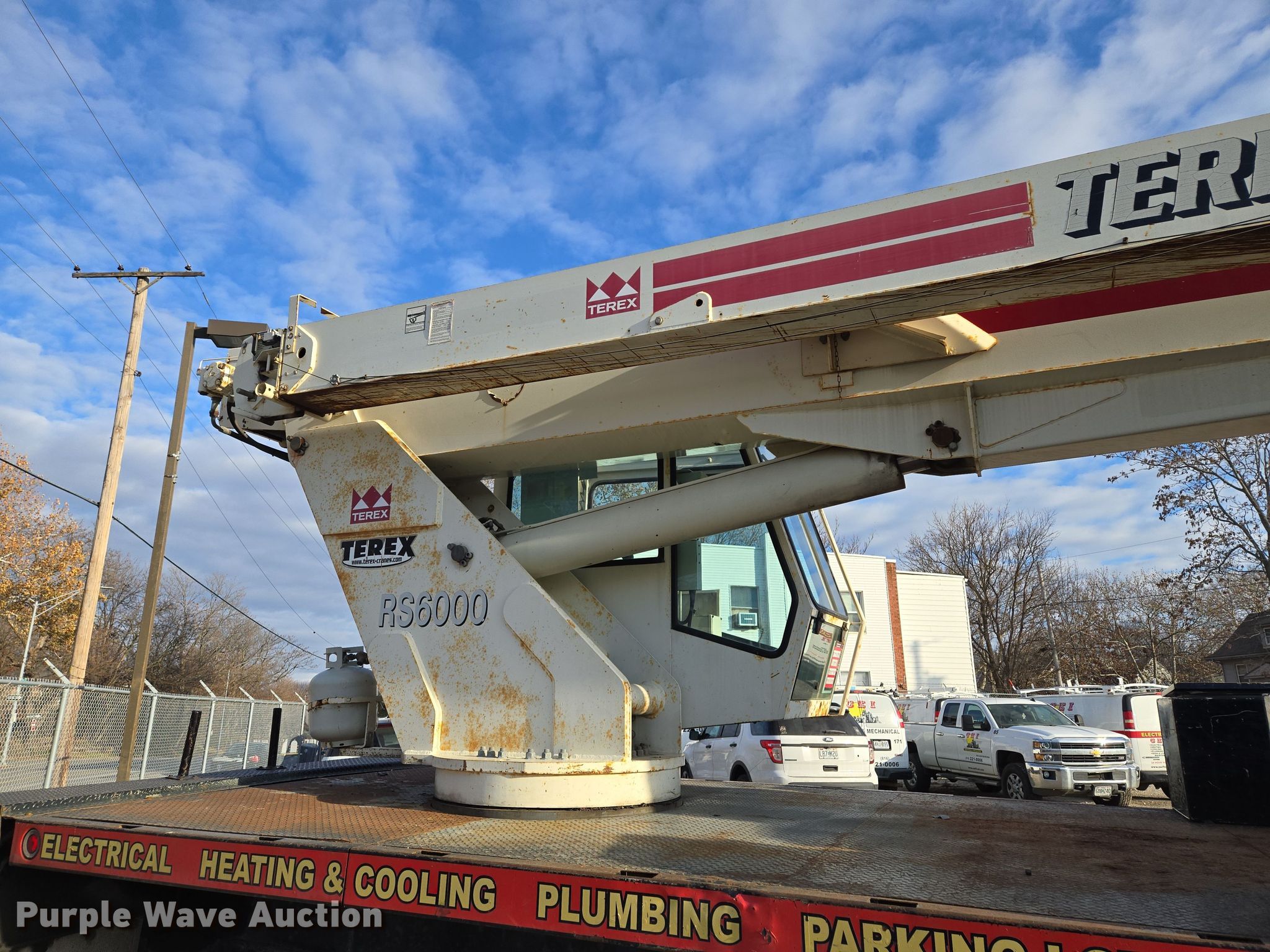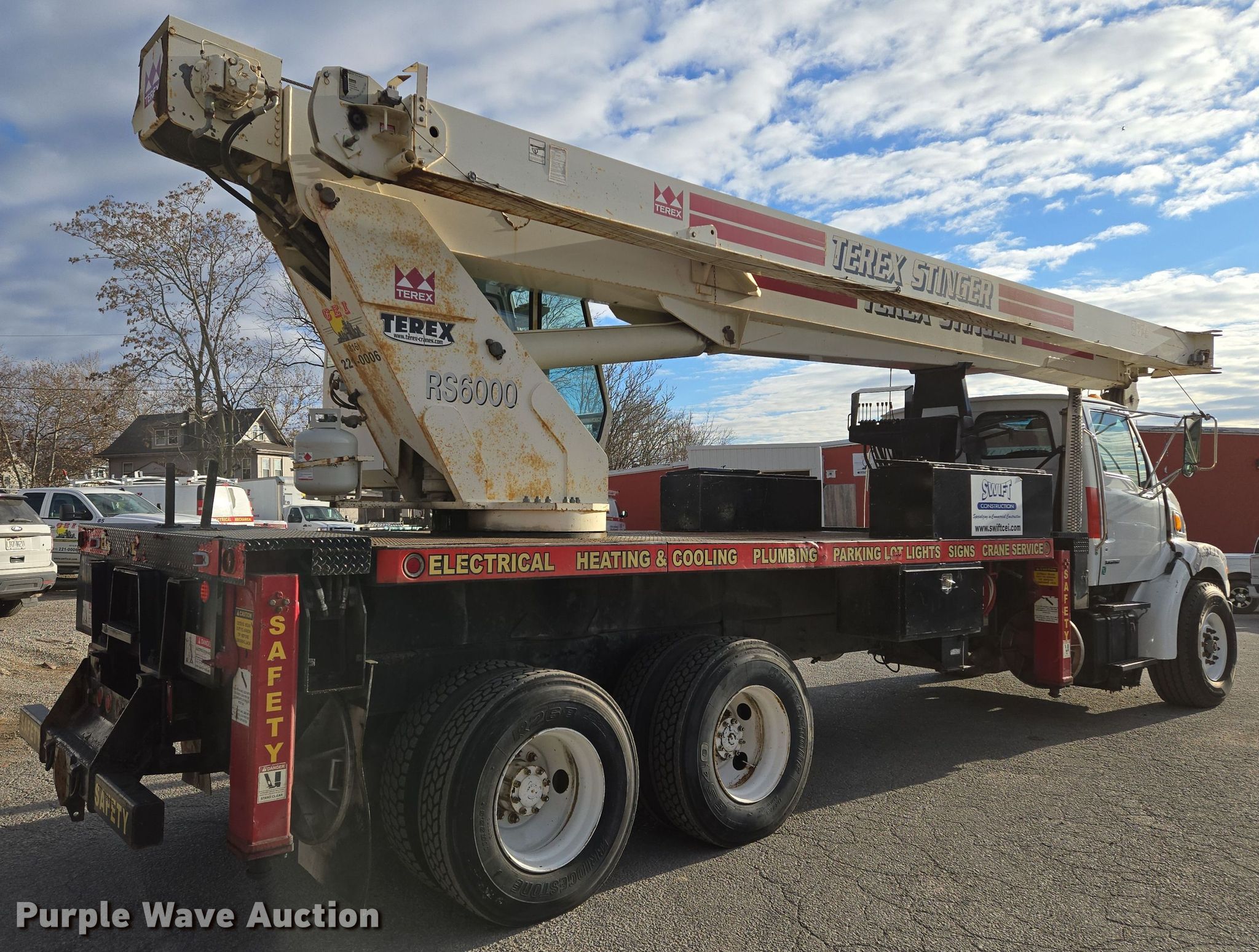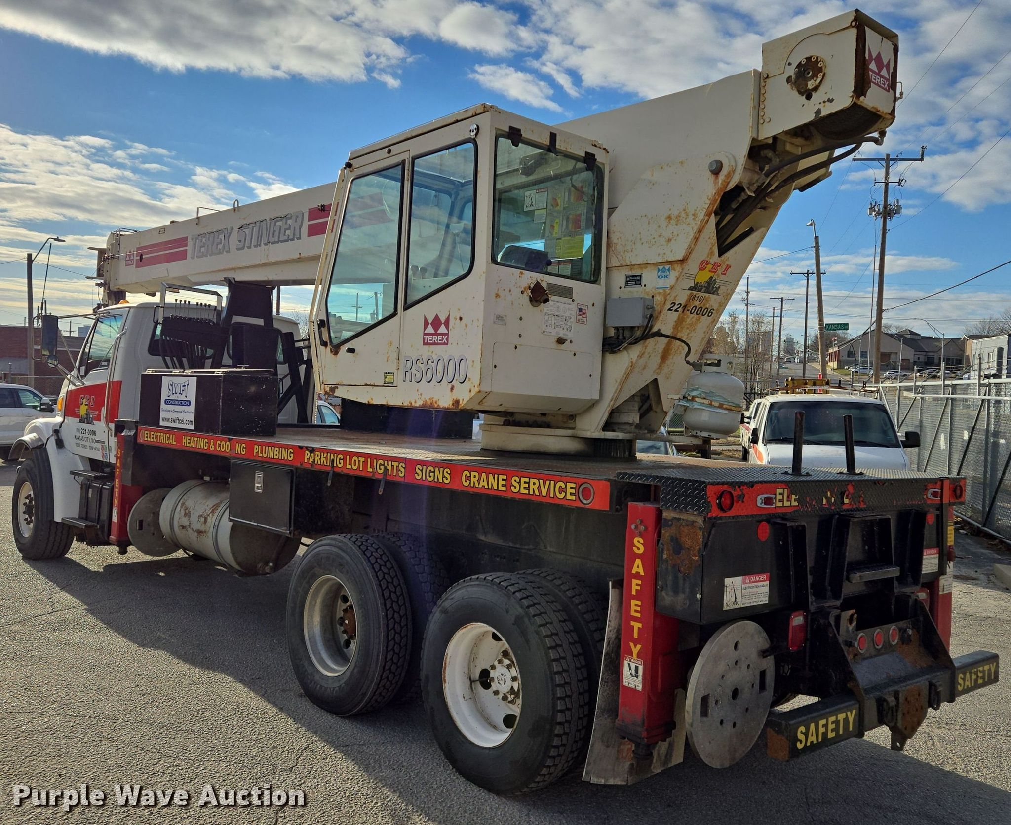 2003 Sterling L7500 crane truck. Miles: 146,754 on odometer, VIN: 2FZHATAK03AL06211. Engine Caterpillar, Displacement: 7.2L, Cylinders: 6, Fuel type: Diesel. Transmission Eaton Fuller, Manual. Chassis Axles: Tandem, Suspension: Spring, Brakes: Air. Operators station Enclosed cab, Crane controls: Stick, Upper interior Crane controls: Stick. Features Boom Terex RO RS60100, Telescopic, Maximum boom length: 100' Sections: 4, Maximum lift capacity: 60,000 lbs, Maximum lift height: 131', Jib: 23', Boom controls In-cab, Ground, Sheaves: 3, Crane ball & hook. Tires Front: 425/65R22.5, Rear: 11R22.5. Missouri title. Title distribution may be delayed up to 14 days from verification of funds. Swift Construction. Kansas City, MO 64127