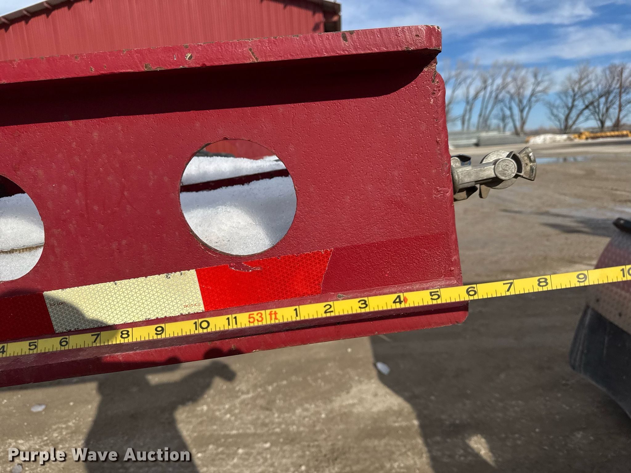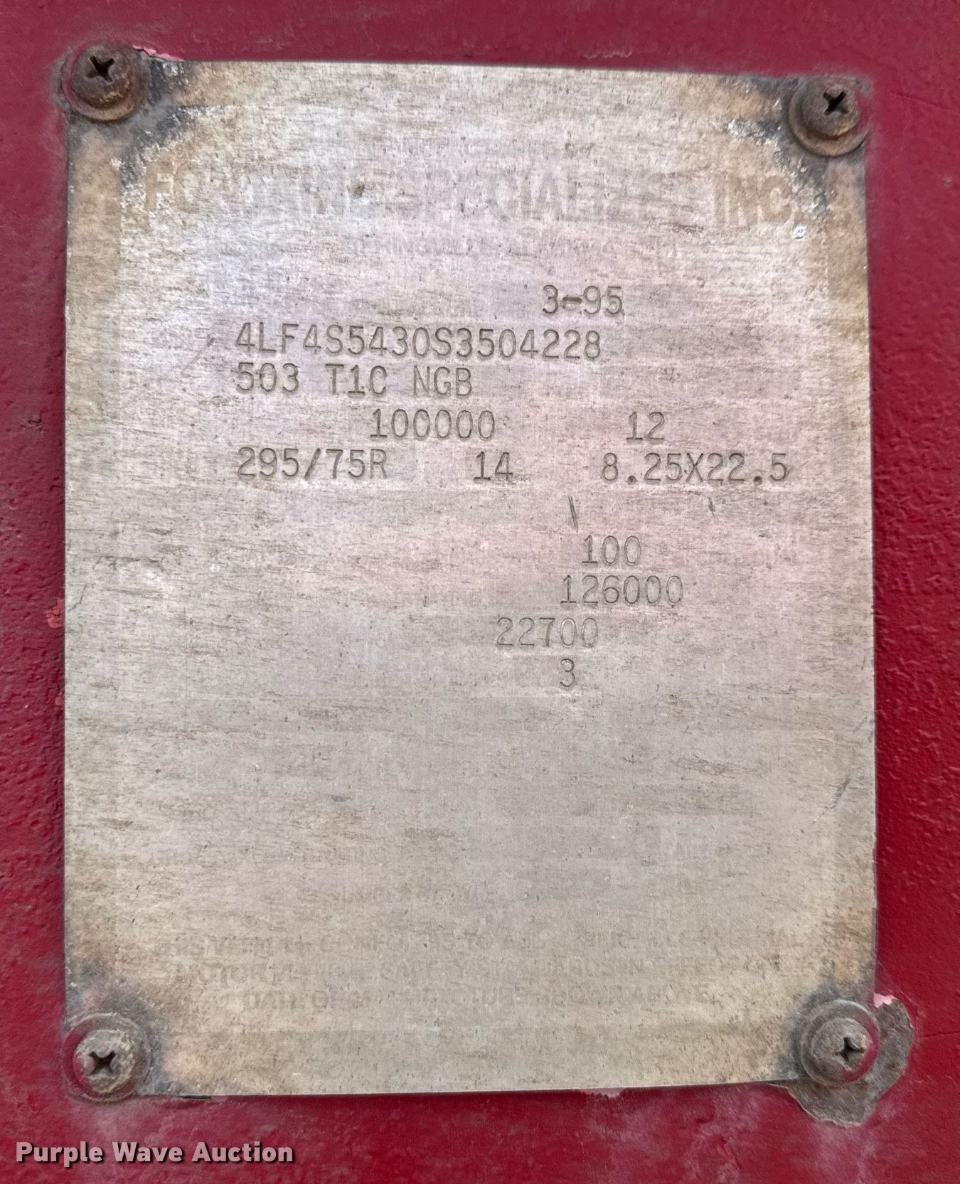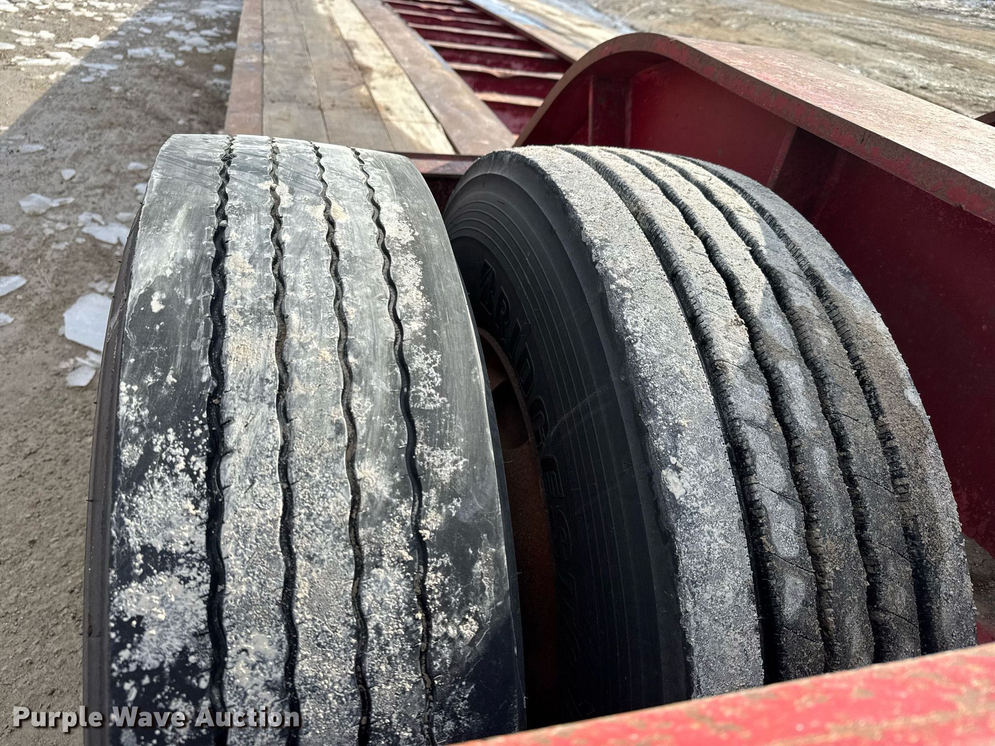 1995 Fontaine 503 T1C NGB lowboy equipment trailer. VIN: 4LF4S5430S3504228. Dimensions Overall: 53' 6" L x 102" W, Deck: 25' 2" L x 102" W. Features Deck type: Steel, Wood, Outriggers: Swing-out, Neck type: Detachable. Chassis Suspension: Air, Brakes: Air, Axles: Triple, GVWR: 126,000 lbs, GAWR: 22,700 lbs. Tires Aluminum wheels, Sizes: 295/75R22.5, 275/70R22.5. Notes Straps, chains, and binders not included. Kansas title. Title distribution may be delayed up to 14 days from verification of funds. Bridges Inc.. Newton, KS 67114