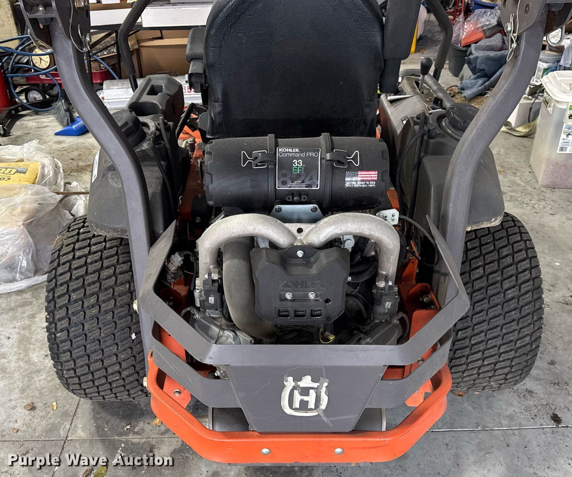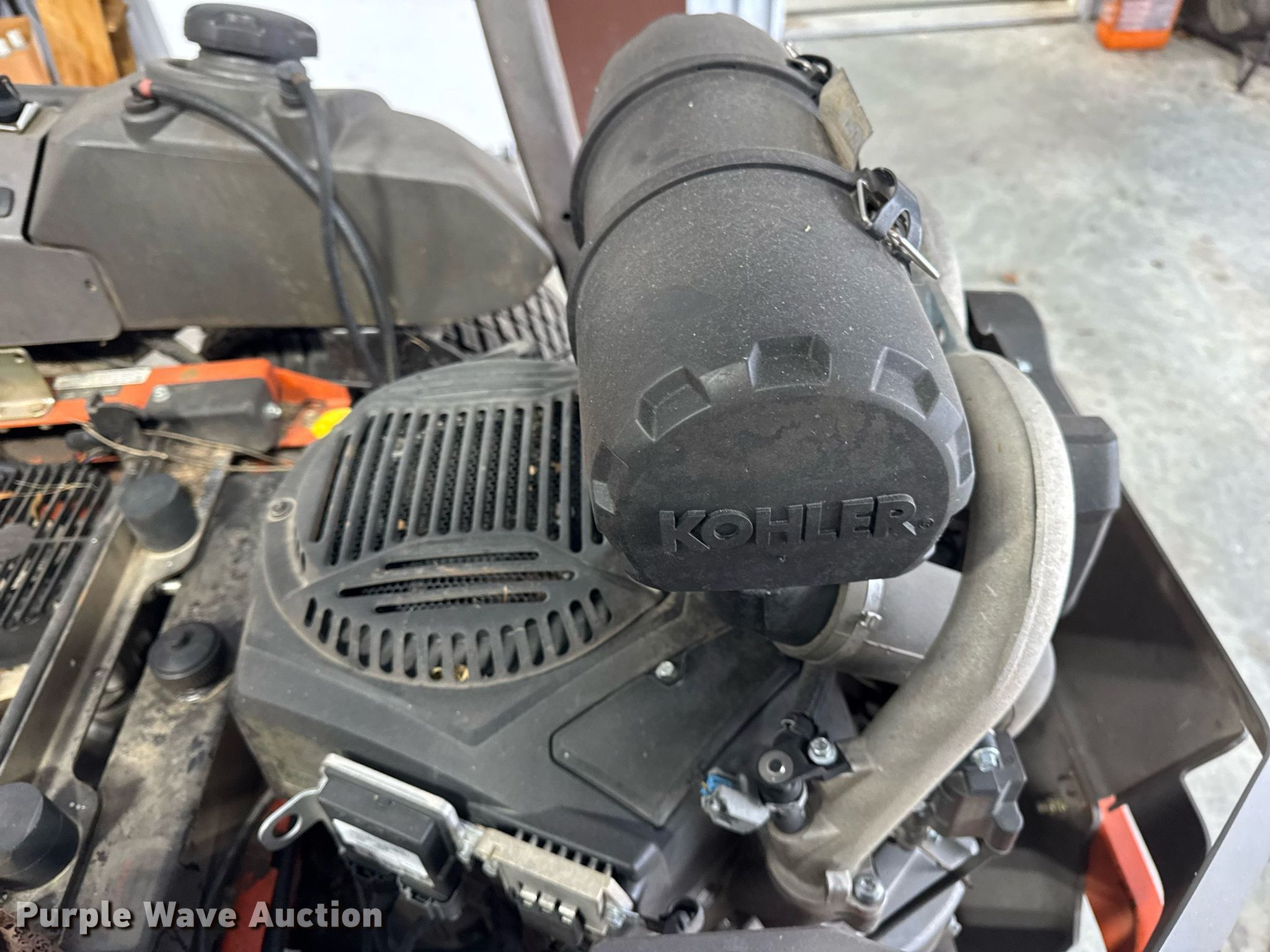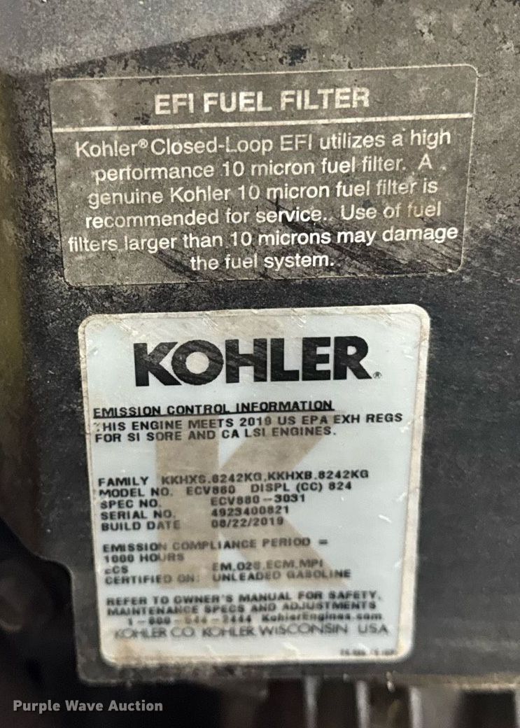 Husqvarna PZ60 ZTR lawn mower. Hours: Unknown, Cutting width: 60", Serial: 022115F001023. Engine Kohler ECV880, Cylinders: 2, Fuel type: Gas, HP: 33. Transmission Hydrostatic. Chassis PTO. Features Mower deck Width: 60". Tires Front: 12x6.50-6/4.50, Rear: 24x12.00-12. Notes Dead battery, Non-operational unit. Pettit Sales. North Vernon, IN 47265