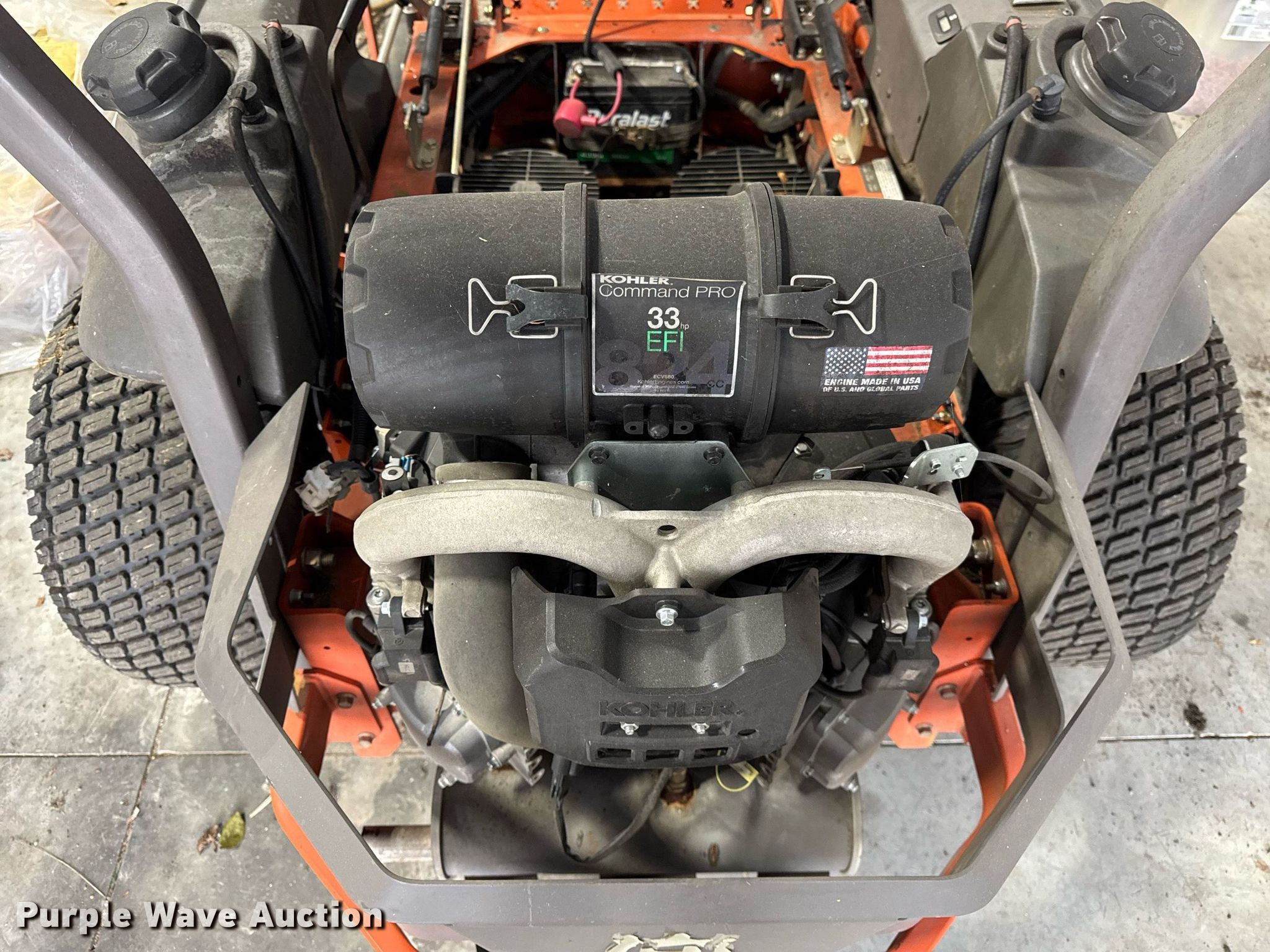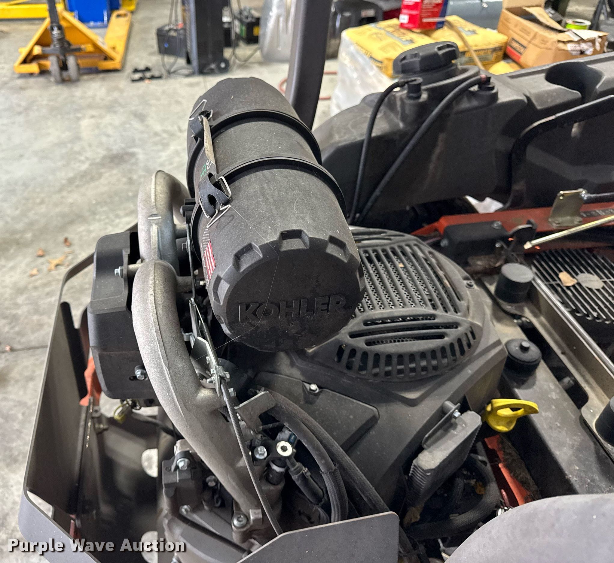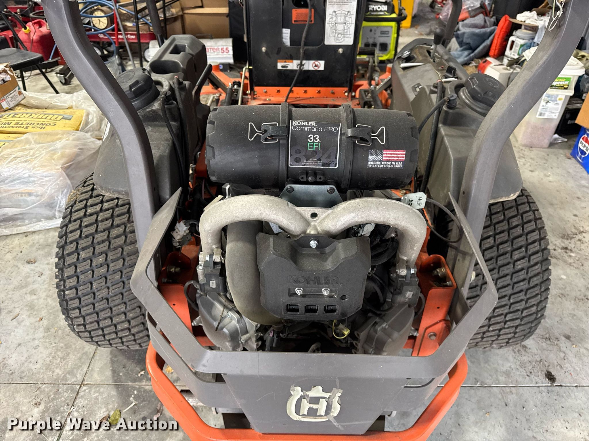 Husqvarna PZ60 ZTR lawn mower. Hours: Unknown, Cutting width: 60", Serial: 022115F001023. Engine Kohler ECV880, Cylinders: 2, Fuel type: Gas, HP: 33. Transmission Hydrostatic. Chassis PTO. Features Mower deck Width: 60". Tires Front: 12x6.50-6/4.50, Rear: 24x12.00-12. Notes Dead battery, Non-operational unit. Pettit Sales. North Vernon, IN 47265