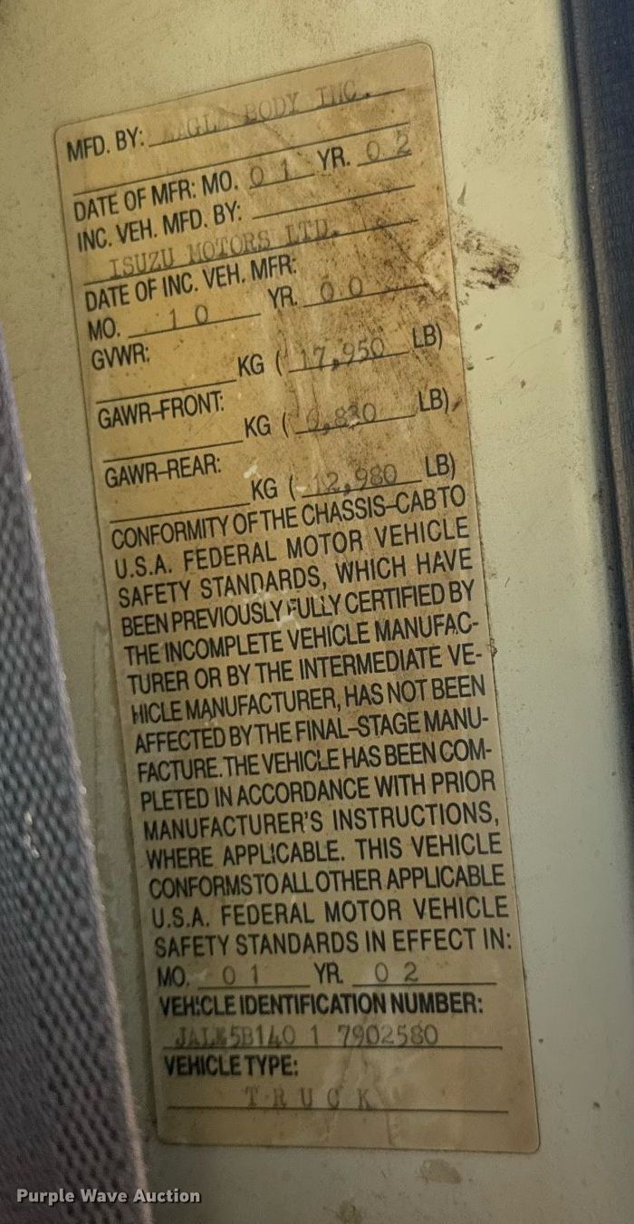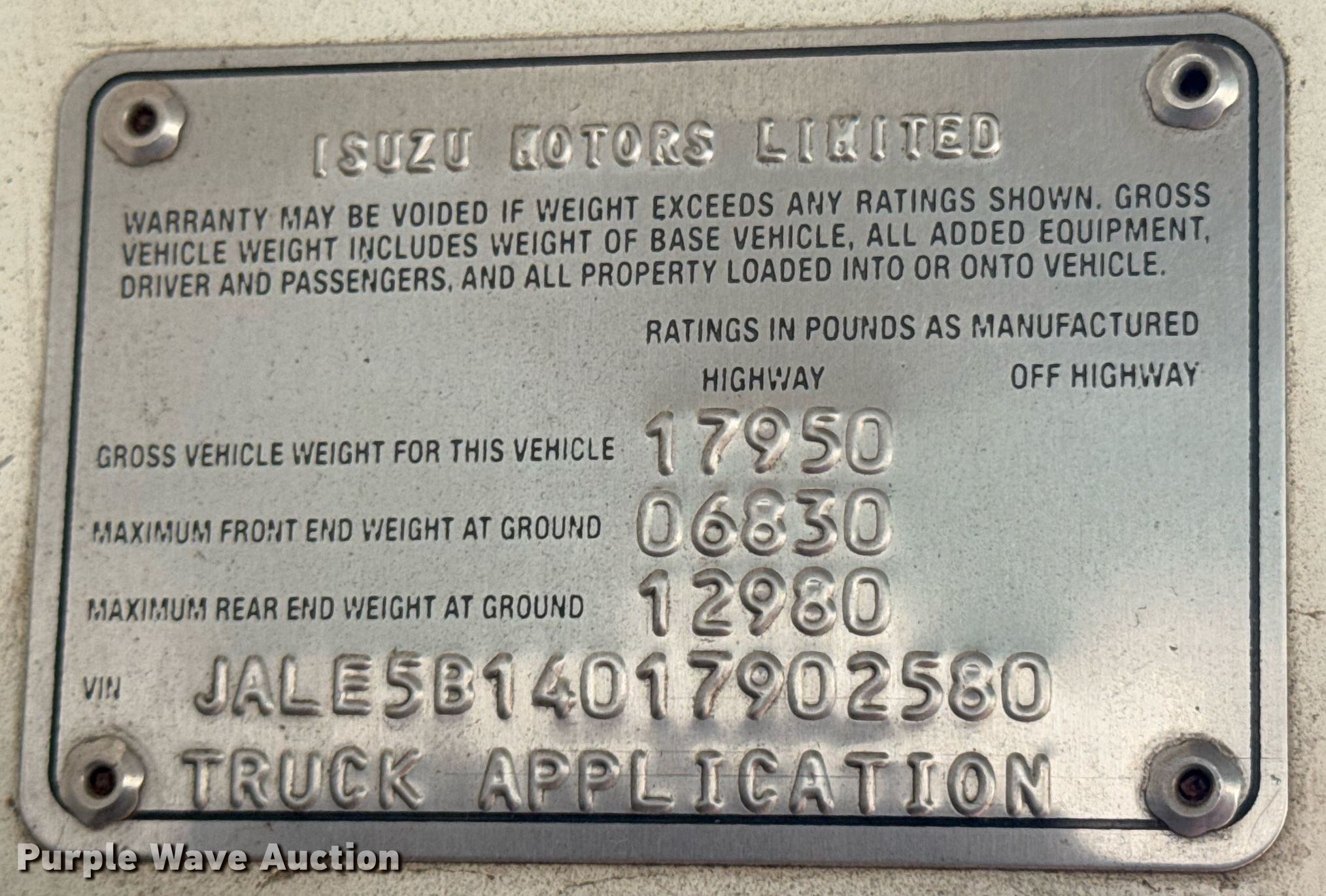 2001 Isuzu NQR flatbed truck. Miles: 203,069 on odometer, VIN: JALE5B14017902580. Engine Isuzu, Displacement: 4.75L, Cylinders: 4, Fuel type: Diesel. Transmission Automatic. Chassis Axles: Single, Suspension: Spring, Brakes: Hydraulic, GVWR: 17,950 lbs. Interior AC, Heat, Power windows, Power locks. Features Flatbed 14' L x 90" W, Removable sides. Tires Size: 225/70R19.5. Notes Dead battery, Unknown operating condition Unit must be towed or hauled. Arkansas title. Title distribution may be delayed up to 14 days from verification of funds. Blue Ribbon Outdoors. Rogers, AR 72758
