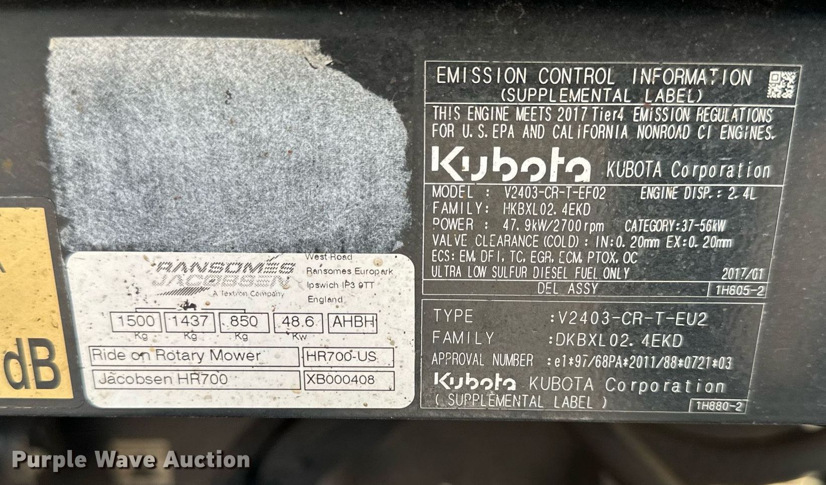 Jacobson HR700 lawn mower. Hours: 3,201 on meter, Cutting width: 168", Serial: XB000408. Engine Kubota, Displacement: 2.4L, Cylinders: 3, Fuel type: Diesel. Transmission Hydrostatic. Chassis Four wheel drive. Features Hydraulic fold decks, Hydraulic front deck lift. Tires Front: 26x12.00-12, Rear: 20x10.00/8. Basehor, KS 66007
