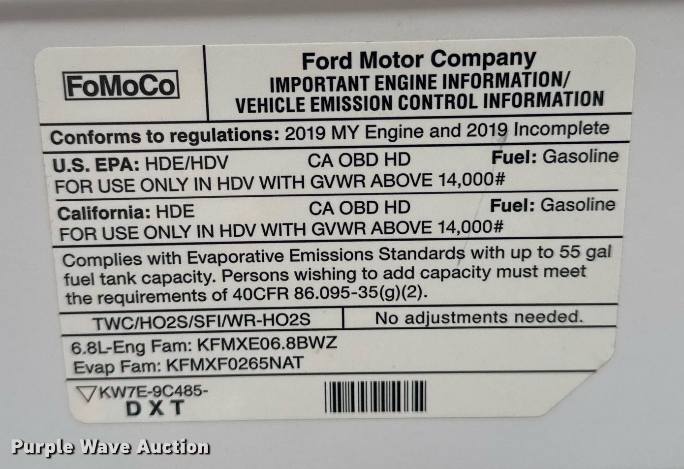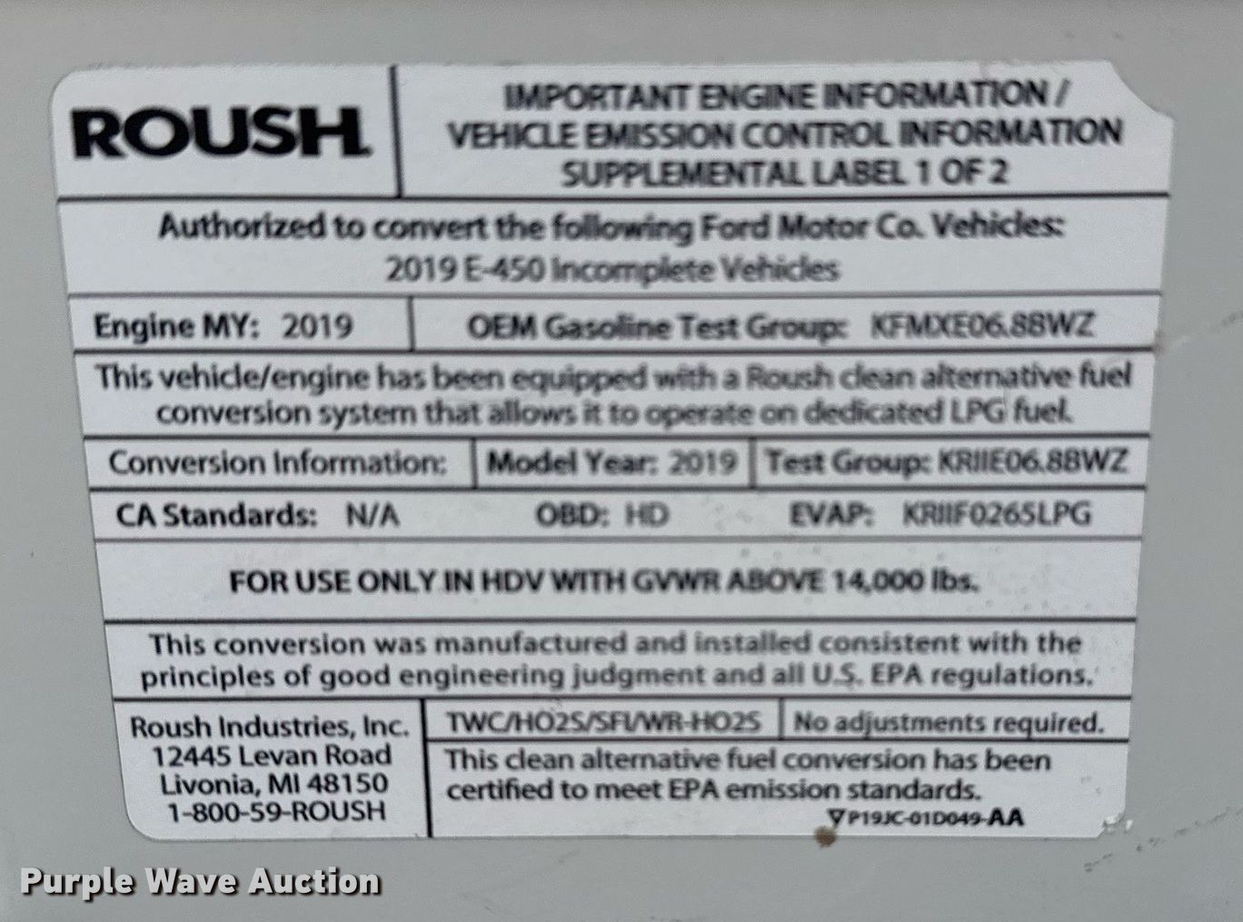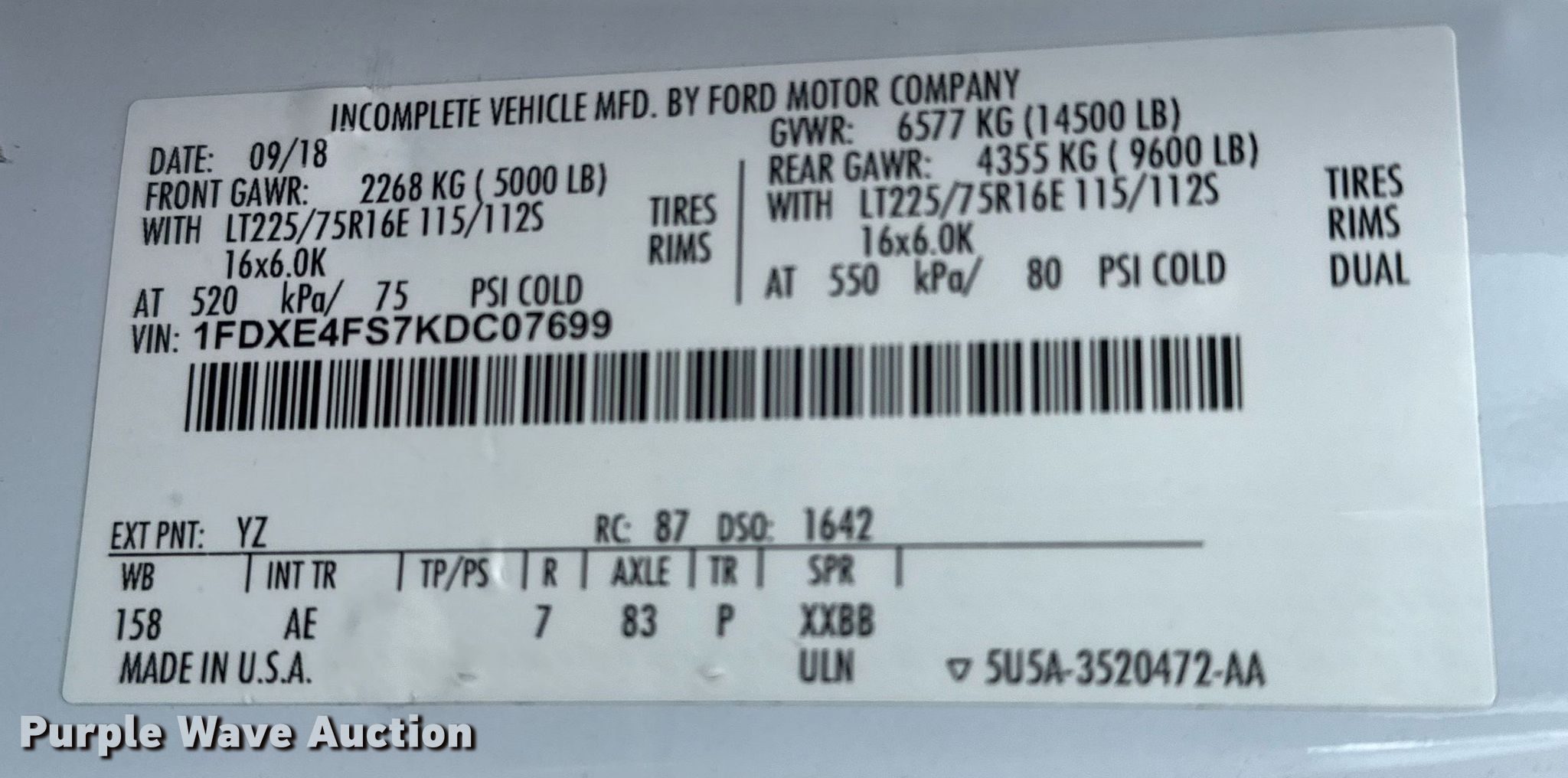 2019 Ford E450 Super Duty refrigerated truck. Miles: 128,742 on odometer, VIN: 1FDXE4FS7KDC07699. Engine Displacement: 6.8L, Cylinders: 8, Fuel type: LPG. Transmission Automatic. Chassis Axles: Single, Suspension: Spring, Brakes: Hydraulic, GVWR: 14,500 lbs, Wheelbase: 158". Interior AC, Heat, Power windows, Power locks. Features Box bed Cold Car, Serial: 46957, 12' L x 85" W x 63" H, Floor: Aluminum, Refrigeration unit 2018 Cold Car.. Tires Size: LT225/75R16. Notes Hood damaged. Oklahoma title. Seller is an Oklahoma licensed motor vehicle dealer. Title will be assigned and distributed by the dealer. Please contact the seller for distribution questions. Title distribution may be delayed up to 30 days from verification of funds. Collinsville, OK 74021