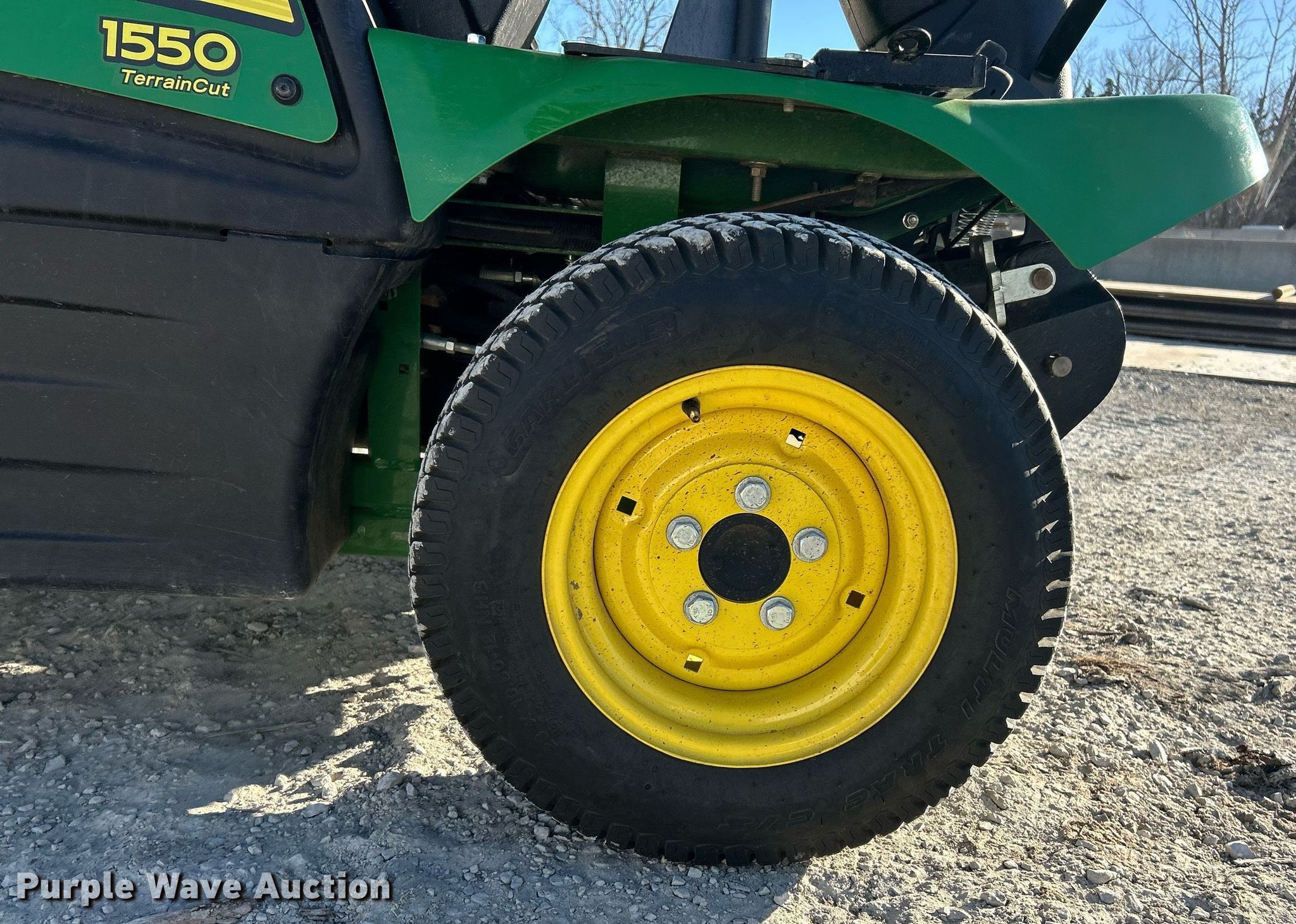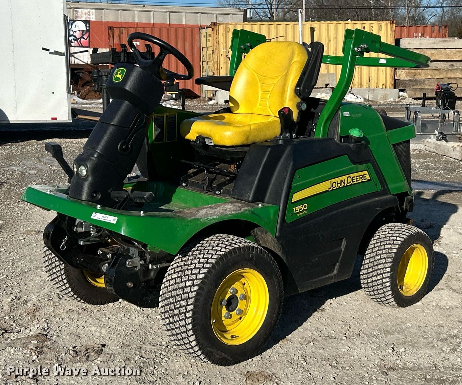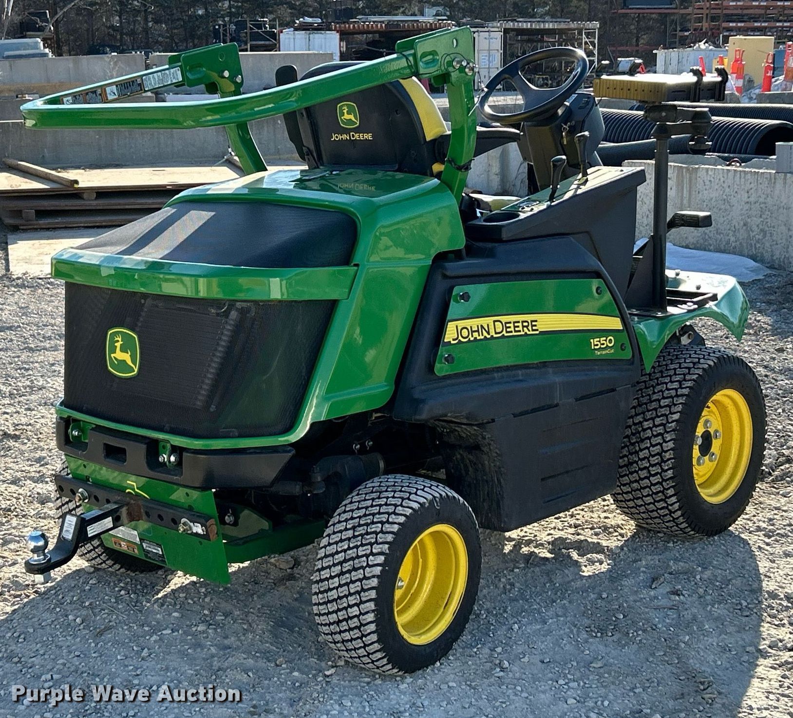 John Deere 1550 Terrain Cut lawn mower. Hours: 158 on meter, Serial: 1TC1550DEHS030214. Engine Yanmar, Displacement: 1.267L, Cylinders: 3, Fuel type: Diesel. Transmission Hydrostatic. Chassis Four wheel drive. Operators station OROPS. Features Hydraulic front deck lift. Tires Front: 23x10.50-12NHS, Rear: 18x8.50-10. Notes Dead battery, Mower deck not included. McCarthy Building Companies Inc. St. Louis, MO 63124