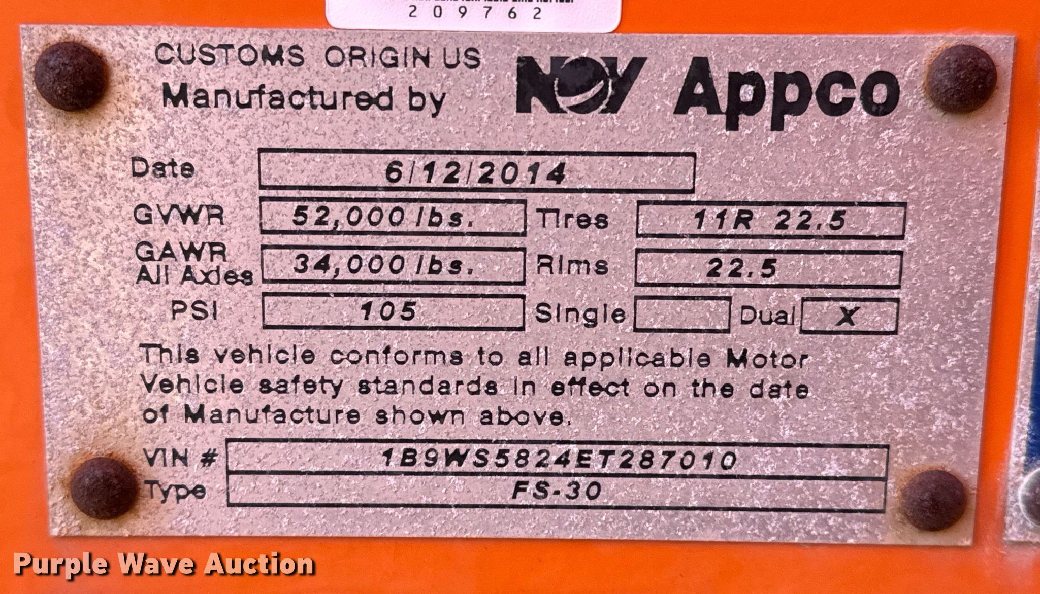 2014 NOV Appco FS-30 frac sander trailer. VIN: 1B9WS5824ET287010, Serial: 38329-00, Unit #: 85747. Dimensions Overall: 58' L x 8' 6" W. Engine Caterpillar C4.4, Displacement: 4.4L, Cylinders: 4, Fuel type: Diesel. Features (4) bins Capacity: 3,000 cu. ft., Self-contained hydraulics, Hydraulic controls: Manual. Chassis Landing gear: Dual, Hydraulic, Suspension: Spring, Brakes: Air, Axles: Tandem, GVWR: 52,000 lbs, GAWR: 34,000 lbs. Tires Steel wheels, Size: 11R22.5. Notes Non-operational hour meter, Non-operational engine, Non-operational unit. Buyer is responsible for all aspects of loadout and removal. Texas title. Title has a lien that will be released following the close of the auction. Title distribution may be delayed up to 60 days from verification of funds. Cisco, TX 76437