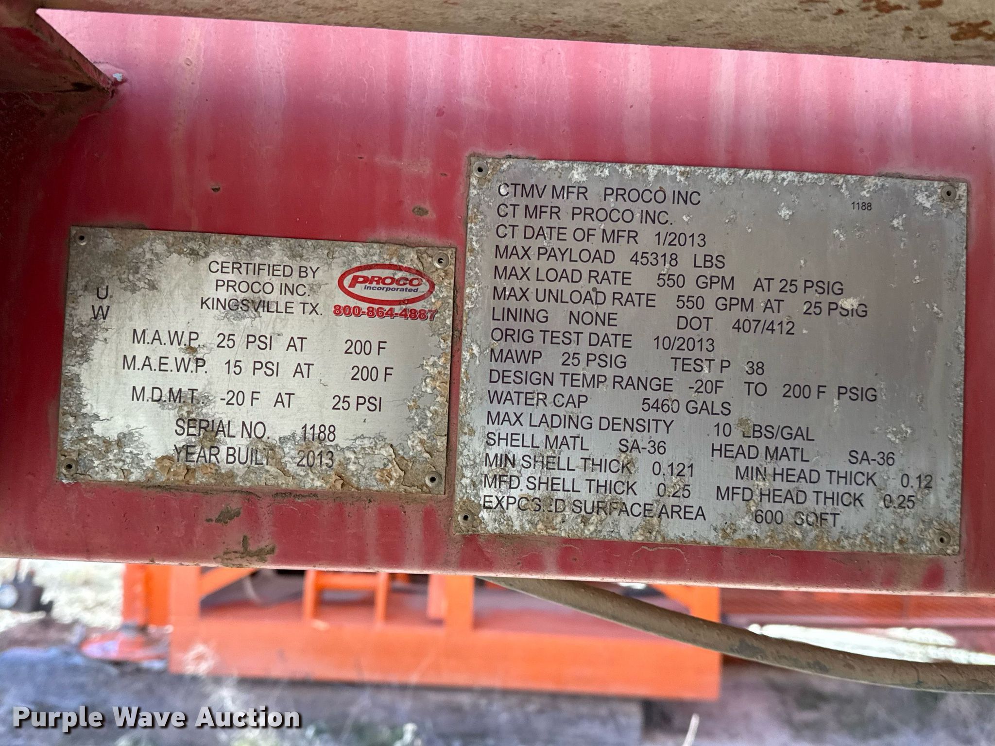 2013 Proco PVT vacuum trailer. VIN: 1P9KD3625DK359122, Unit #: 3001. Dimensions Overall: 40' x 96" W. Features Tank type: Stainless steel Capacity: 5,460 gallons, Thickness: 0.25", Compartments: 2, Outlet valves: 1 Size: 4", No. of manways/manholes: 4 Width: 20", Full length walkway. Chassis Landing gear: Dual, Suspension: Air, Brakes: Air, Axles: Tandem, GVWR: 68,000 lbs, GAWR: 45,000 lbs. Tires Steel wheels, Size: 11R24.5. Buyer is responsible for all aspects of loadout and removal. Texas title. Title has a lien that will be released following the close of the auction. Title distribution may be delayed up to 60 days from verification of funds. Cisco, TX 76437