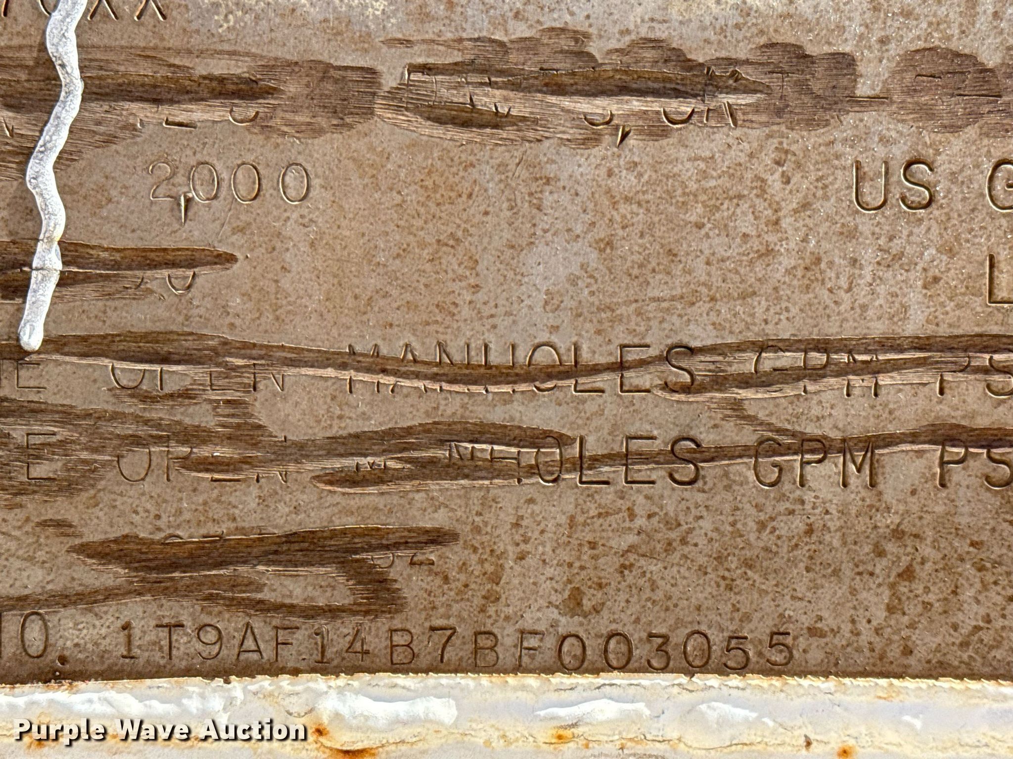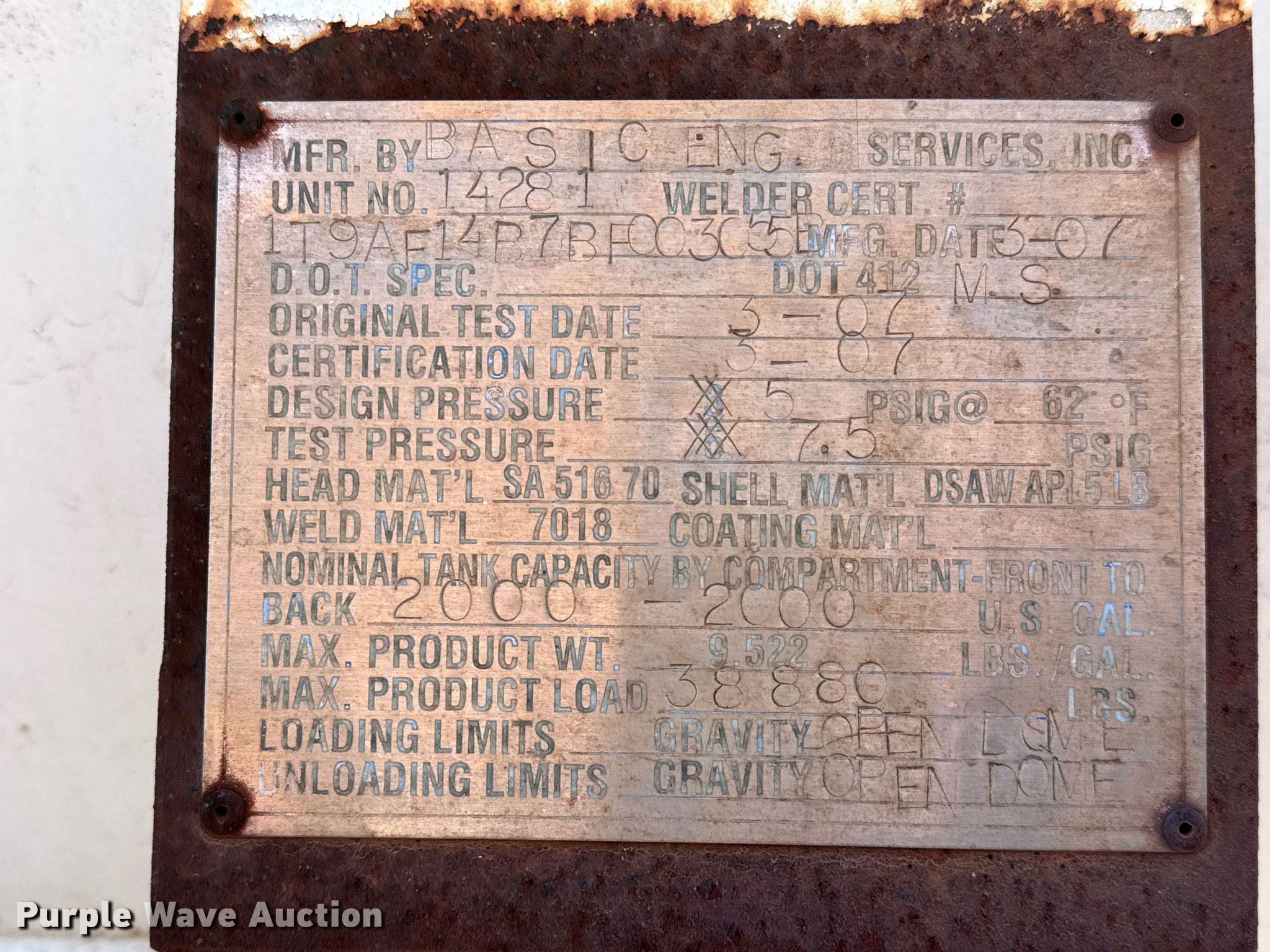 1981 Trailex acid tank trailer. VIN: 1T9AF14B7BF003055. Dimensions Overall: 36' L x 96" W. Features Tank type: Steel Capacity: 4,000 gallons, Compartments: 2, Outlet valves: 2 Size: 4", No. of manways/manholes: 2 Width: 18". Chassis Landing gear: Dual, Suspension: Spring, Brakes: Air, Axles: Tandem. Tires Steel wheels, Size: 11R22.5. Buyer is responsible for all aspects of loadout and removal. Texas title. Title has a lien that will be released following the close of the auction. Title distribution may be delayed up to 60 days from verification of funds. Cisco, TX 76437