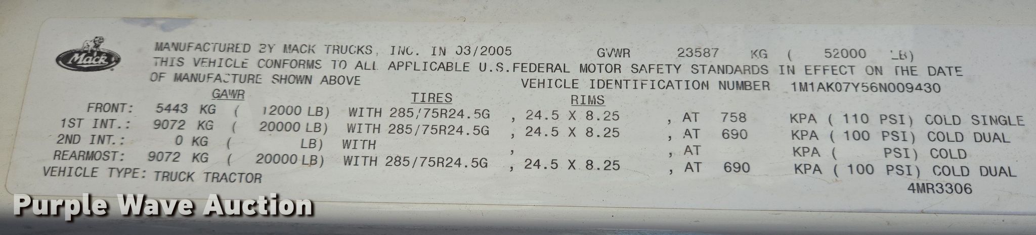 2006 Mack CXN613 semi truck. Miles: Unknown, VIN: 1M1AK07Y56N009430. Engine Mack, Displacement: 12.0L, Cylinders: 6, Fuel type: Diesel, HP: 480, Engine brake. Transmission Eaton Fuller, Manual, Speed: 10. Chassis Axles: Tandem, Differential lock: Inter-axle, Suspension: Air Dump valves, Brakes: Air, PTO, GVWR: 52,000 lbs FAWR: 12,000 lbs, IAWR: 20,000 lbs, RAWR: 20,000 lbs, Wheelbase: 220". Interior AC, Heat, Heated mirrors, Cruise control, Air ride cab, Sleeper Sleeper length: 60", Beds: Single, Rear climate control. Features Fifth wheel type: Air operated, Sliding, Fuel tank: Dual. Tires Size: 275/70R22.5. Notes Battery missing, Hydraulic lines disconnected, Rear tires missing, Unknown operating condition. Buyer is responsible for all aspects of loadout and removal. Texas title. Mileage has not been verified. Odometer discrepancy will be marked on the title. Title has a lien that will be released following the close of the auction. Title distribution may be delayed up to 45 days from verification of funds. Cisco, TX 76437