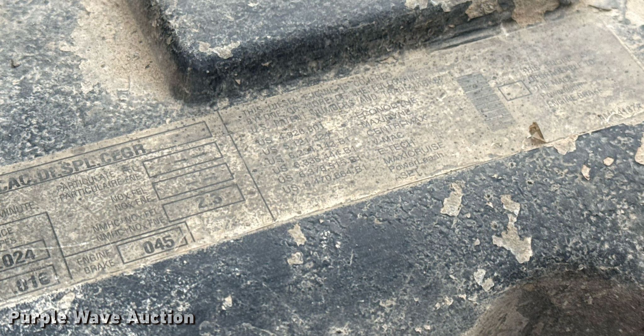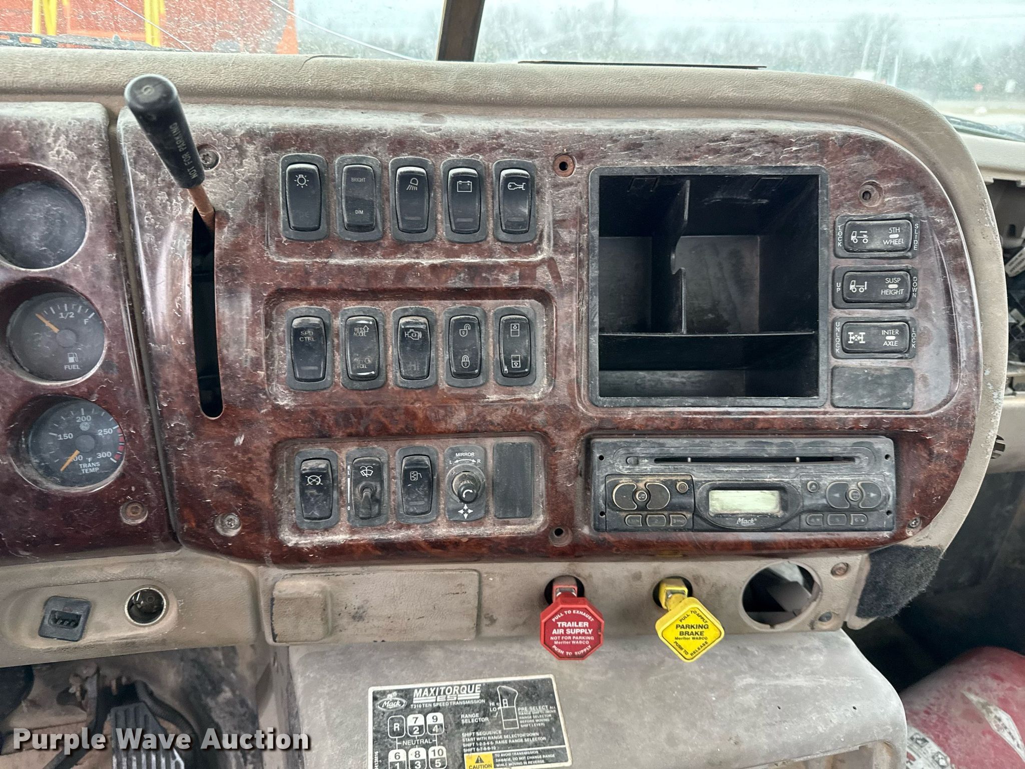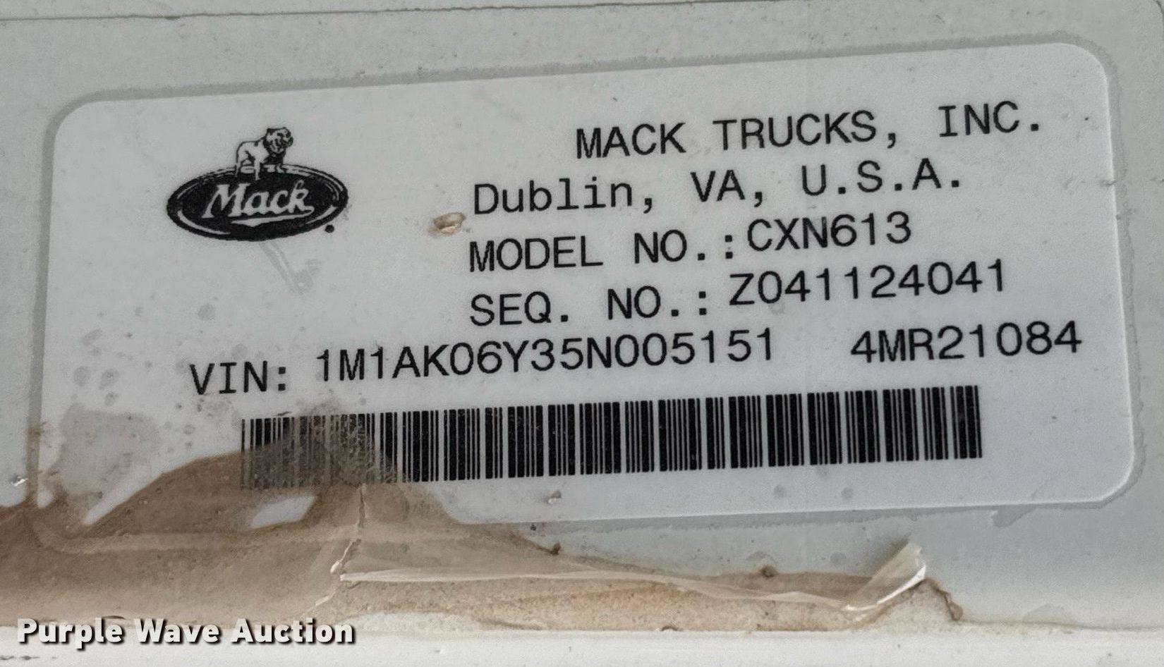 2005 Mack CXN613 semi truck. Miles: 346,118 on odometer, Hours: 18,124 on meter, VIN: 1M1AK06Y35NOO5151, Unit #: TT-27474. Engine Mack AC-427, Serial: 4Y0230, Displacement: 12.0L, Cylinders: 6, Fuel type: Diesel, HP: 427, Engine brake. Transmission Mack Maxitorque ES T310, Manual, Speed: 10. Chassis Axles: Tandem, Differential lock: Inter-axle, Suspension: Air Dump valves, Brakes: Air, PTO, Wet kit, GVWR: 49,680 lbs FAWR: 11,680 lbs, IAWR: 19,000 lbs, RAWR: 19,000 lbs. Interior AC, Heat, Heated mirrors, Cruise control, Air ride cab. Features Fifth wheel type: Air operated, Sliding, Fuel tank: Dual. Tires Size: 11R22.5. Notes Windshield chipped or cracked, Dead battery, Possible engine issues, turns over but will not start , Non-operational unit Unit must be towed or hauled. Buyer is responsible for all aspects of loadout and removal. Texas title. Title has a lien that will be released following the close of the auction. Title distribution may be delayed up to 45 days from verification of funds. Gainesville, TX 76240