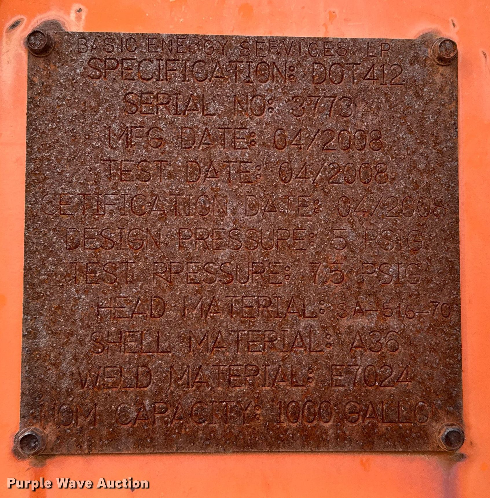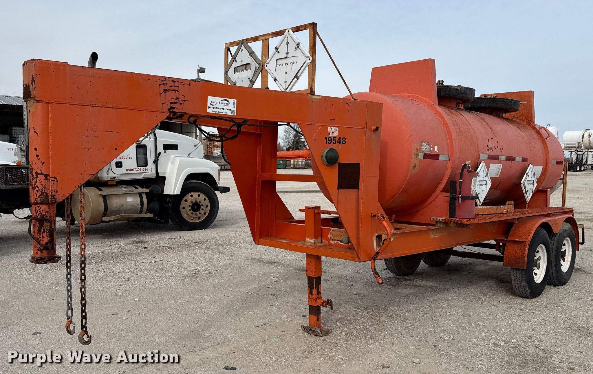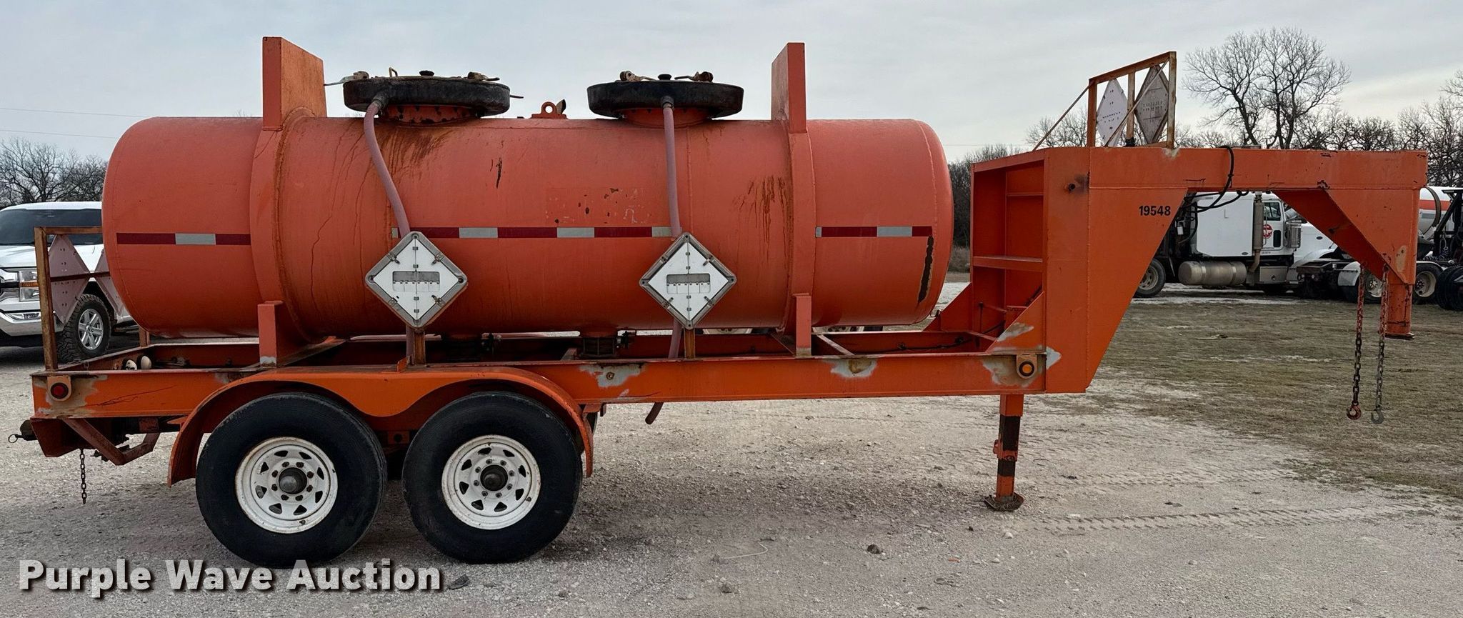 2004 Shop built acid tank trailer. VIN: 041624302B, Unit #: PT-19548. Dimensions Overall: 24' L x 70" W. Features Tank type: Steel Capacity: 1,000 gallons, Compartments: 2, Outlet valves: 1 Size: 4", No. of manways/manholes: 2 Width: 16". Chassis Hitch: Gooseneck, Landing gear: Single, Suspension: Spring, Axles: Tandem. Tires Steel wheels, Size: 7.50R16. Notes Manway/manhole issues, will not open. Buyer is responsible for all aspects of loadout and removal. Texas title. Title has a lien that will be released following the close of the auction. Title distribution may be delayed up to 45 days from verification of funds. Gainesville, TX 76240
