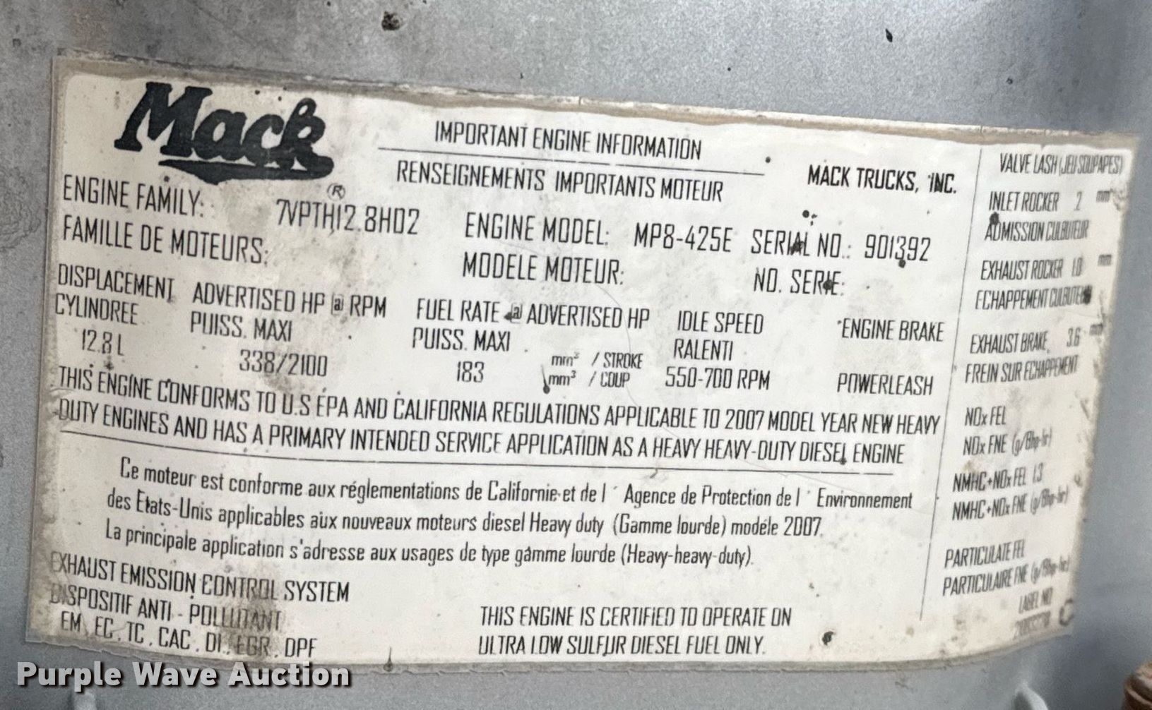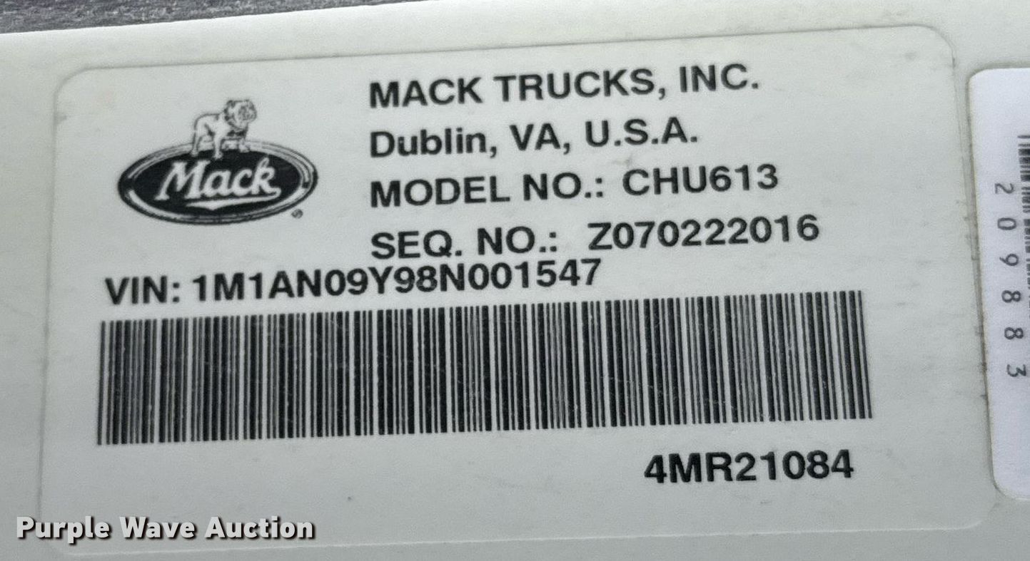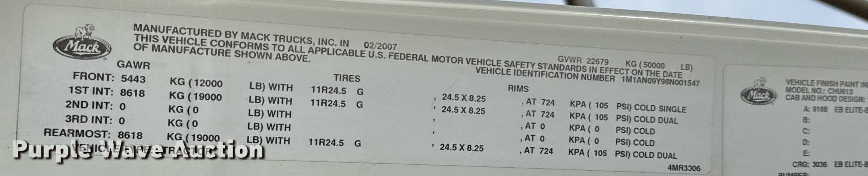 2008 Mack CHU613 semi truck. Miles: Unknown, VIN: 1M1AN09Y98N001547, Unit #: TT-25733. Engine Mack MP8-425E, Serial: 901392, Displacement: 12.8L, Cylinders: 6, Fuel type: Diesel, HP: 338, Engine brake. Transmission Eaton Fuller, Manual, Speed: 13. Chassis Axles: Tandem, Differential lock: Inter-axle, Suspension: Air Dump valves, Brakes: Air, GVWR: 50,000 lbs FAWR: 12,000 lbs, IAWR: 19,000 lbs, RAWR: 19,000 lbs. Interior AC, Heat, Cruise control, Air ride cab. Features Deck plate: Aluminum, Steel, Fifth wheel type: Air operated, Sliding, Fuel tank: Dual. Tires Size: 11R24.5. Notes Dash cluster disassembled, parts may be missing, Windshield chipped or cracked, Non-operational unit Unit must be towed or hauled. Buyer is responsible for all aspects of loadout and removal. Texas title. Mileage has not been verified. Odometer discrepancy will be marked on the title. Title has a lien that will be released following the close of the auction. Title distribution may be delayed up to 45 days from verification of funds. Gainesville, TX 76240