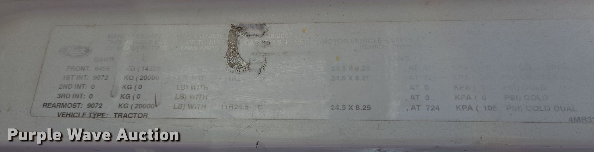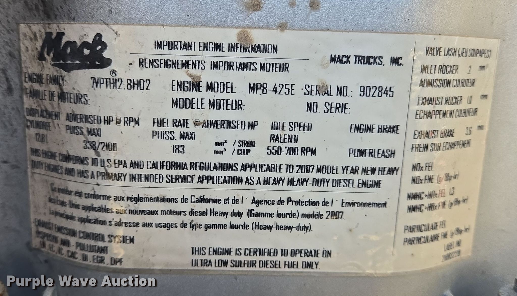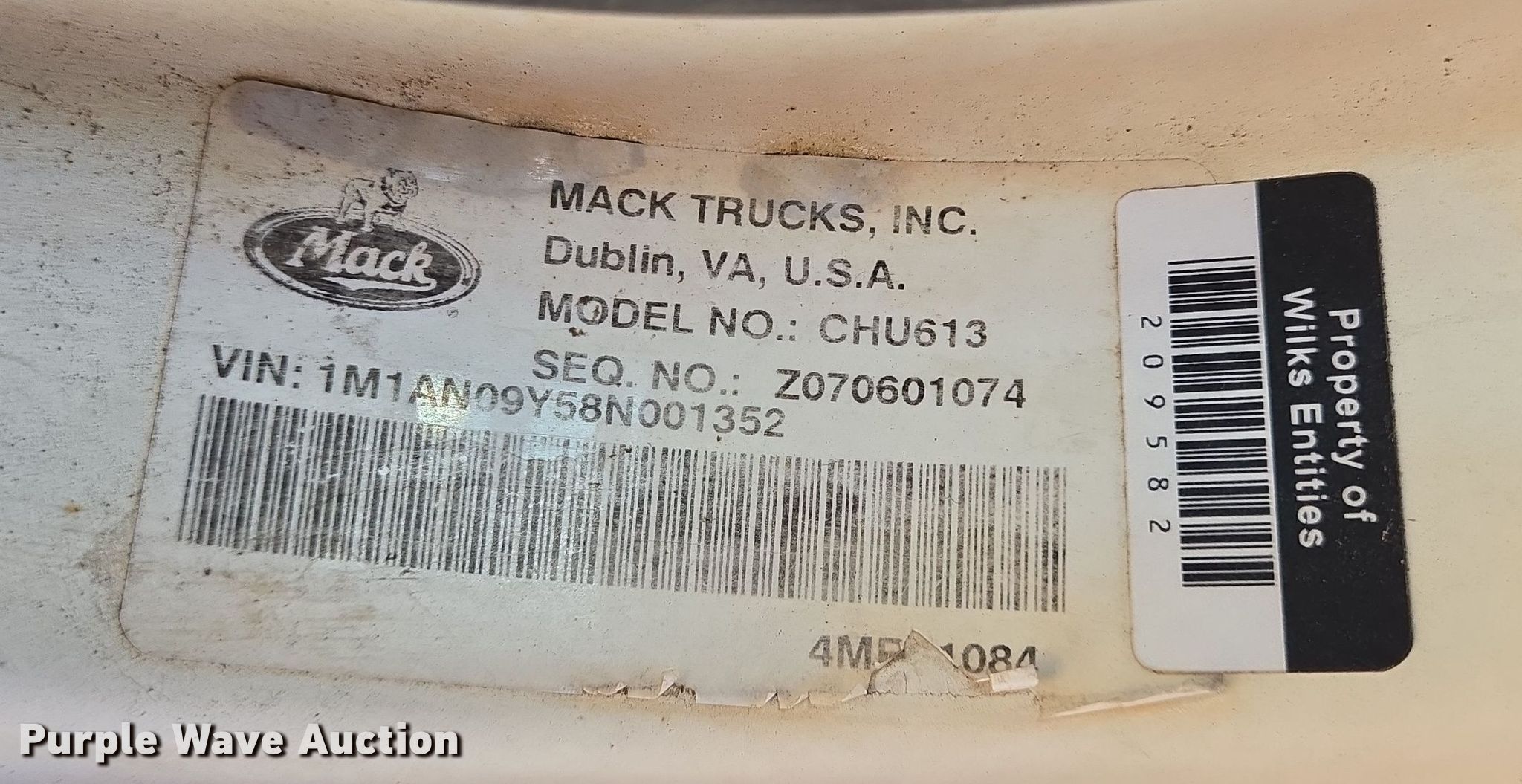 2008 Mack CHU613 truck cab and chassis. Miles: Unknown, VIN: 1M1AN09Y58N001352. Engine Mack MP8, Serial: 902845, Displacement: 12.8L, Cylinders: 6, Fuel type: Diesel, HP: 338, Engine brake. Transmission Eaton Fuller, Manual, Speed: 13. Chassis Axles: Tandem, Differential lock: Inter-axle, Suspension: Air Dump valves, Brakes: Air, PTO, Wet kit, Truck chassis: 15' 8", GVWR: 54,320 lbs FAWR: 14,320 lbs, IAWR: 20,000 lbs, RAWR: 20,000 lbs, Wheelbase: 220". Interior AC, Heat, Heated mirrors, Cruise control, Air ride cab. Features Fuel tank: Dual. Tires Size: 11R24.5. Notes Battery missing, Non-operational PTO Parts may be missing, Headlight missing, Unknown operating condition. Buyer is responsible for all aspects of loadout and removal. Texas title. Mileage has not been verified. Odometer discrepancy will be marked on the title. Title has a lien that will be released following the close of the auction. Title distribution may be delayed up to 45 days from verification of funds. Cisco, TX 76437