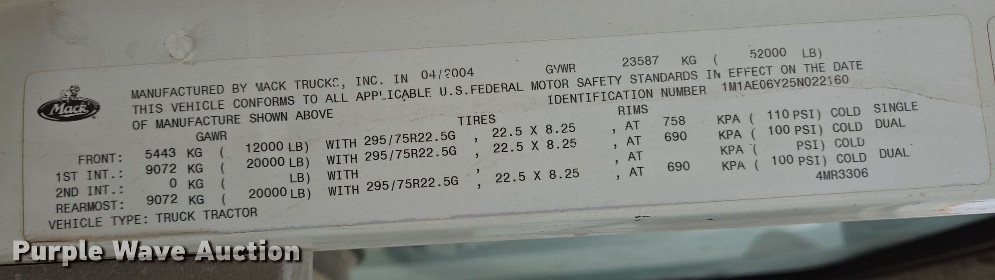 2005 Mack CX613 semi truck. Miles: 526,668 on odometer, Hours: 30,195 on meter, VIN: 1M1AE06Y25N022160. Engine Mack, Displacement: 12.0L, Cylinders: 6, Fuel type: Diesel, Engine brake. Transmission Mack MaxiTorque ES, Manual, Speed: 10. Chassis Axles: Tandem, Differential lock: Inter-axle, Suspension: Air Dump valves, Brakes: Air, GVWR: 52,000 lbs FAWR: 12,000 lbs, IAWR: 20,000 lbs, RAWR: 20,000 lbs, Wheelbase: 209". Interior AC, Heat, Heated mirrors, Cruise control, Air ride cab, Sleeper Sleeper length: 40", Beds: Single, Rear climate control. Features Deck plate: Steel, Fifth wheel type: Air operated, Sliding, Fuel tank: Dual. Tires Size: 11R22.5. Notes Dead battery, Driveline disconnected, Unknown operating condition Unit must be towed or hauled. Buyer is responsible for all aspects of loadout and removal. Texas title. Title has a lien that will be released following the close of the auction. Title distribution may be delayed up to 45 days from verification of funds. Midland, TX 79705