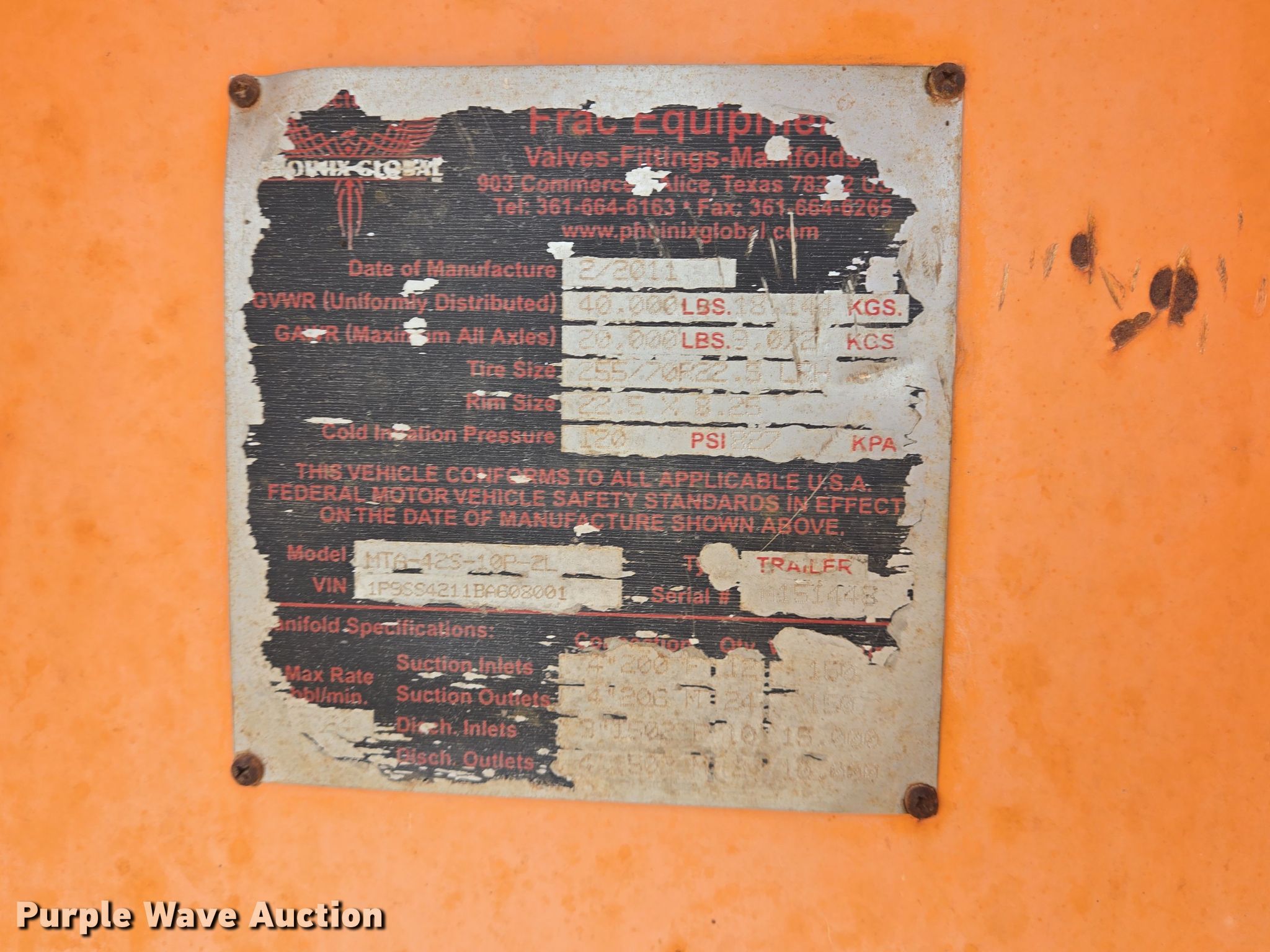 2011 Phoinix Global frac manifold trailer. VIN: 1P9SS4211BA608001, Unit #: 36253. Dimensions Overall: 46' L x 96" W. Chassis Landing gear: Dual, Suspension: Spring, Brakes: Air, GVWR: 40,000 lbs, GAWR: 20,000 lbs. Tires Steel wheels, Size: 255/70R22.5. Notes Unknown operating condition. Buyer is responsible for all aspects of loadout and removal. Texas title. Title has a lien that will be released following the close of the auction. Title distribution may be delayed up to 60 days from verification of funds. Midland, TX 79705