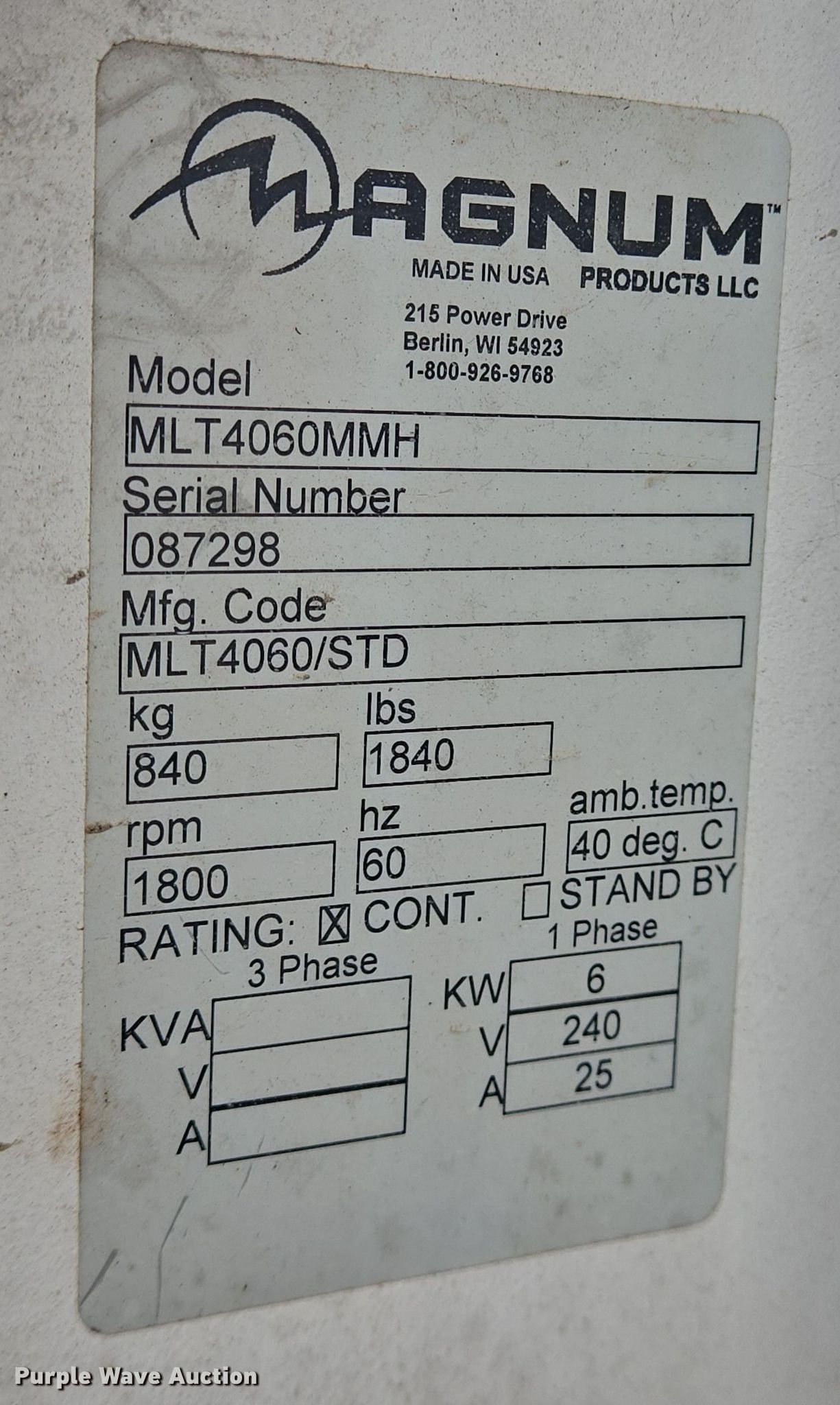 Purple Wave is selling a used Light Plant in Texas. This item is a Magnum MLT4060MMH light plant with the following: Hours: 5,282 on meter, Serial: 087298