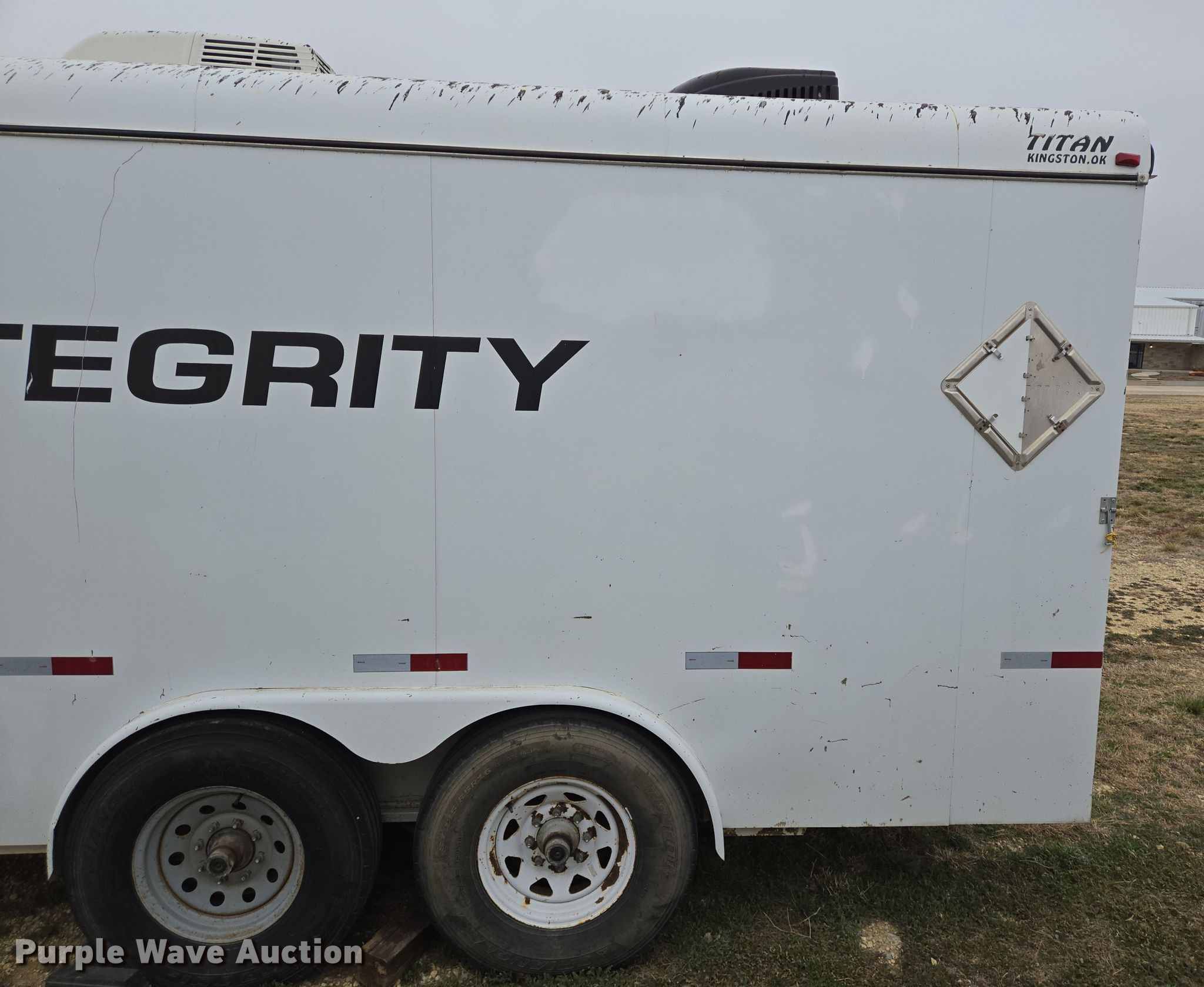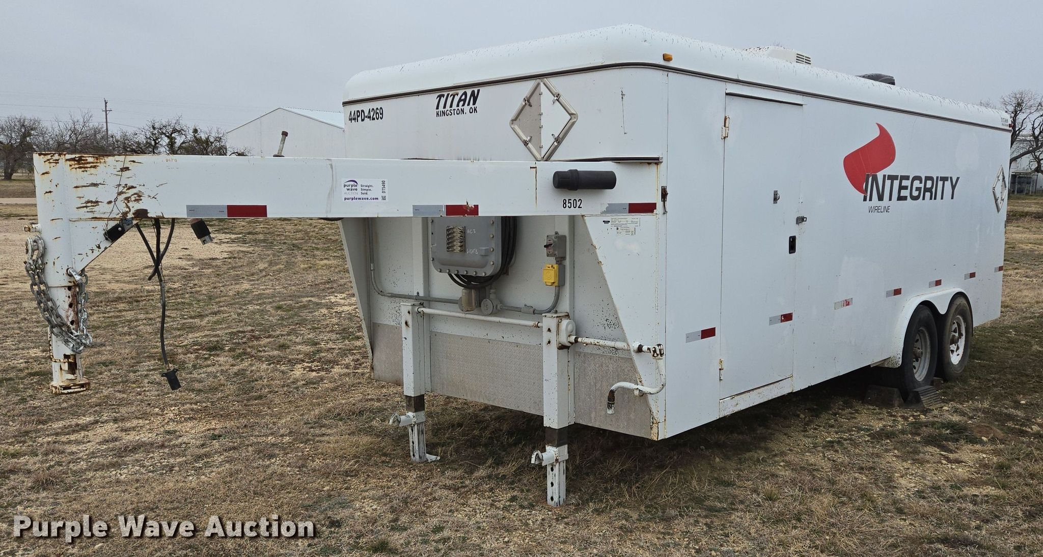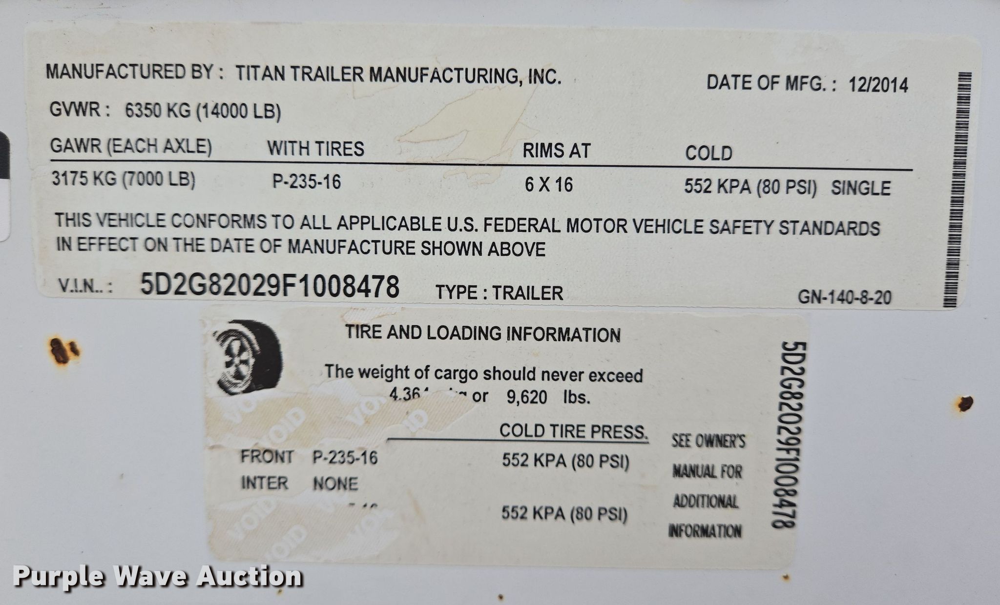 2015 Titan enclosed cargo trailer. VIN: 5D2G82029F1008478. Dimensions Overall: 28' L x 96" W, Body: 20' L x 96" W. Features Deck type: Wood. Chassis Hitch: Gooseneck, Landing gear: Dual, Brakes: Electric, Axles: Tandem, GVWR: 14,000 lbs, GAWR: 7,000 lbs. Tires Steel wheels, Size: ST235/85R16. Buyer is responsible for all aspects of loadout and removal. Texas title. Title distribution may be delayed up to 30 days from verification of funds. Abilene, TX 79601