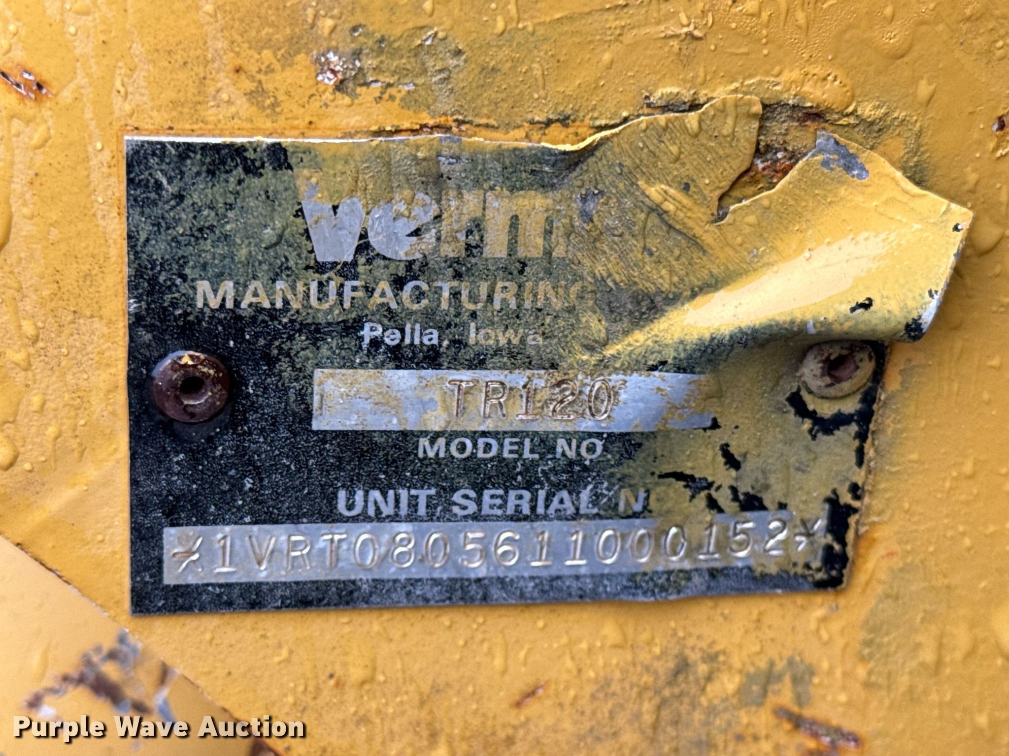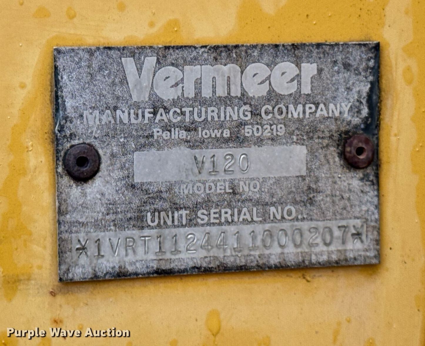 2001 Vermeer V120 trencher. Hours: 2,434 on meter, Serial: 1VRT0805611000152. Engine Cummins, Cylinders: 4, Fuel type: Diesel. Transmission Hydrostatic, Four wheel drive, Differential lock, Four wheel steer. Operators station Canopy. Features Trencher Model: TR120, Estimated dig depth: 96", Cutting width: 8", Teeth: Dirt, Hydraulic crumber, Backfill blade Width: 80". Tires Size: 38x18.00-20. Equipment City LLC. Clinton, IL 61727