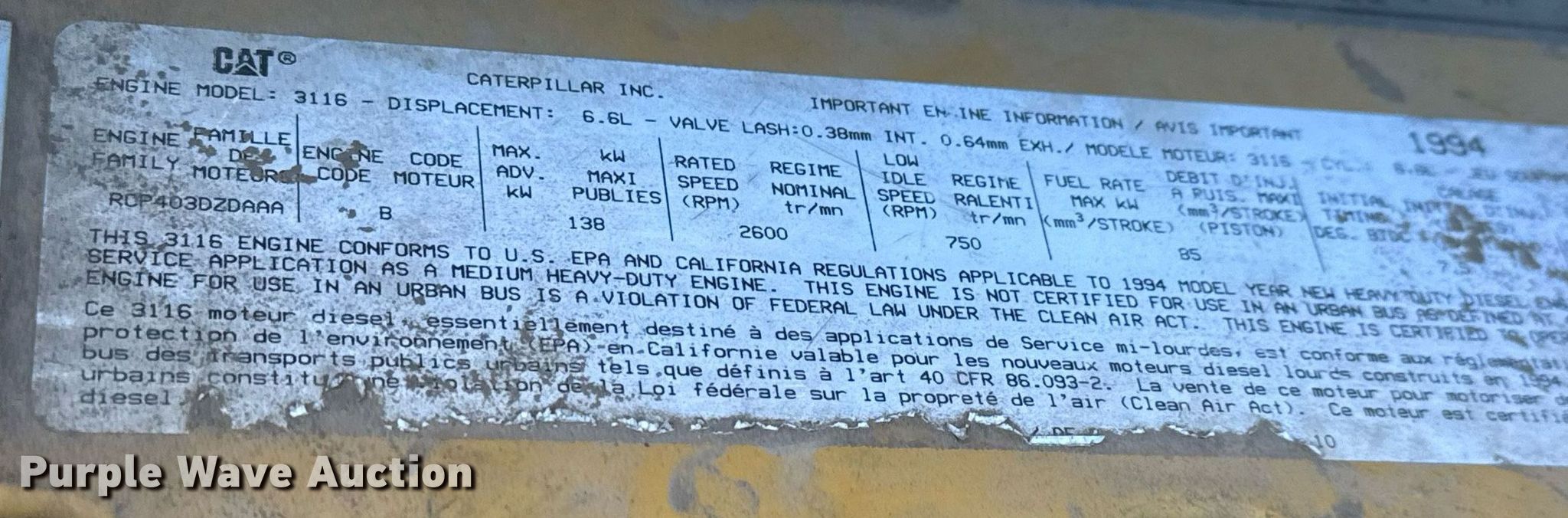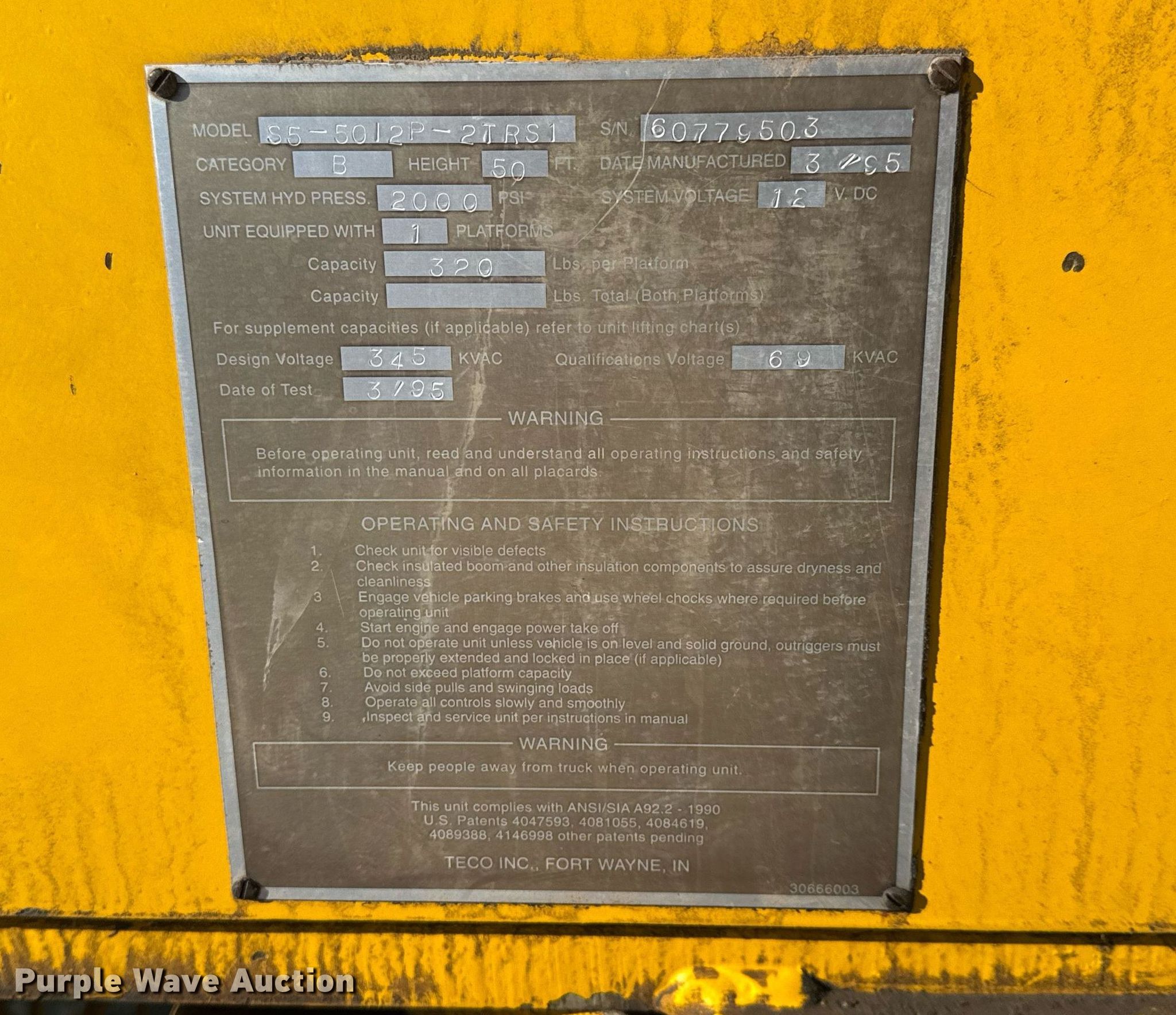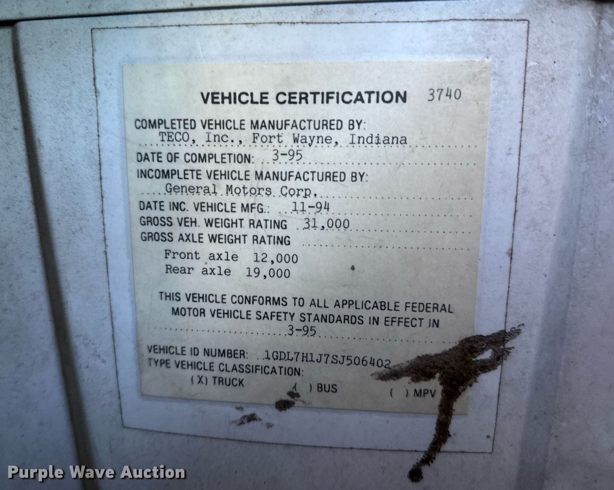 1995 GMC TopKick C6500 forestry bucket truck. Miles: 94,569 on odometer, Hours: 212 on meter Actual hours unknown, Miles: Unknown, VIN: 1GDL7H1J7SJ506402. Engine Caterpillar 3116, Serial: DGK16452, Displacement: 6.6L, Cylinders: 6, Fuel type: Diesel. Transmission Manual, Speed: 6. Chassis Axles: Single, Suspension: Spring, Brakes: Hydraulic, PTO, GVWR: 31,000 lbs. Interior Heat. Features Chip bed 11' 3" L x 92" W x 55" H, Boom 1995 Teco S5-5012P-2TRS1, Serial: 60779503, Maximum lift capacity: 320 lbs, Maximum lift height: 50', Boom type: Articulating, Man basket, Boom controls Ground, Platform/ basket.. Tires Size: 11R22.5. Notes Hour meter replaced, Dead battery, Unknown operating condition of boom and controls. Kansas title. Mileage has not been verified. Exempt will be written in the odometer disclosure on the title. Title distribution may be delayed up to 30 days from verification of funds. Alfred's Superior Tree Service / Charles Edwardson Estate. Wichita, KS 67217
