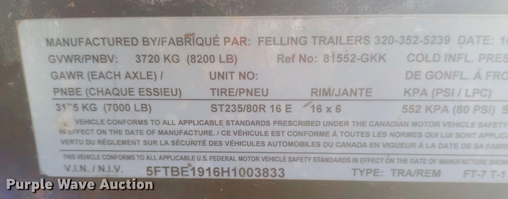 Purple Wave is selling a used Car or Utility Trailer in Kansas. This item is a 2017 Felling utility trailer with the following: VIN: 5FTBE1916H1003833