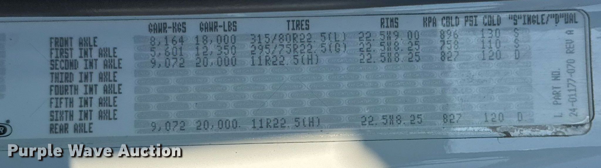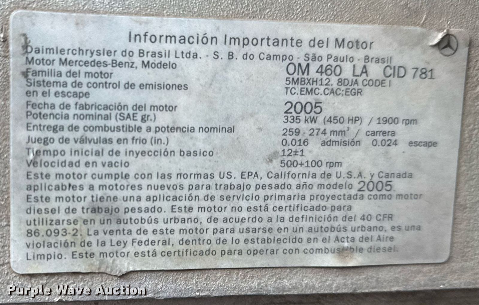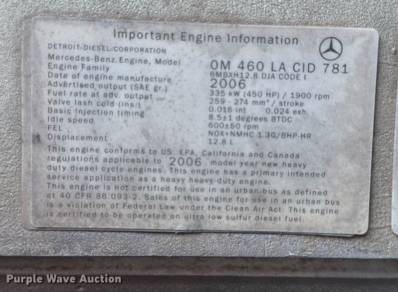 2006 Freightliner Business Class M2 dump truck. Miles: 528,392 on odometer, Engine hours: 23,847 on meter, Miles or hours may vary, unit still in use, VIN: 1FVMC5CV26HX01103. Engine Mercedes Benz OM460LA, Displacement: 12.8L, Cylinders: 6, Fuel type: Diesel, HP: 450, kW: 335, Engine brake. Transmission Eaton Fuller, Manual, Speed: 10. Chassis Double frame, Axles: Triple, Pusher axle, Differential lock: Inter-axle, Suspension: Spring over walking beam, Brakes: Air, PTO, GVWR: 68,000 lbs FAWR: 18,000 lbs, IAWR: 20,000 lbs, RAWR: 20,000 lbs, Lift axle GAWR: 12,350 lbs. Interior AC, Heat, Cruise control, Brake controller. Features Dump bed Ox Bodies, 17' L x 96" W, Side height: 47", Side board height: 10", Bed type: Steel, Barrel, Roll tarp Ram: Single, End gate: Air operated. Tires Front: 295/75R22.5, Rear: 11R22.5, Lift axle: 295/75R22.5. Notes Contents not included, Windshield chipped or cracked. Arkansas title. Title distribution may be delayed up to 30 days from verification of funds. Fort Smith, AR 72904