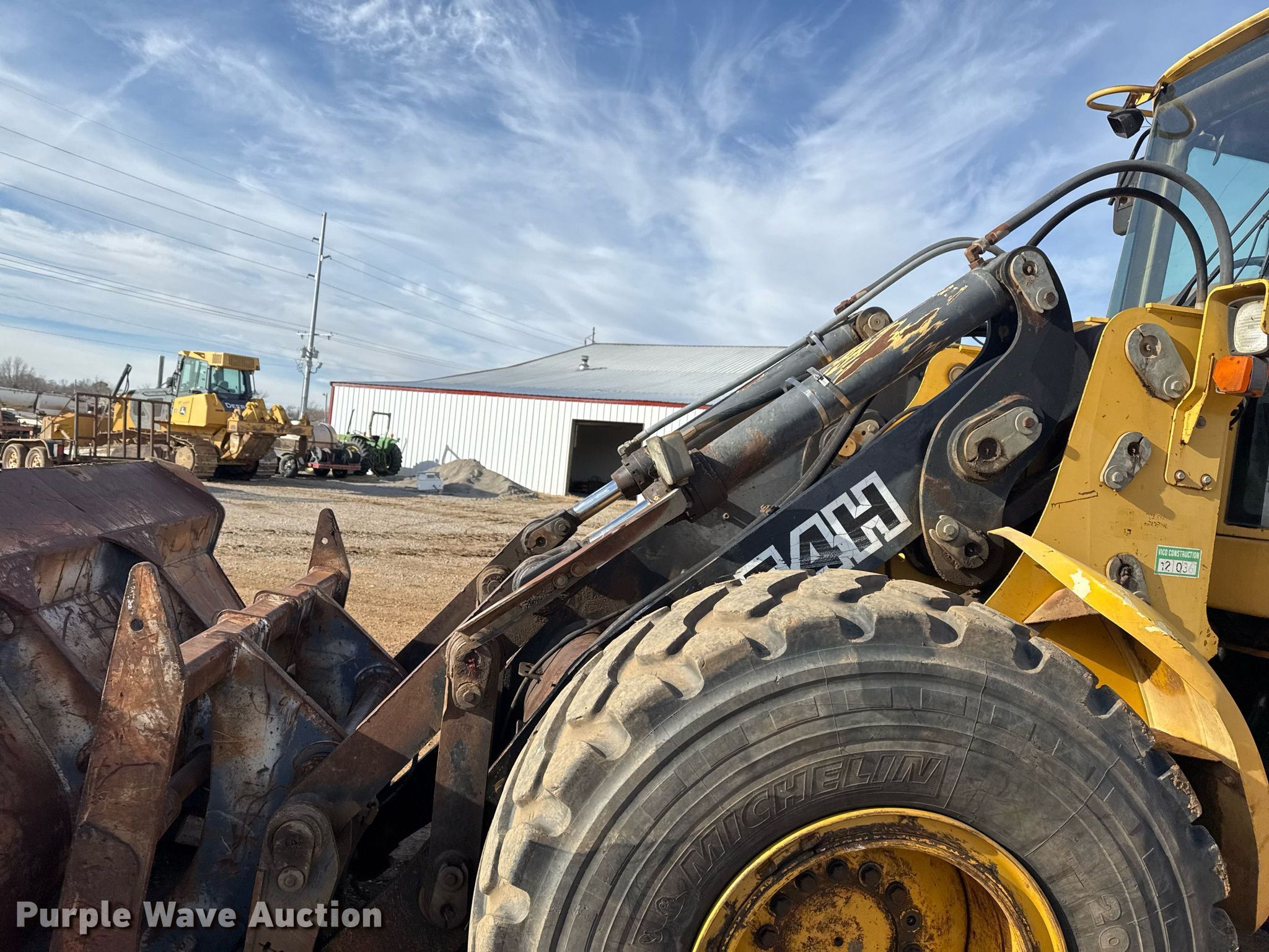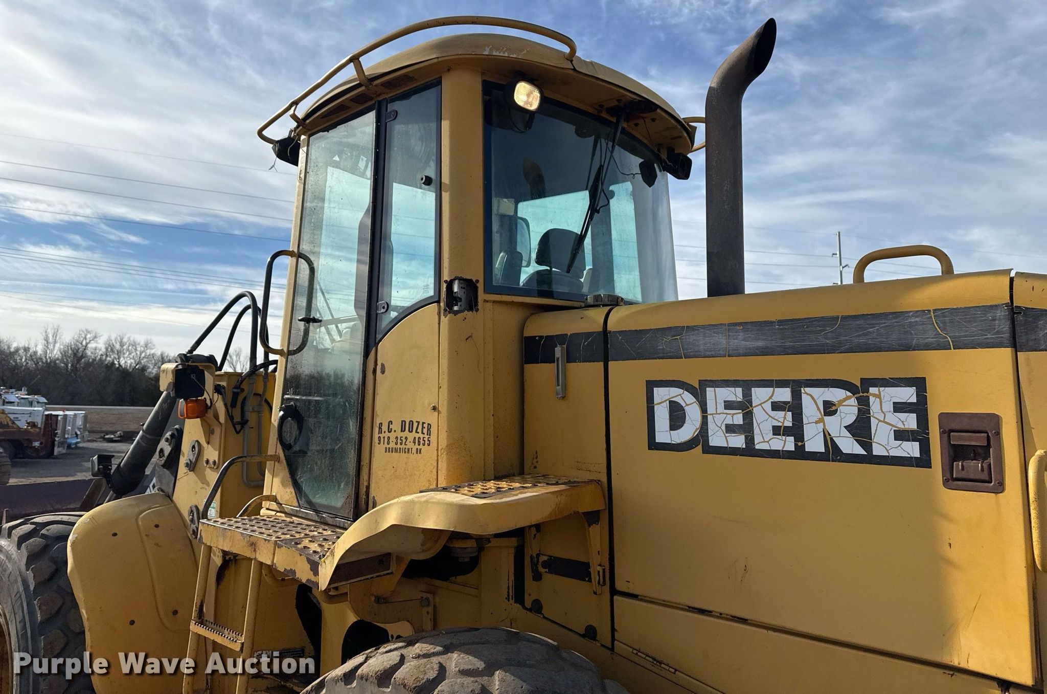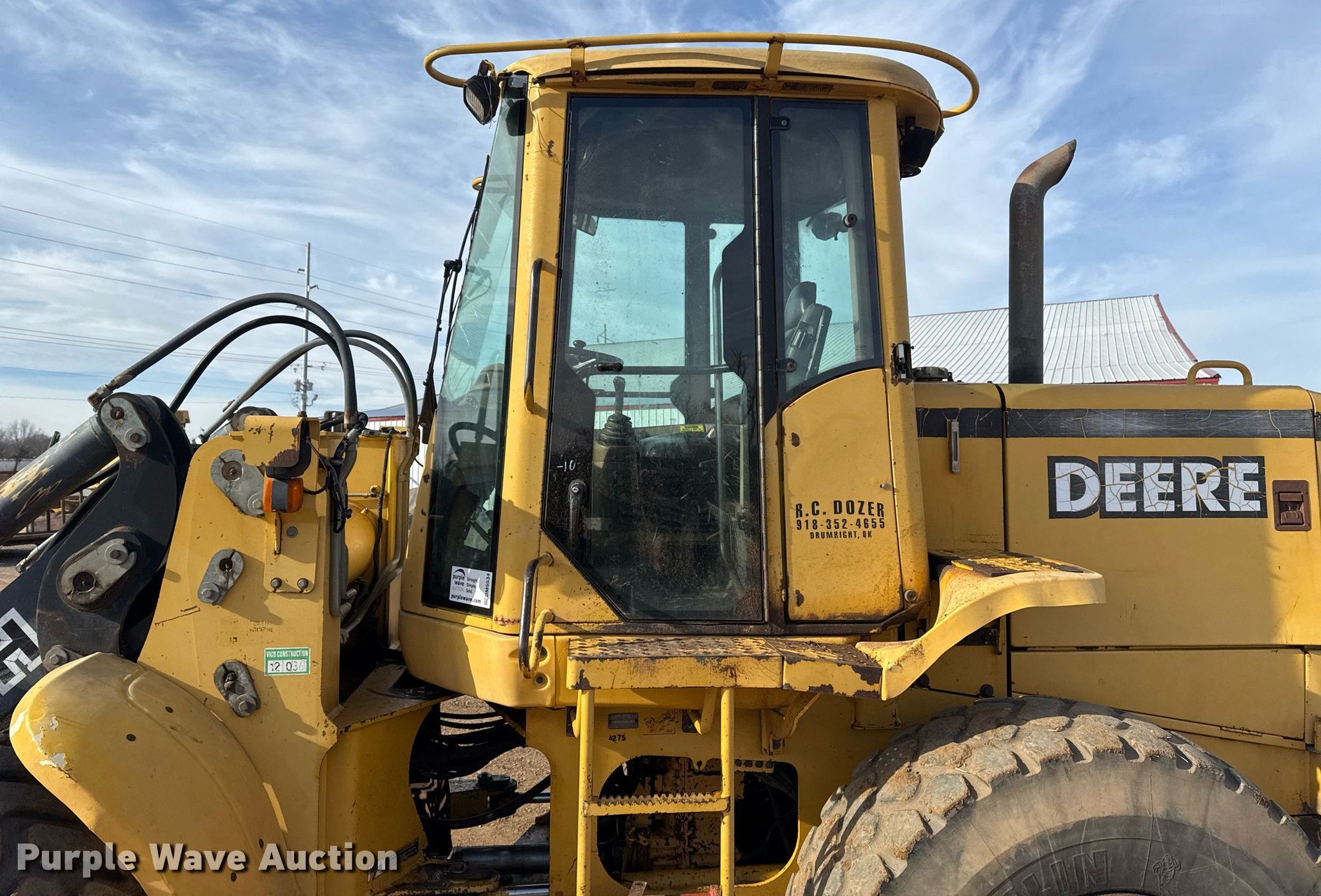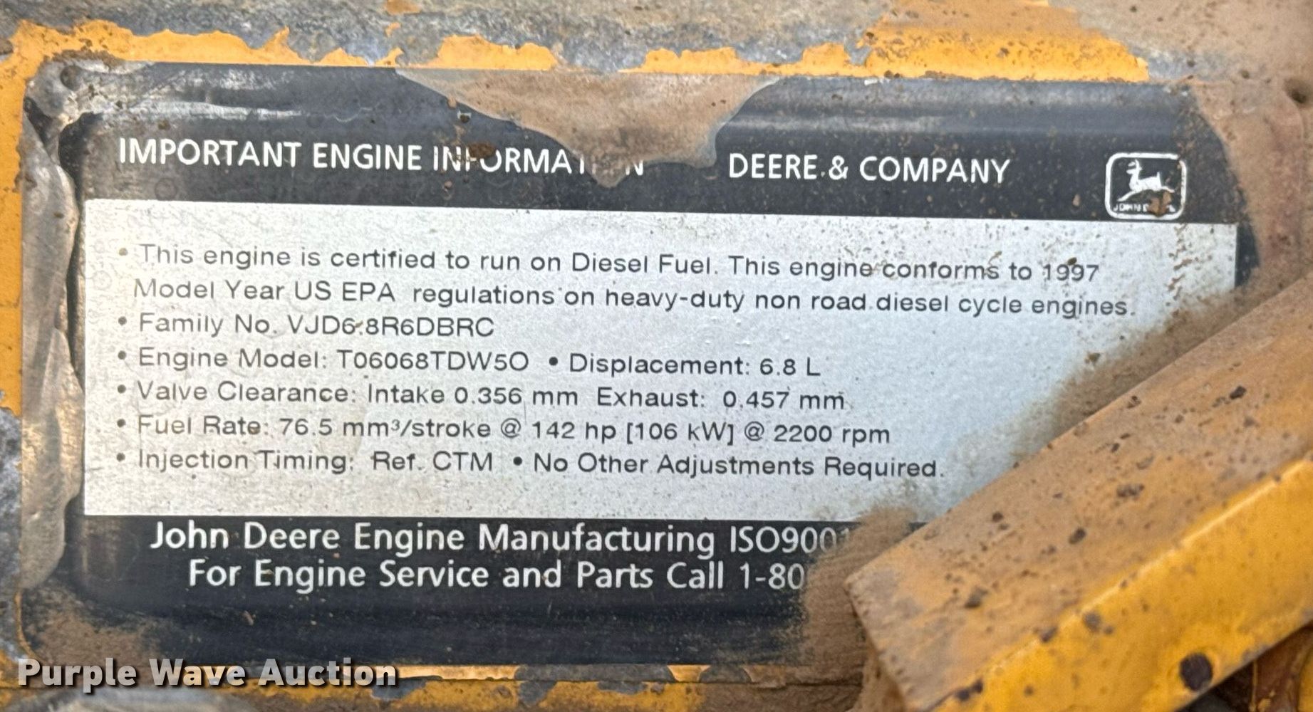 1998 John Deere TC54H wheel loader. Hours: 23,021 on meter, Serial: DWTC54H564557. Engine John Deere T06068TDW50, Displacement: 6.8L, Cylinders: 6, Fuel type: Diesel, HP: 142, kW: 106. Transmission Powershift, 4F - 4R. Chassis Differential lock. Operators station Enclosed cab, AC, Heat, Bucket controls: Joystick. Features Quick coupler: Hydraulic, Counter weights, Bucket Width: 100", Cutting edge: Bolt-on, Forks JRB, Length: 46". Tires Size: 20.5R25. Notes Glass cracked, Driver side door handle broken. Drumright, OK 74030